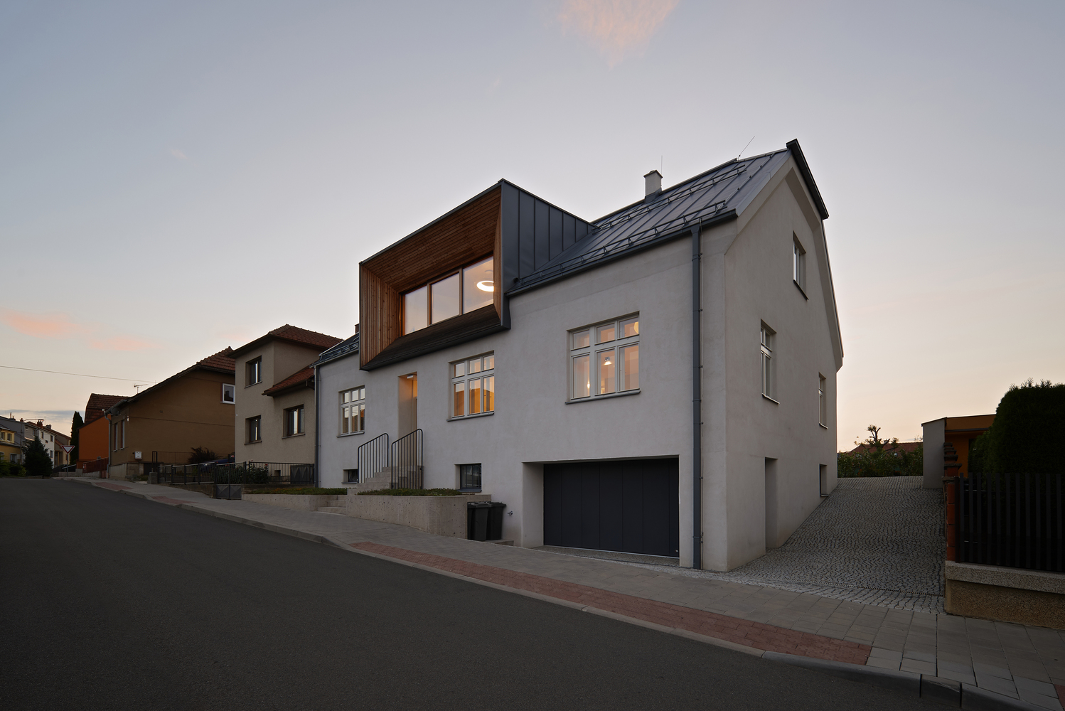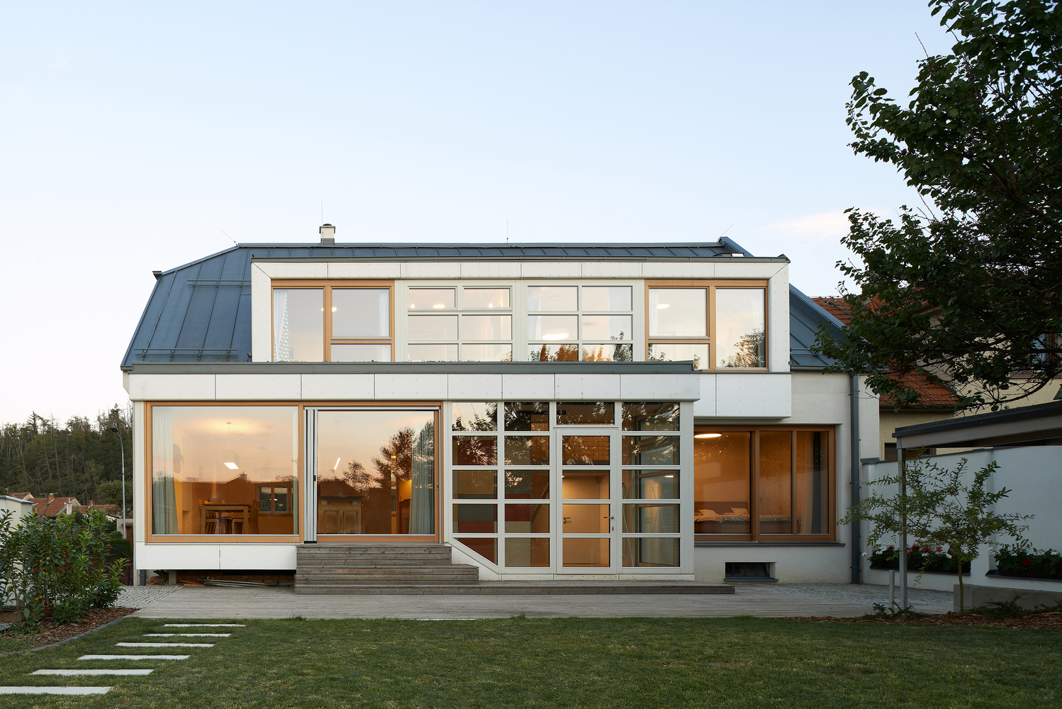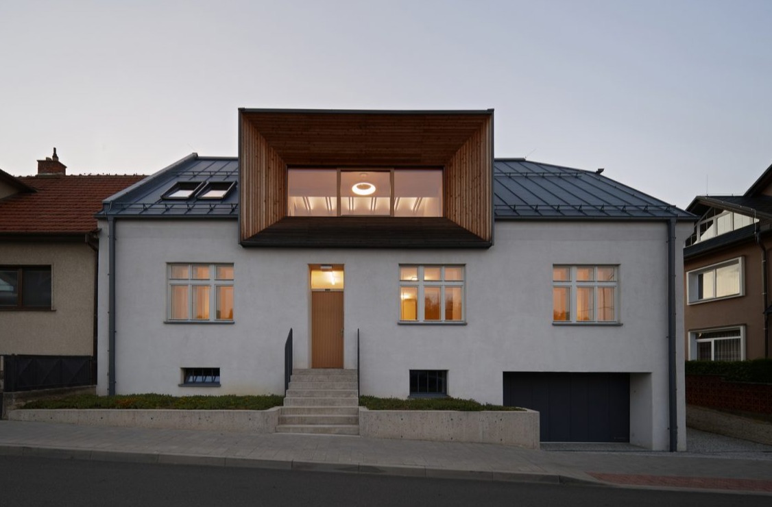Zmiana układu domu wpłynęła także na jego wygląd zewnętrzny. Choć wnętrze przeszło gruntowną metamorfozę, architektura zachowała czytelność oryginalnych brył. Otwory okienne zostały zaprojektowane na wzór oryginalnych okien, a lukarna od strony ulicy, w której mieści się pokój zabaw, stała się nową wizytówką domu. Z kolei z dziedzińca dom otworzył się maksymalnie – do budynku przylega przeszklone pomieszczenie, którego motyw powtarza się również na piętrze, tworząc spójną estetykę i harmonijną przestrzeń.