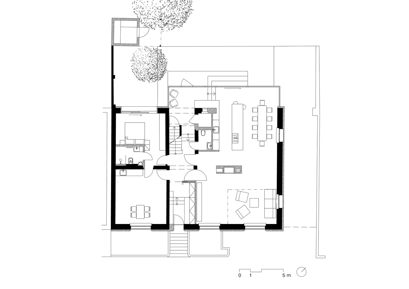 Projekt adaptacji połowy domu w zabudowie bliźniaczej z lat 50-tych miał na celu stworzenie przestrzeni idealnej dla dużej rodziny, której potrzeby mieszkaniowe znacząco różnią się od tych sprzed kilku dekad. Współczesne życie nie ogranicza się już do wyraźnie wydzielonych pomieszczeń, a głównym wymogiem mieszkańców była duża przestrzeń do wspólnego spędzania czasu. Początkowy, skomplikowany układ z wieloma identycznymi pokojami nie odpowiadał nowoczesnym wymaganiom użytkowym.
