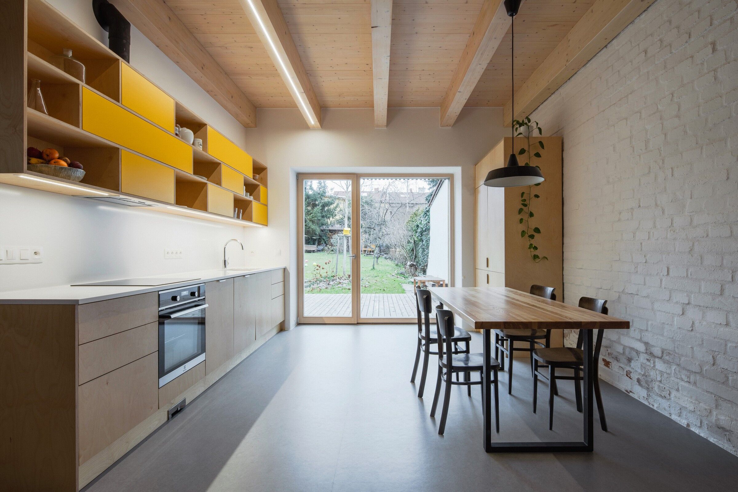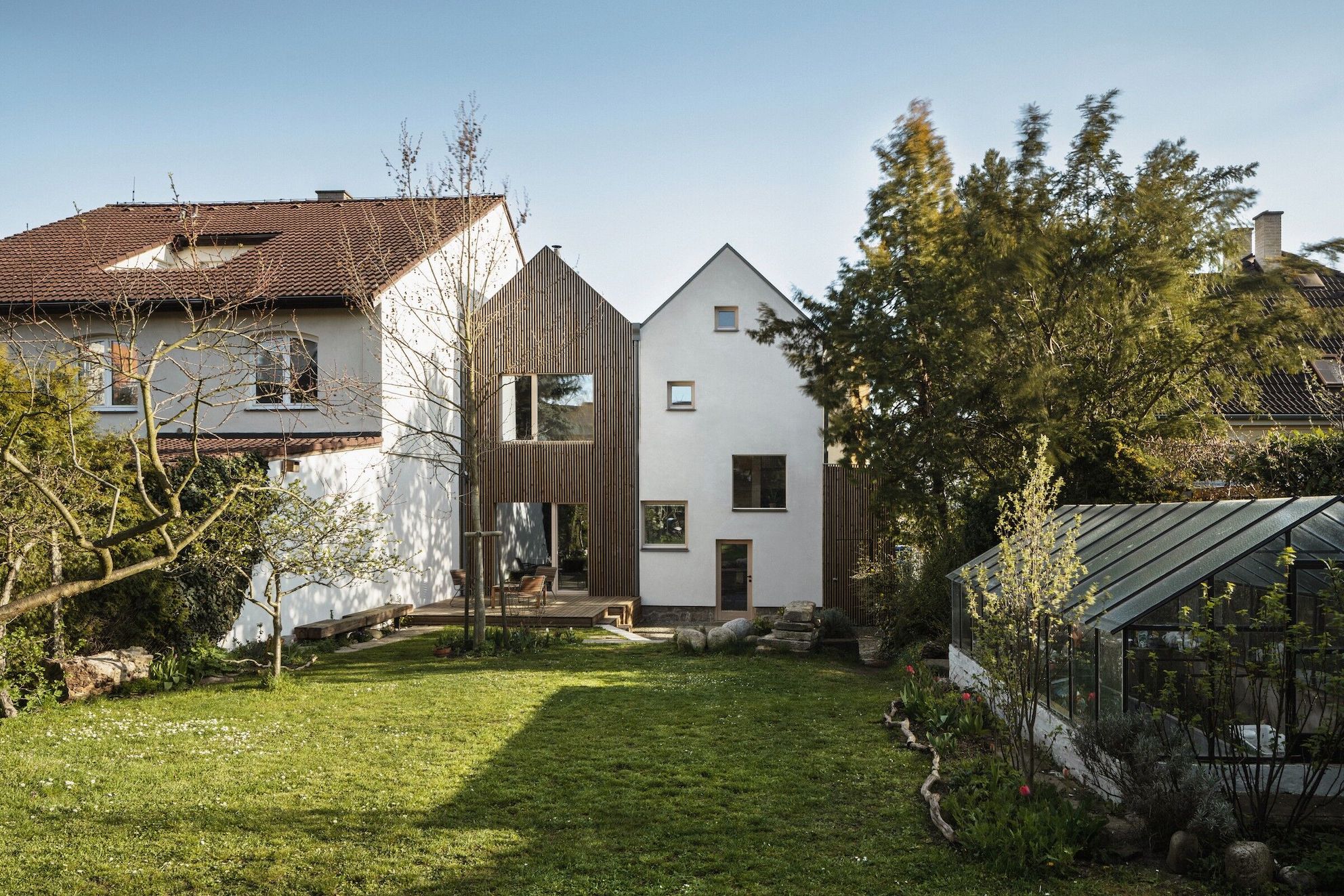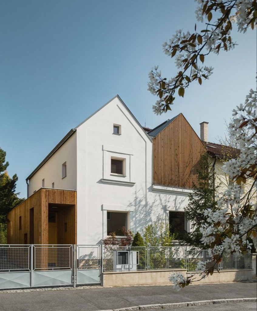 Rząd starych domów jednorodzinnych w zabudowie bliźniaczej pozostał otoczony nowoczesnymi betonowymi blokami, tworząc wyjątkową prywatną wyspę ogrodów w sercu dzielnicy mieszkalnej w Pilźnie. Większość z tych domów przeszła renowację, a także została powiększona o późniejsze dobudówki, które zmieniły pierwotną skalę tej dzielnicy. Proponowany remont miał na celu nie tylko spełnienie wymagań młodej rodziny, ale także dodanie nowej kubatury, która stworzy nową, współczesną warstwę w istniejącym domu.