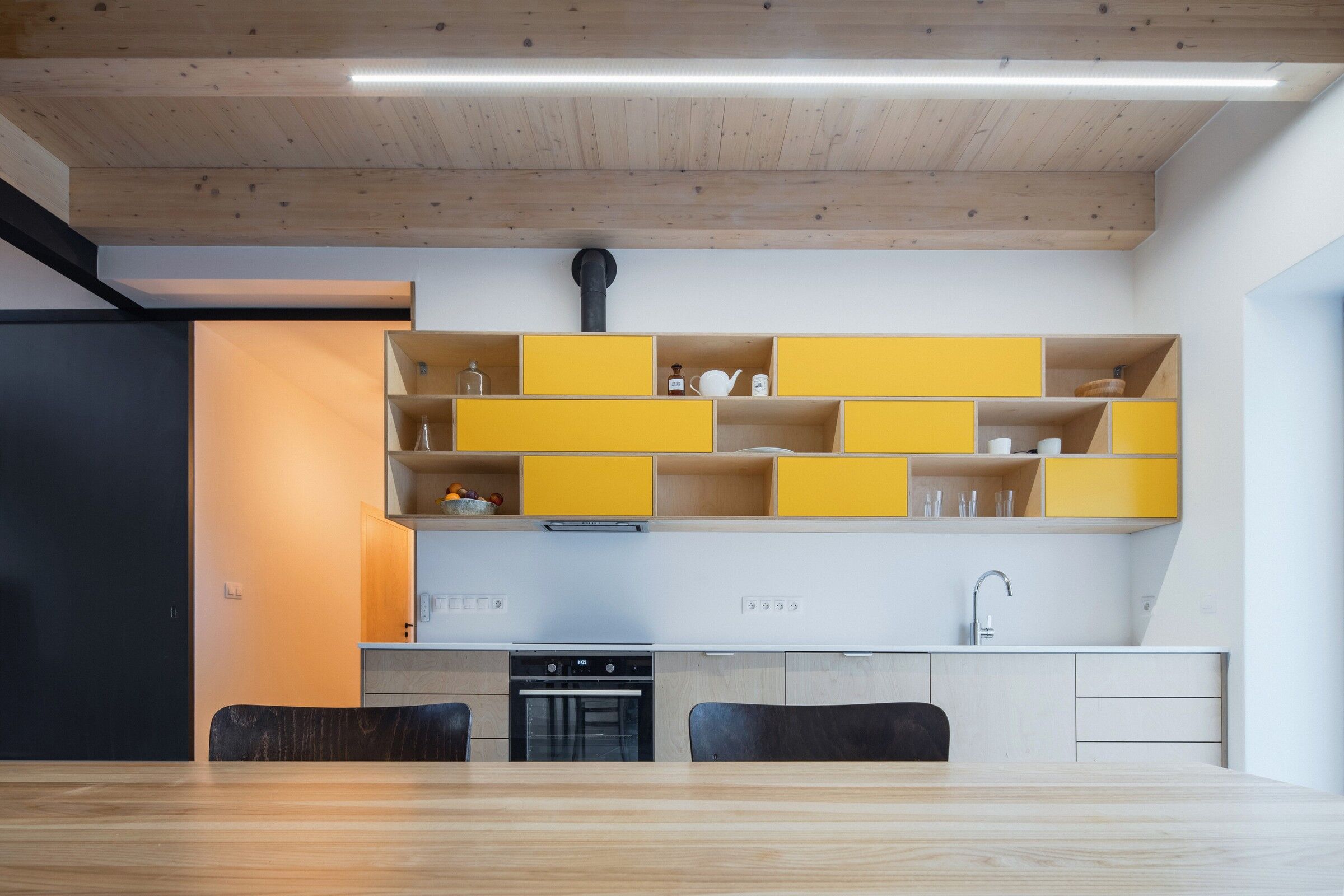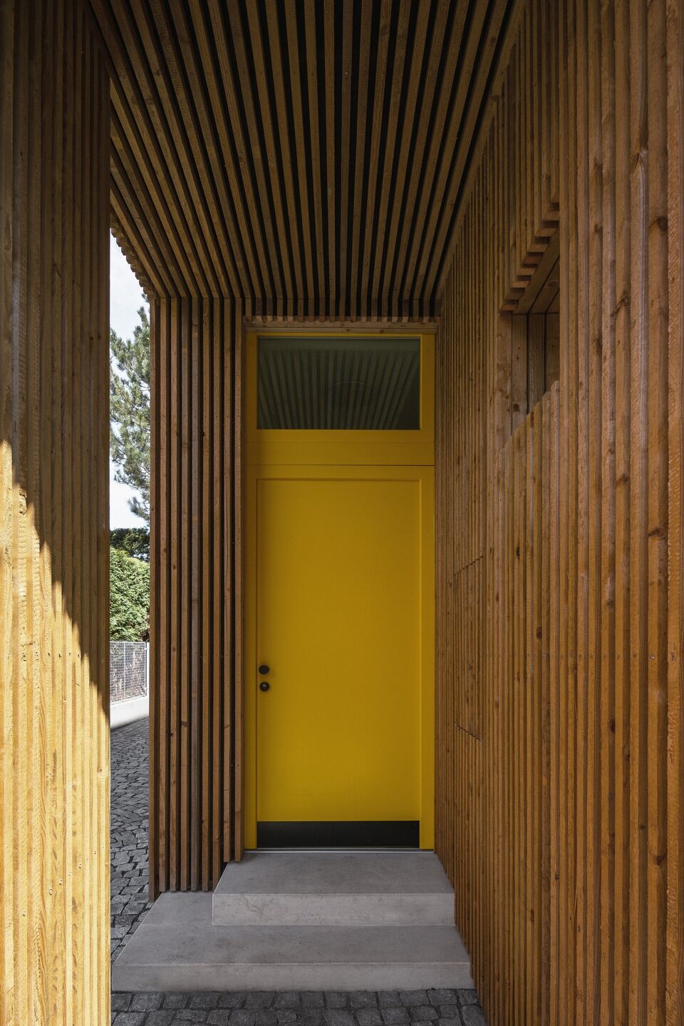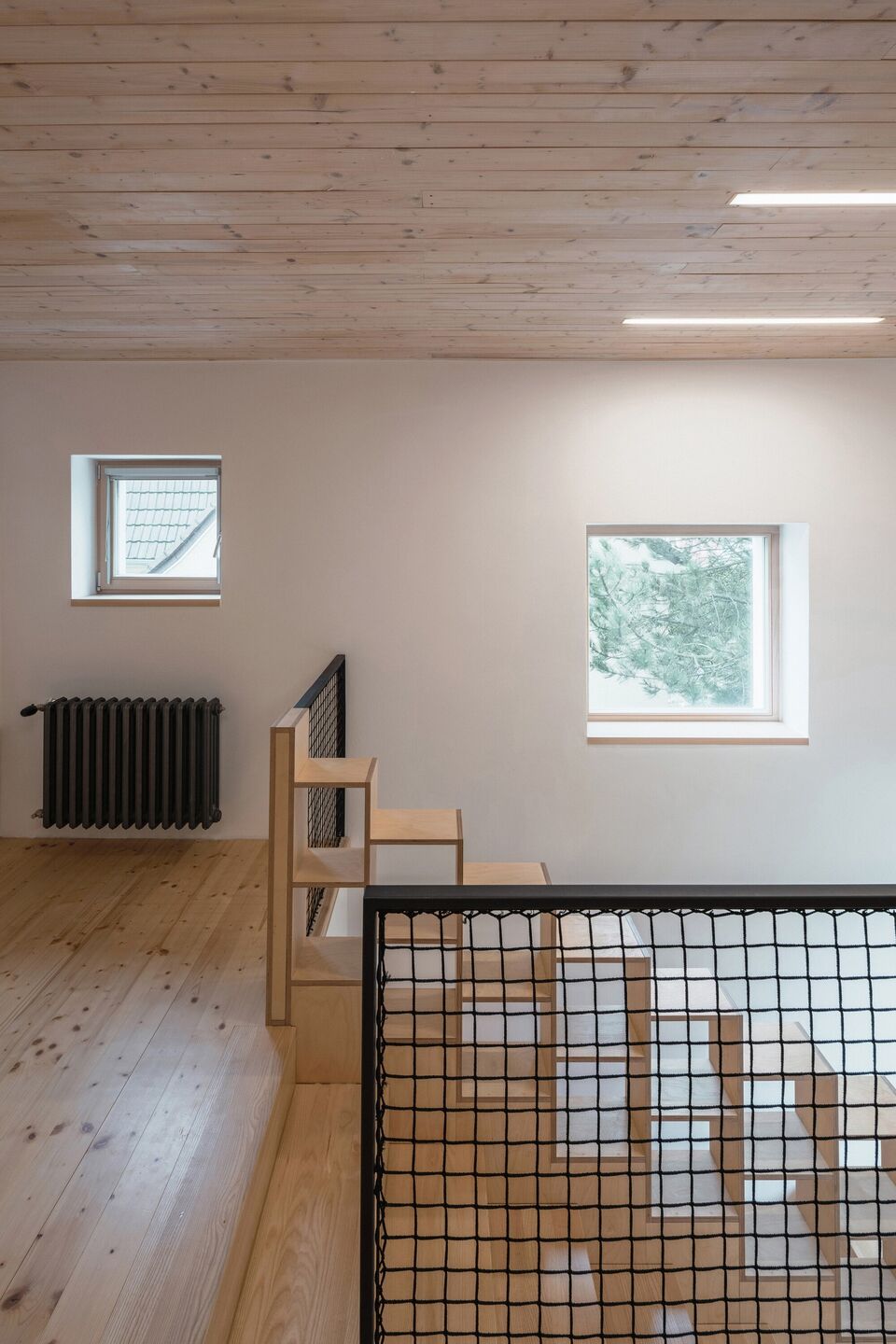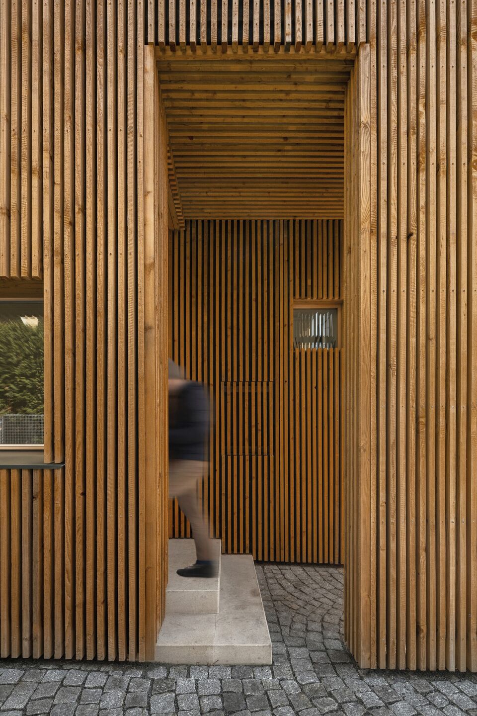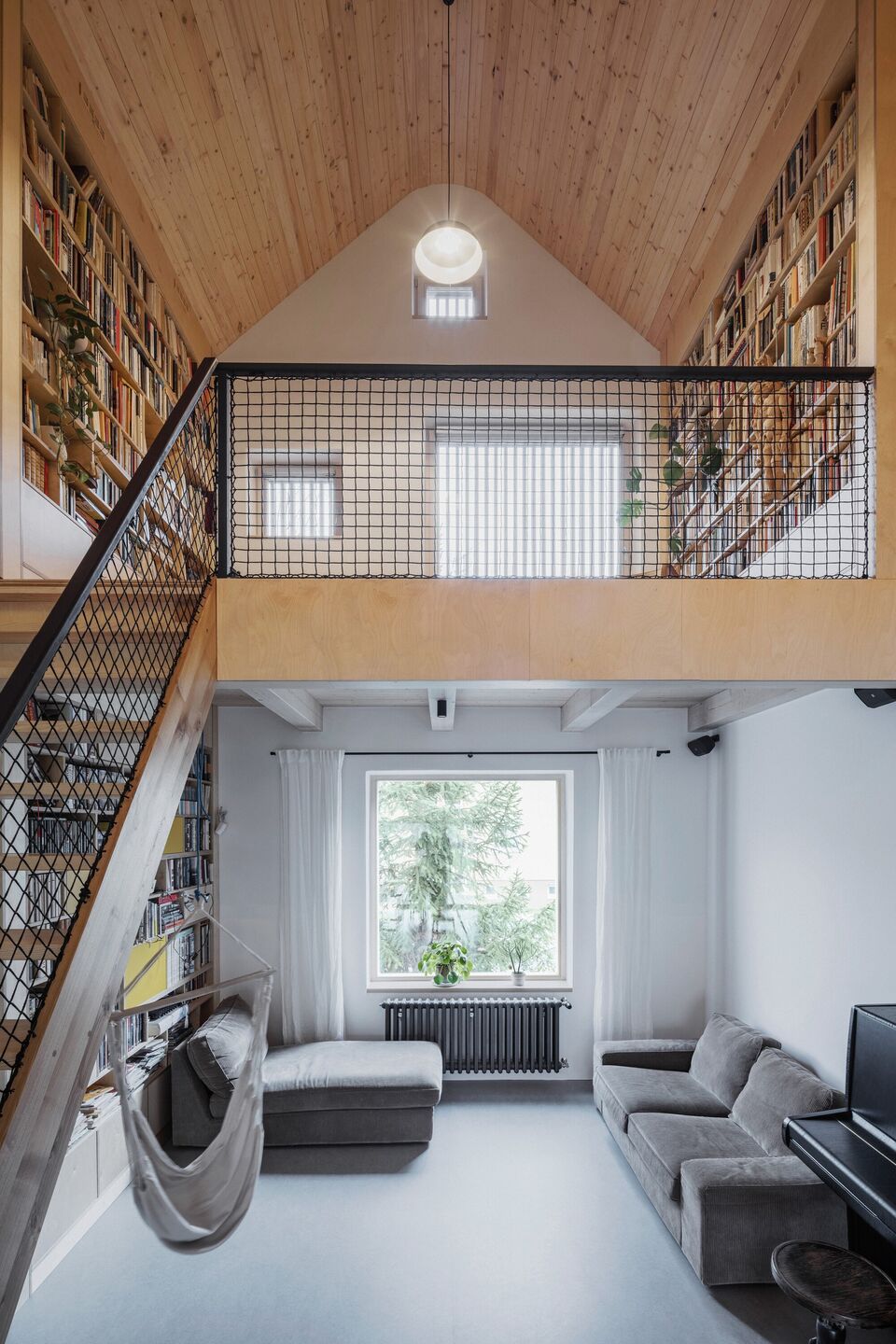 Zastosowanie dwóch archetypowych dachów dwuspadowych nadaje fasadzie ciekawego, choć skromnego charakteru, który współczesnie współgra z tradycją. Taki zabieg pozwolił na uzyskanie obszernych wnętrz, z różnorodnymi poziomami podłóg, drewnianymi antresolami oraz otwartą bryłą dachu. Okna osłonięte drewnianymi listwami zapewniają maksymalne doświetlenie wnętrz, jednocześnie zapewniając prywatność, co było kluczowym elementem projektu.