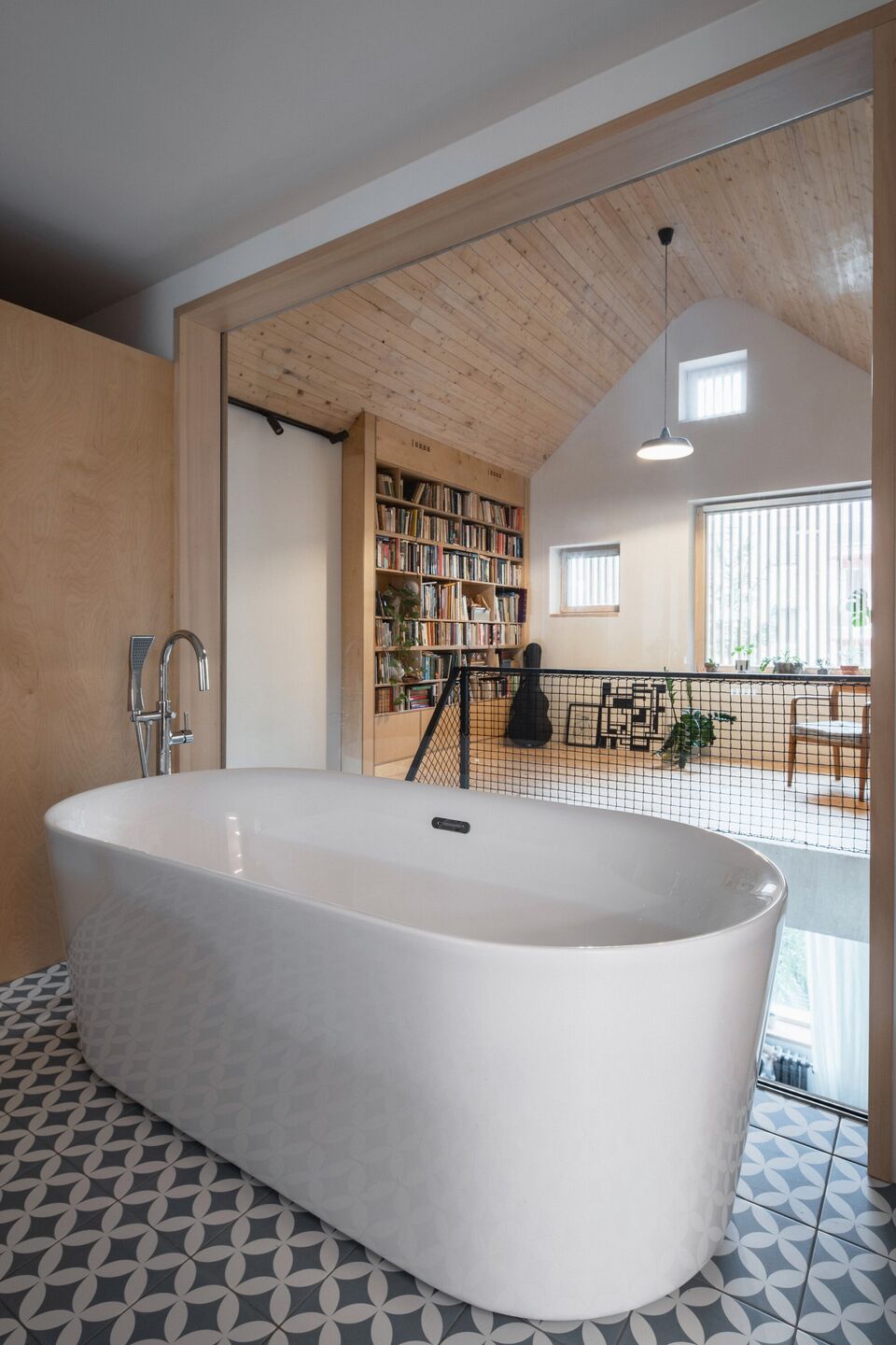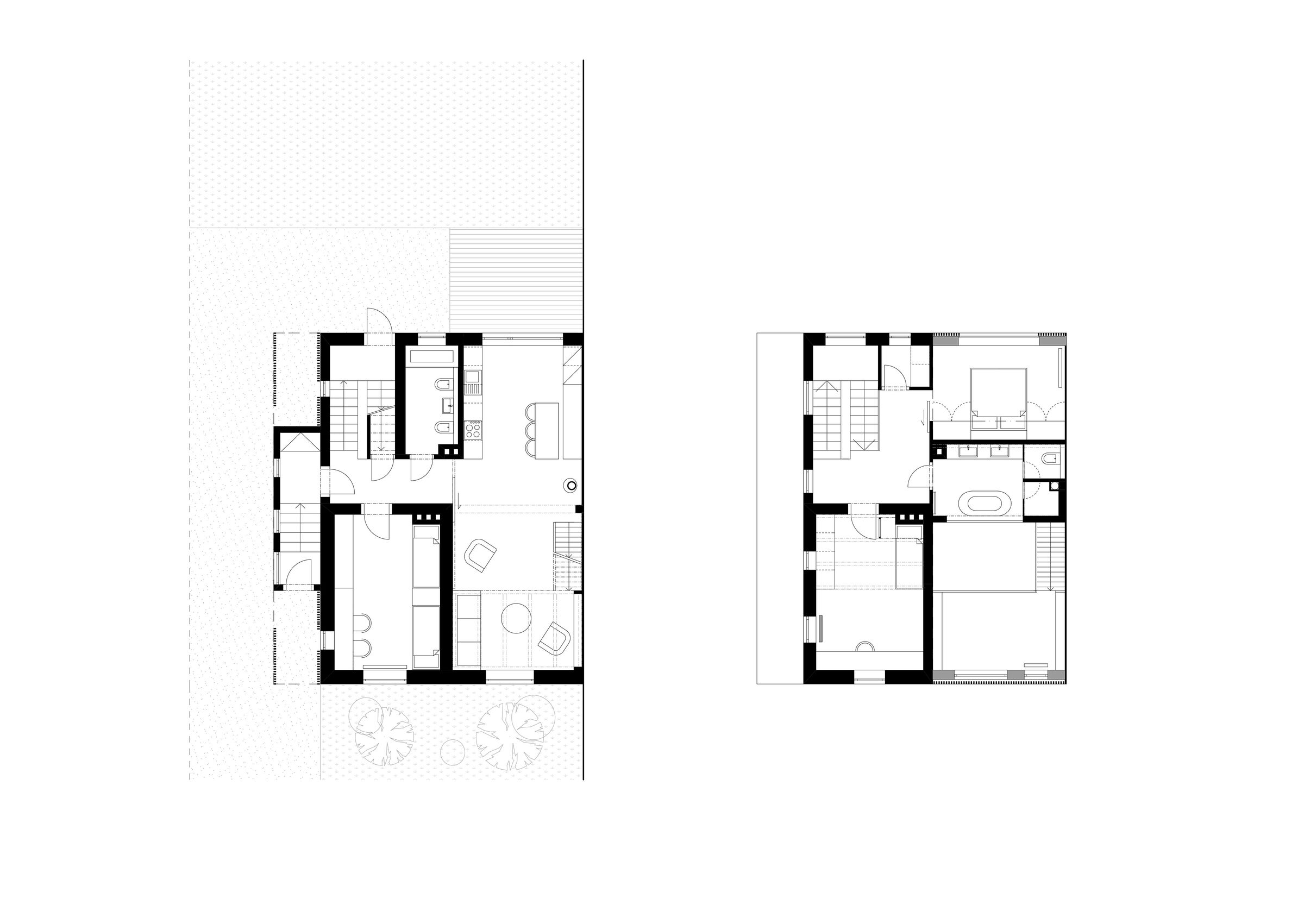 Parter budynku składa się z pokoju dziecięcego, łazienki oraz dużego salonu, który łączy dwa pokoje, tworząc przestronny ogród wewnętrzny. Otwartość na pierwsze piętro, które obejmuje wbudowaną czytelnię, pozwala na doświetlenie łazienki znajdującej się wyżej. Na piętrze znajduje się drugi pokój dziecięcy oraz główna sypialnia z łazienką, co zapewnia wygodę i intymność.