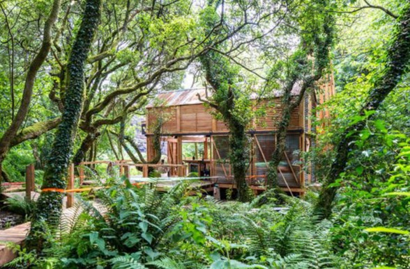 W głębi lasu w angielskiej Kornwalii kryje się prowizoryczna chata „Kudhva”, czyli „kryjówka”, inspirowana dawnymi domkami na drzewach w kamieniołomach północnego wybrzeża. Projekt „Duńskiej chaty” to przykład innowacyjnej architektury w regionie, w której dom ukryty jest pośród drzew, z tarasem przerastającym konstrukcję na drewnianych palach i strumykiem wijącym się pod budynkiem. Całość tworzy wyjątkową integrację wnętrza z naturą, zapewniając prywatność i kontakt z otaczającym krajobrazem.