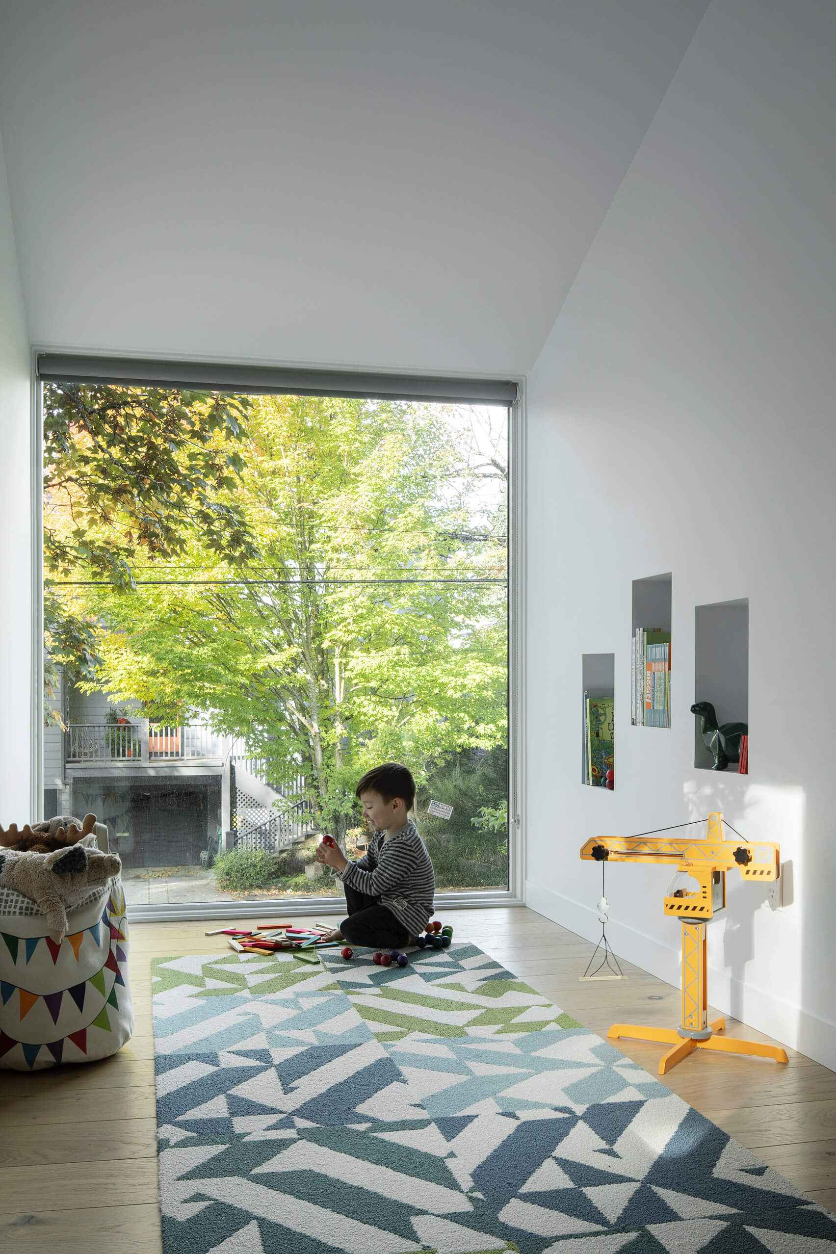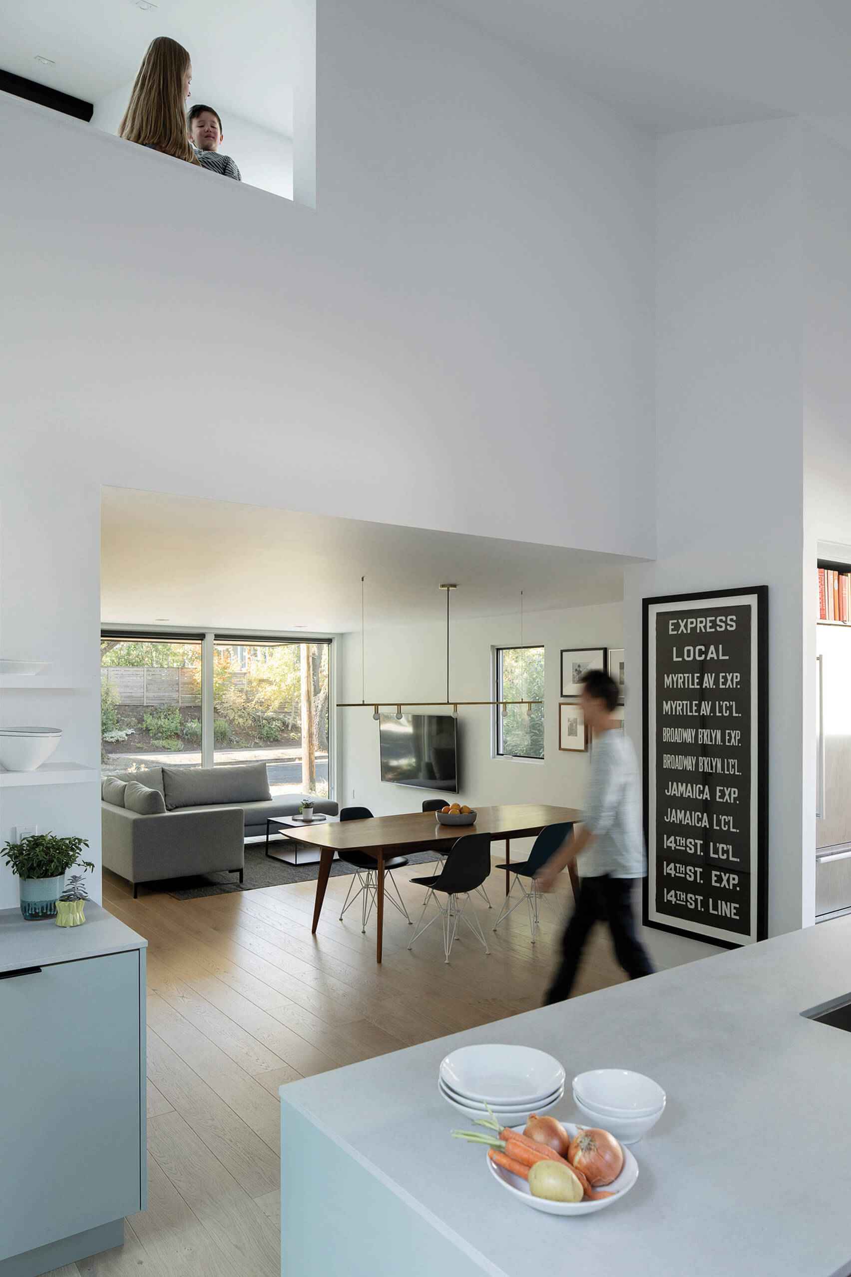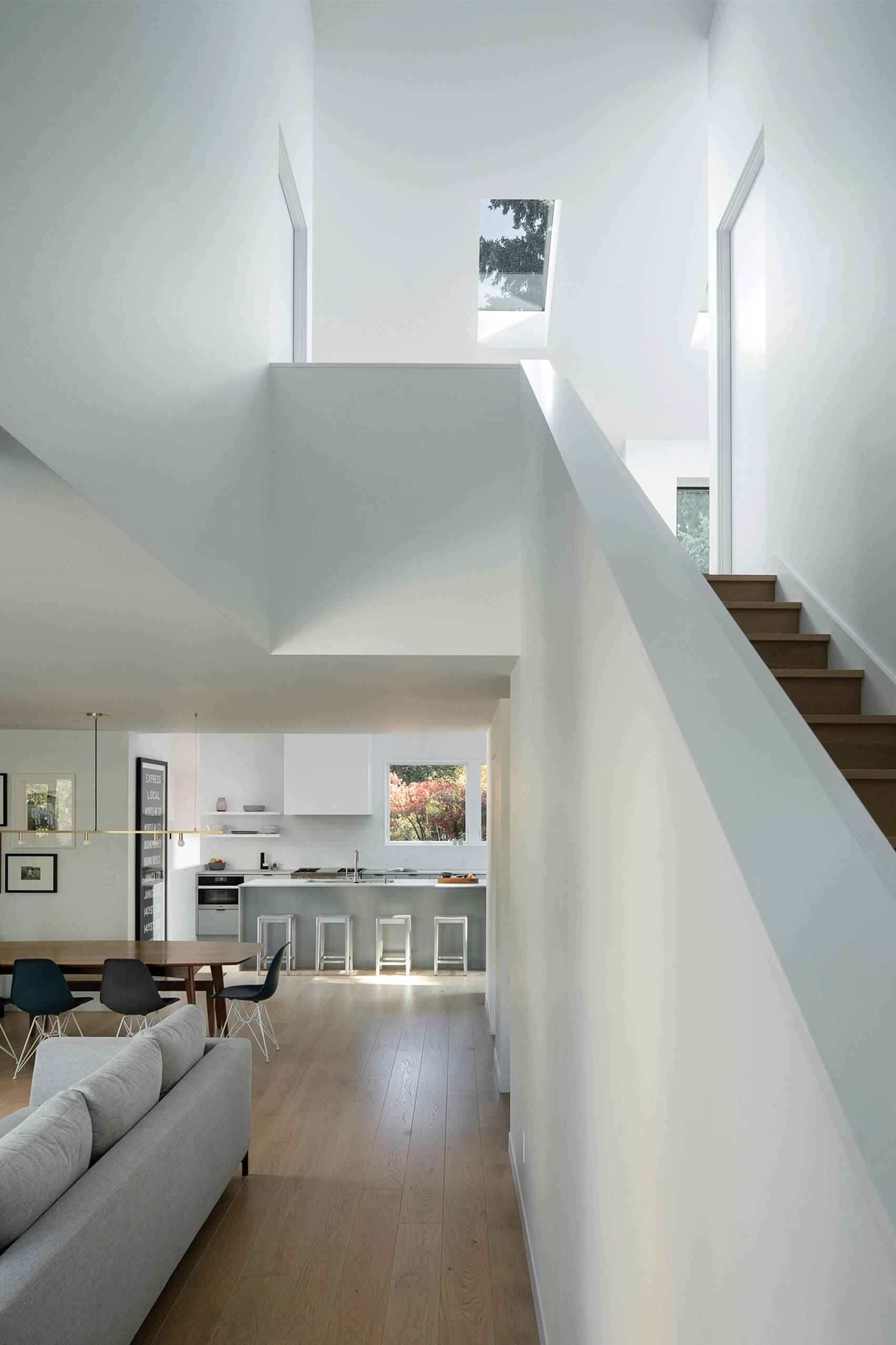 Wnętrza „House on 36th” to połączenie minimalizmu, funkcjonalności i światła. Główną przestrzeń dzienną zaprojektowano w otwartym planie – kuchnia, salon i jadalnia tworzą jedno centrum życia rodzinnego, w naturalny sposób powiązane z otoczeniem i górnym piętrem poprzez szerokie schody. Wnętrze utrzymane jest w neutralnej palecie kolorystycznej z dominującą bielą, co pozwala naturalnemu światłu przenikać przez przestrzeń i eksponować widoki za oknami. Sypialnie dzieci mieszczą się za przytulnymi, mansardowymi ścianami, tworząc ciche wnęki do wypoczynku, natomiast główna sypialnia znajduje się na parterze. Projekt jest przykładem świadomego, nowoczesnego podejścia do modernizacji domu, który łączy architektoniczną odwagę z codzienną funkcjonalnością.