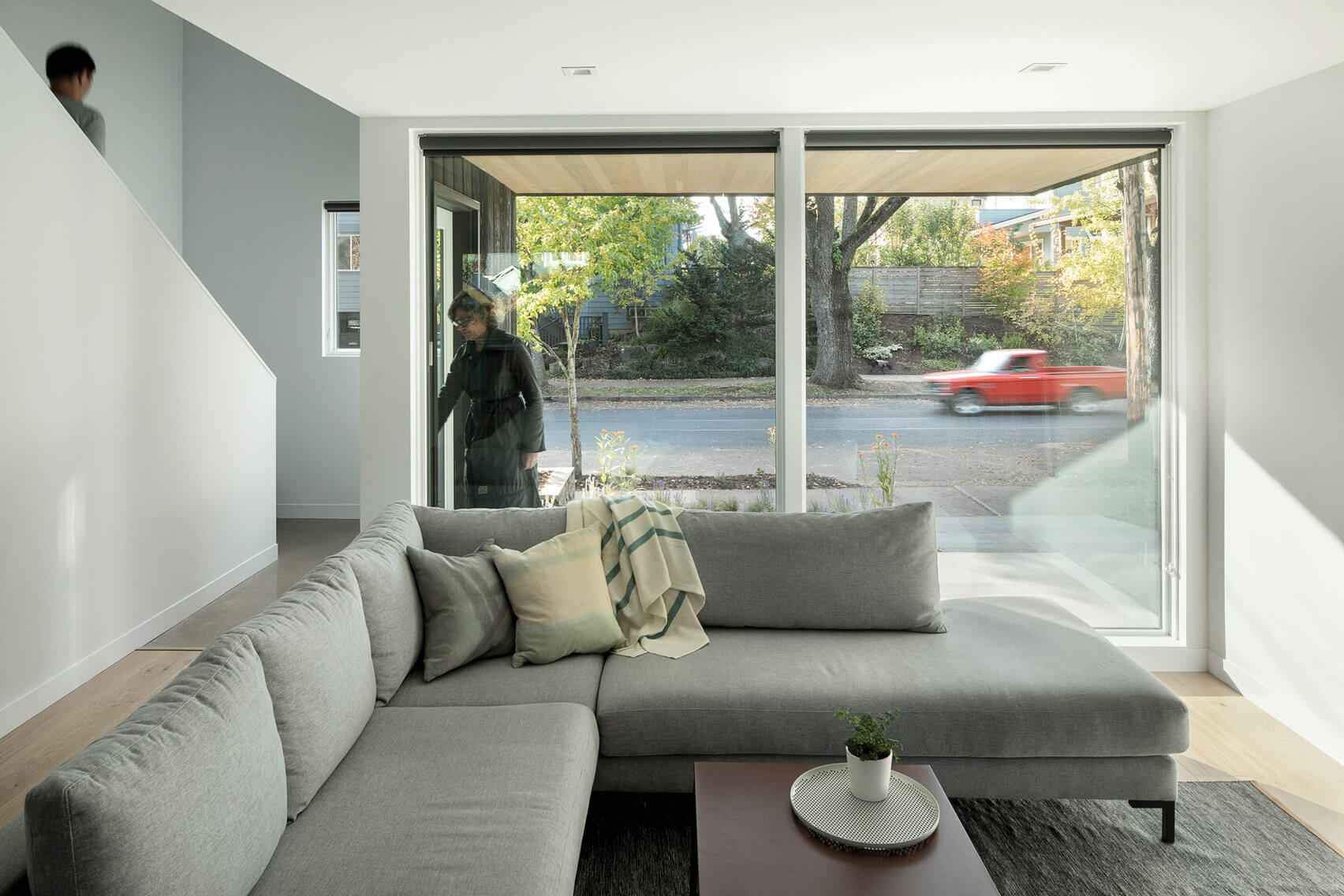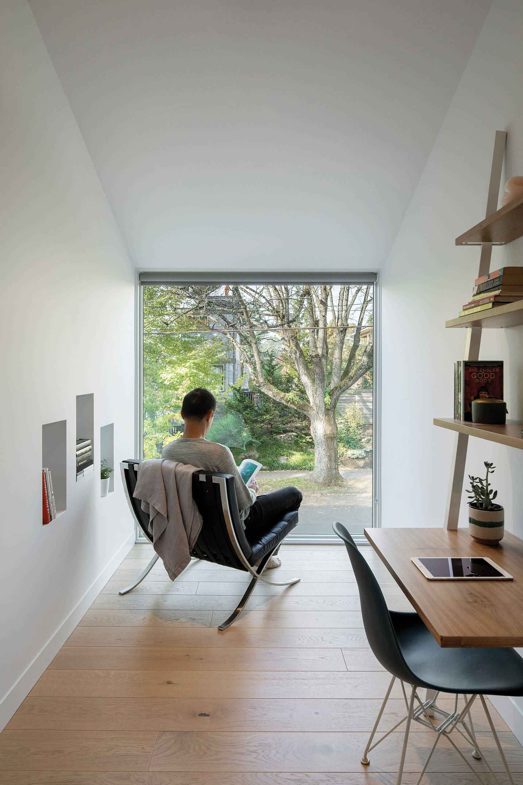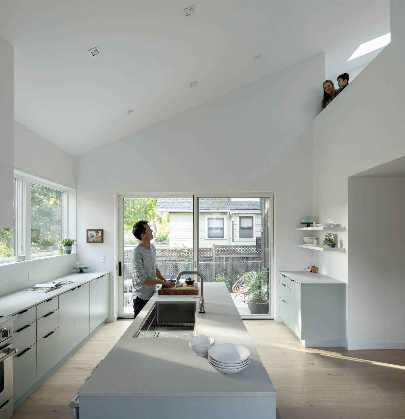 Wnętrza „House on 36th” to połączenie minimalizmu, funkcjonalności i światła. Główną przestrzeń dzienną zaprojektowano w otwartym planie – kuchnia, salon i jadalnia tworzą jedno centrum życia rodzinnego, w naturalny sposób powiązane z otoczeniem i górnym piętrem poprzez szerokie schody. Wnętrze utrzymane jest w neutralnej palecie kolorystycznej z dominującą bielą, co pozwala naturalnemu światłu przenikać przez przestrzeń i eksponować widoki za oknami. Sypialnie dzieci mieszczą się za przytulnymi, mansardowymi ścianami, tworząc ciche wnęki do wypoczynku, natomiast główna sypialnia znajduje się na parterze. Projekt jest przykładem świadomego, nowoczesnego podejścia do modernizacji domu, który łączy architektoniczną odwagę z codzienną funkcjonalnością.