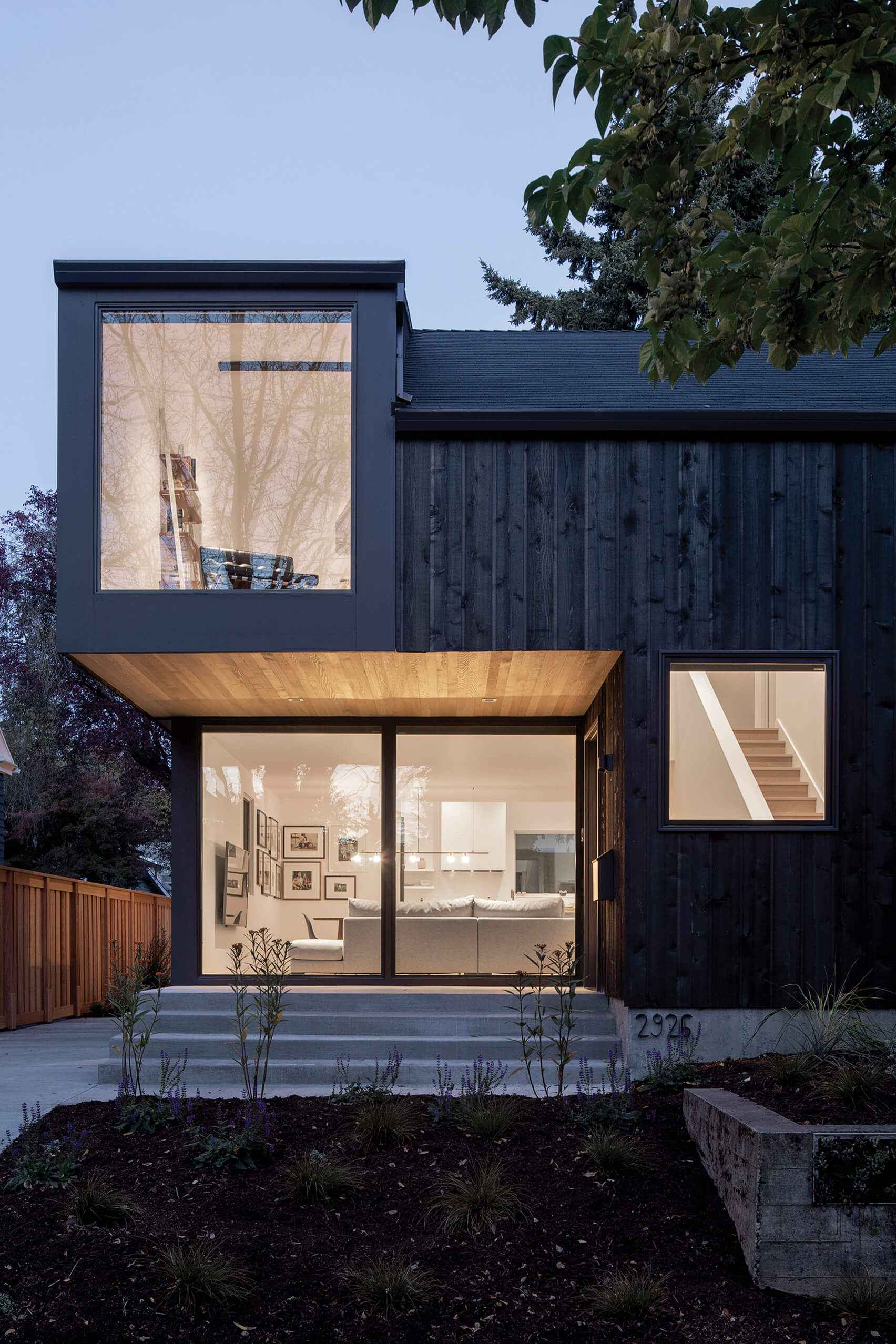 Z zewnątrz dom pokryty jest bejcowanym na czarno drewnem, które nadaje mu nowoczesny, posągowy wygląd, a jednocześnie podkreśla naturalne faktury materiału. Drewno zestawiono z dużymi przeszkleniami i metalowymi ramami okien, tworząc spójną paletę wizualną. Ciemna elewacja pozwala na subtelne wydobycie głębi bryły i akcentowanie przeszkleń, zwłaszcza nocą, gdy wnętrza zostają oświetlone. Wystający gzyms piętra tworzy zadaszoną werandę nad wejściem, a nowy układ funkcjonalny obejmuje trzy sypialnie, dwie łazienki, otwartą kuchnię, przestronny salon oraz przestrzenie wypoczynkowe i użytkowe. Wszystkie te rozwiązania zwiększają komfort codziennego życia, nie rezygnując z kompaktowej formy zabudowy.