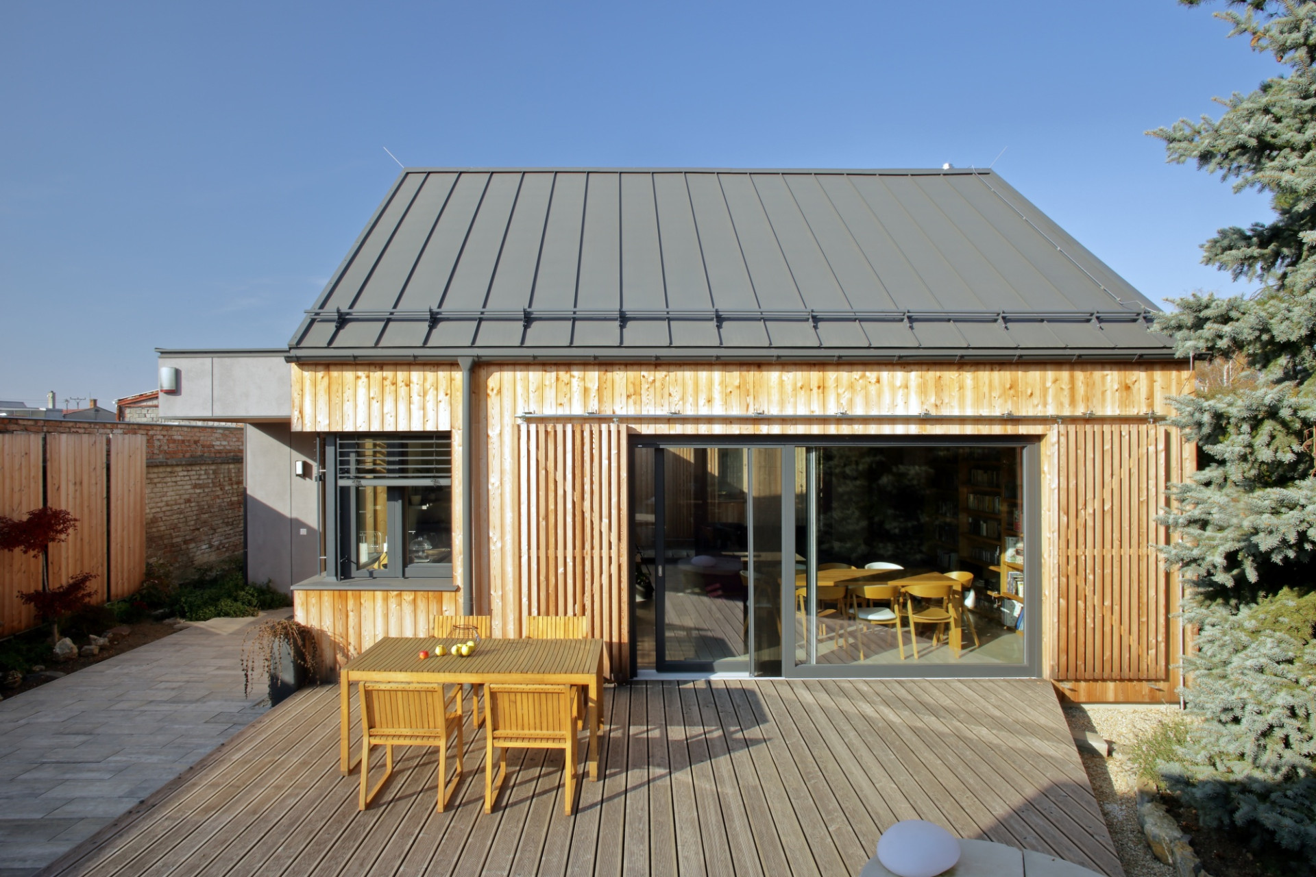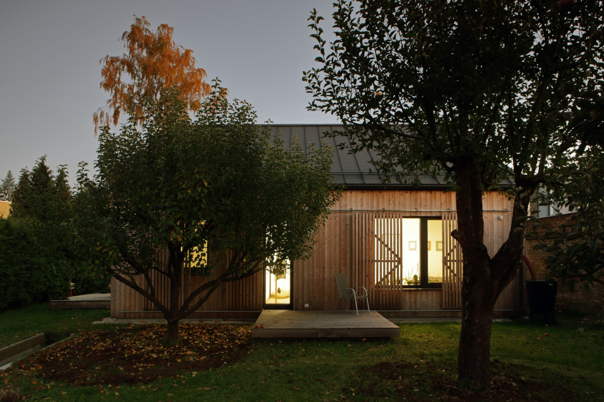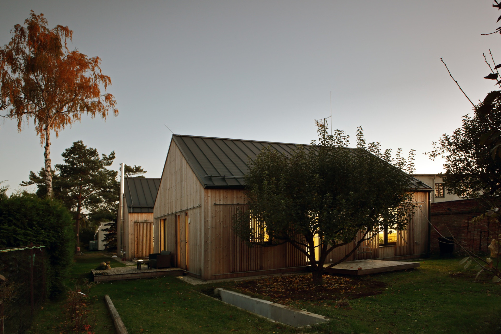 Na Hané, w krajobrazie podmiejskiej zabudowy jednorodzinnej, powstał dom zaprojektowany przez No-A Architekti, który świadomie odwraca się od ruchliwej drogi i otwiera na ogród. Działka była wąska, pozbawiona widoków i otoczona typową, rozproszoną zabudową suburbialną. Architekci postanowili więc stworzyć dom, który zamiast reagować na chaotyczne otoczenie, buduje własny, wewnętrzny świat.