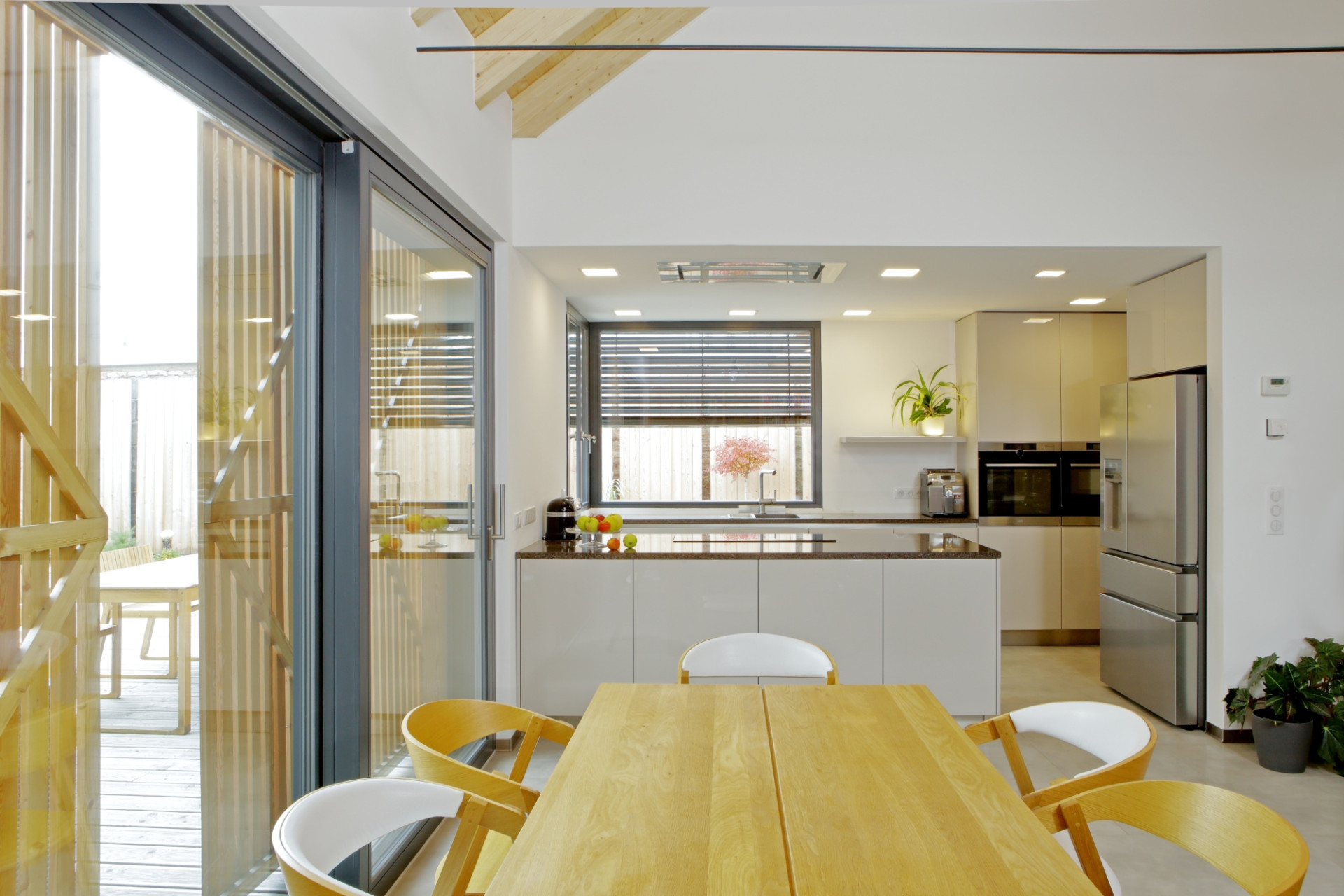 Także pokoje prywatne posiadają własne wyjścia na zewnętrzne tarasy – niewielkie, ciche pomosty wysunięte w ogród. Dom nie dominuje krajobrazu, lecz delikatnie się w niego wtapia, pozwalając mieszkańcom doświadczać ogrodu z różnych perspektyw.