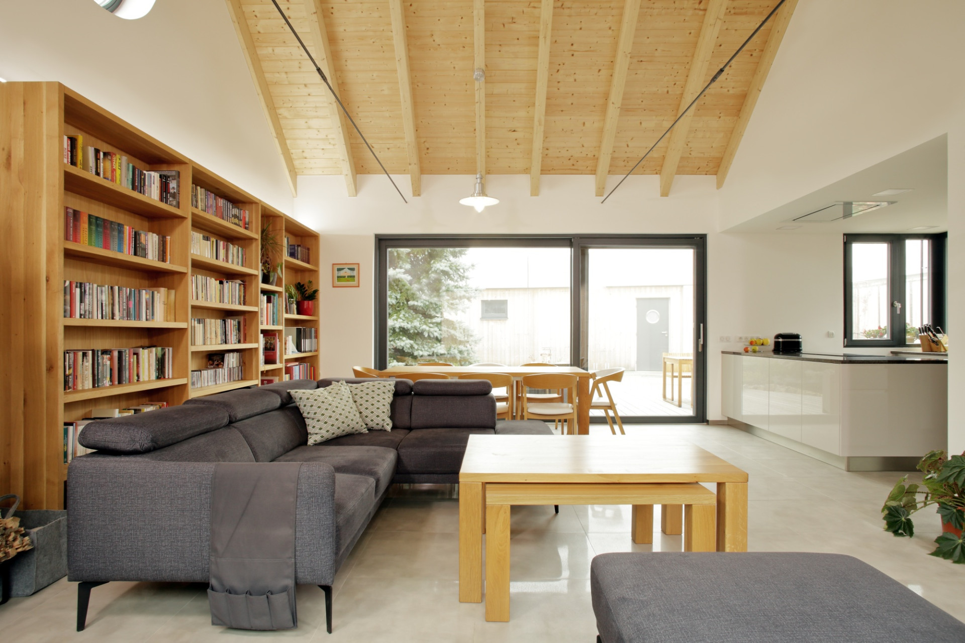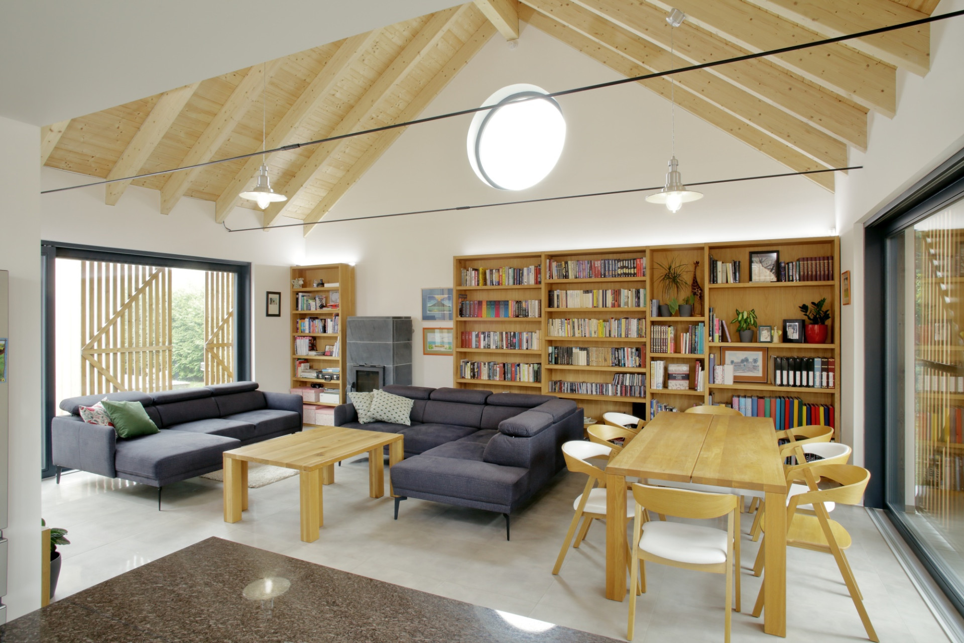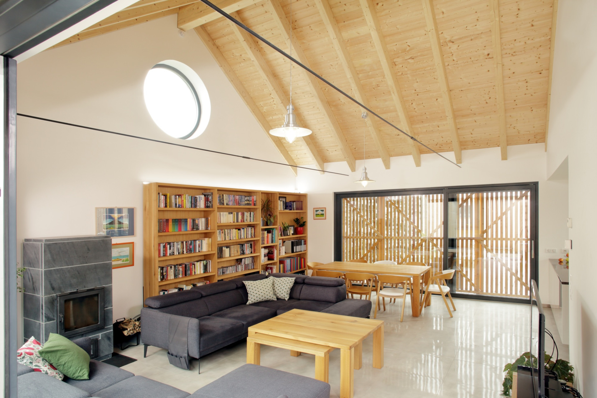 Wnętrza również utrzymane są w naturalnej tonacji drewna. Centralnym elementem przestrzeni dziennej jest odsłonięty krov – podwyższony sufit nadaje wnętrzu reprezentacyjny charakter i podkreśla rangę wspólnej strefy. W połączeniu z drewnianą zabudową i masywną biblioteczką tworzy atmosferę ciepła i domowości bez potrzeby stosowania dekoracyjnych gestów.