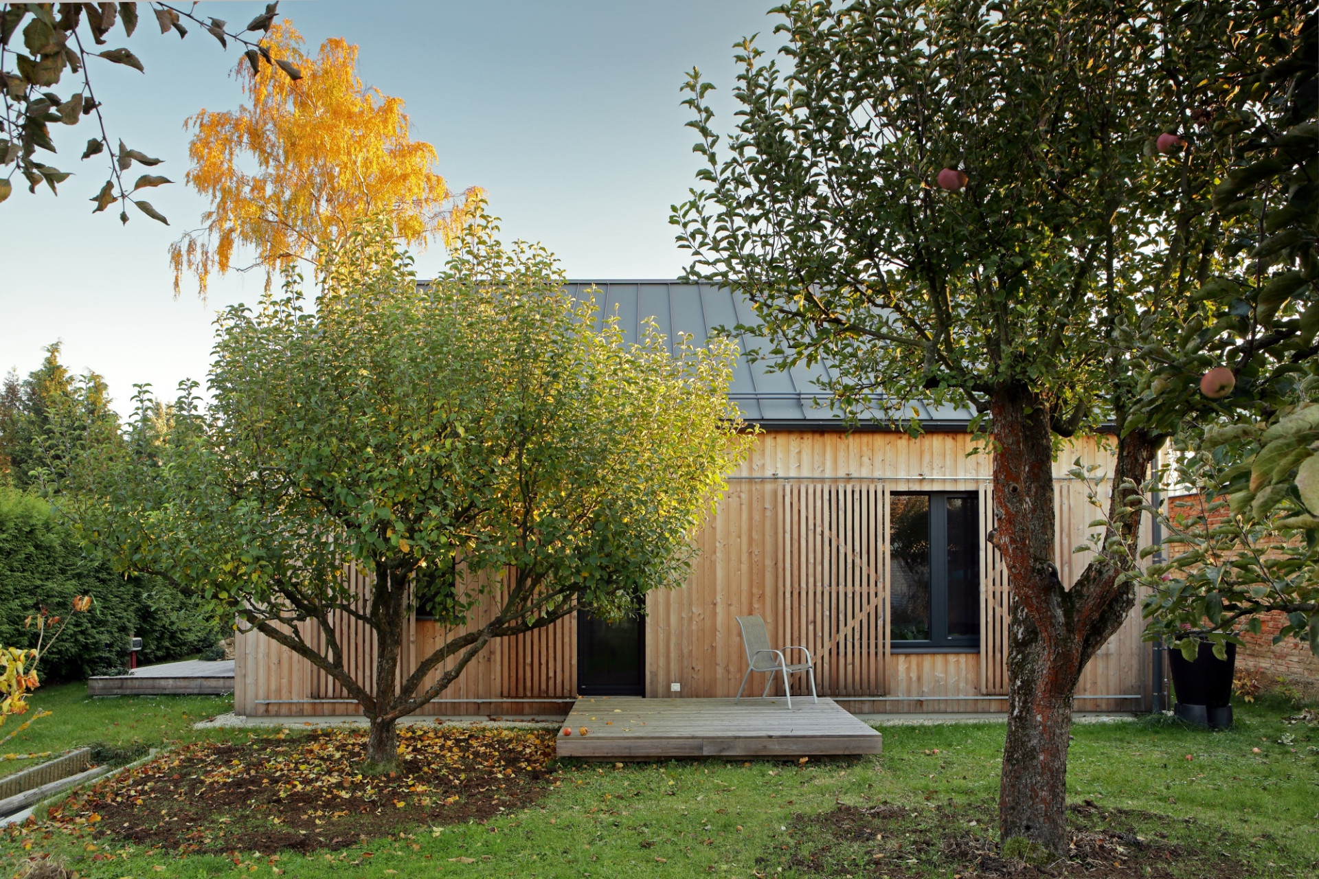 Projekt powstał w ścisłej współpracy z rodziną, dla której był tworzony. Dzięki temu każdy z domowników otrzymał własną przestrzeń, a układ domu odzwierciedla realne potrzeby mieszkańców. Kluczowe było również zachowanie istniejącej zieleni – dom został wkomponowany między drzewa, a nawet rosnąca tuż obok jabłoń pozostała na swoim miejscu.