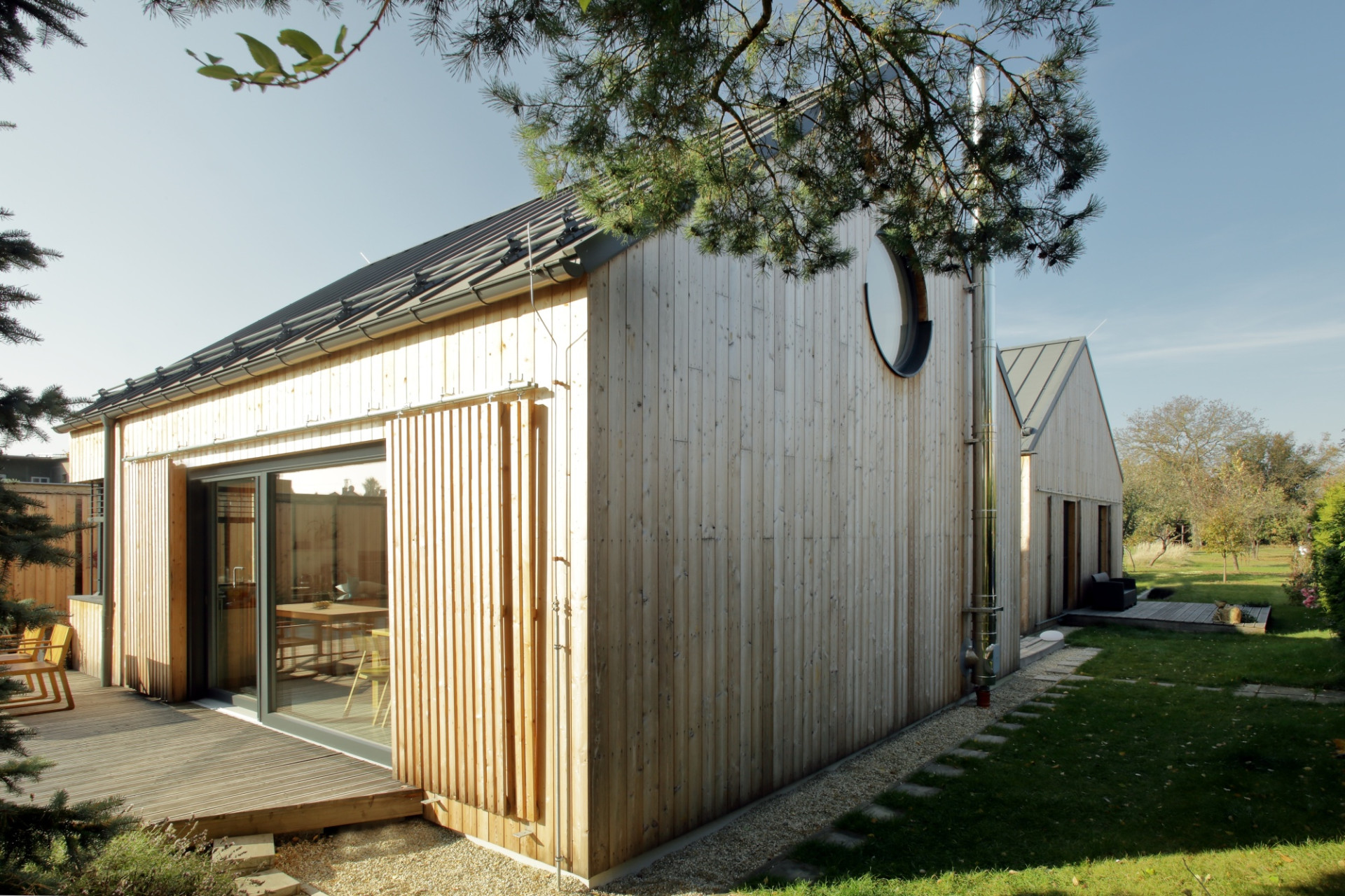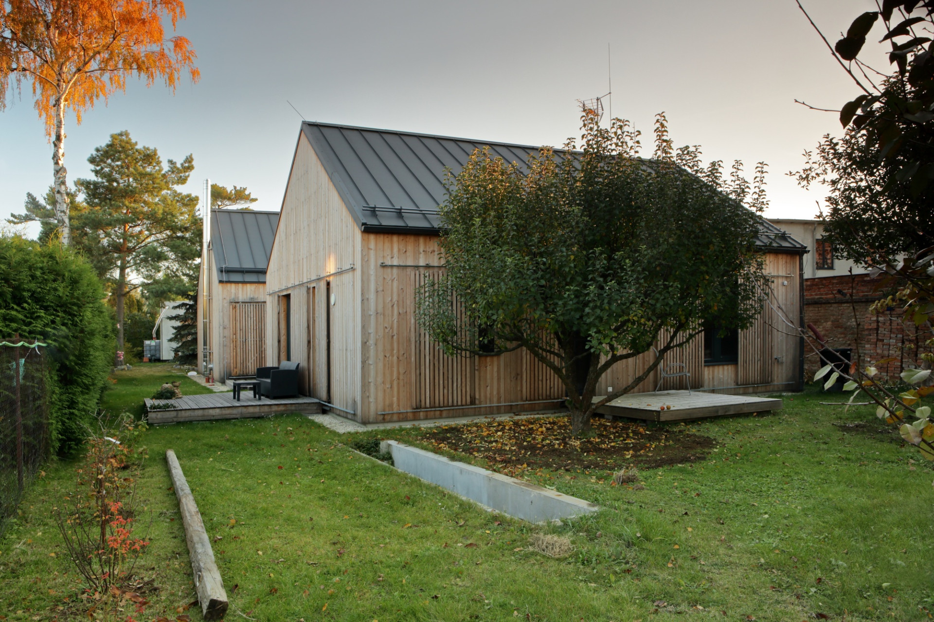Aby podkreślić związek domu z ogrodem, architekci zastosowali modrzewiową okładzinę elewacyjną. Drewno z czasem będzie ciemnieć, jeszcze silniej stapiając budynek z otaczającymi drzewami. Zamiast wyrazistego koloru czy kontrastu pojawia się subtelność i harmonia.