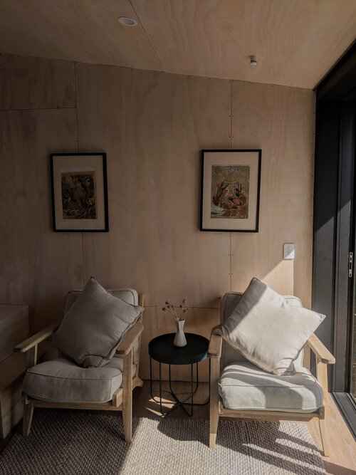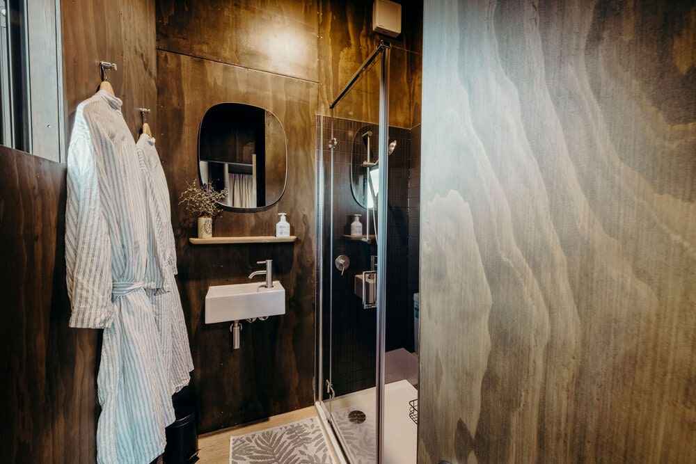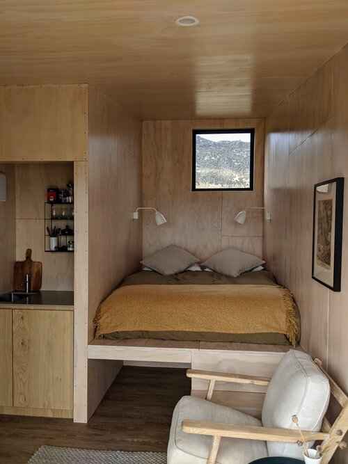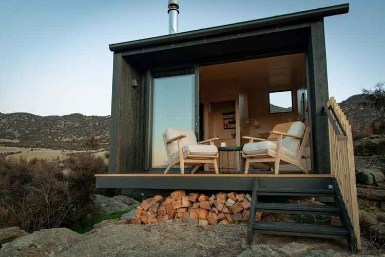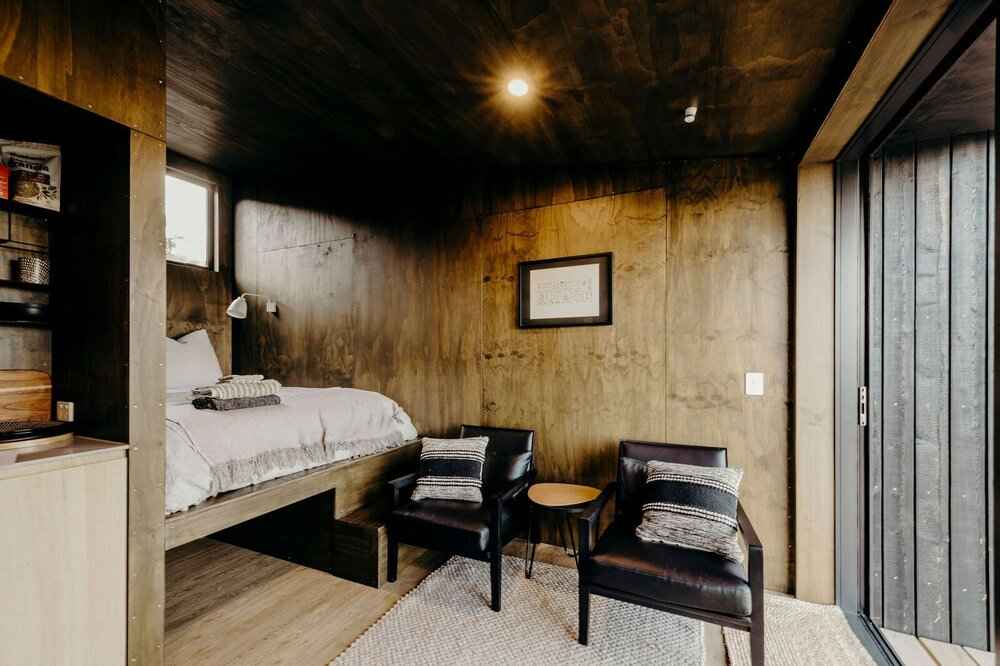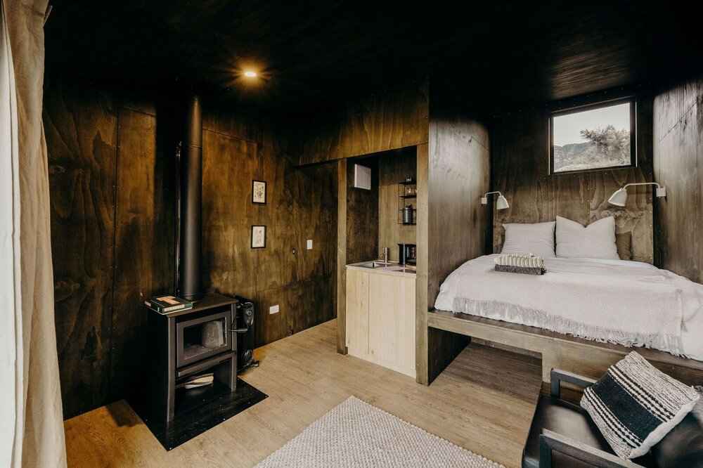 Pierwszy z domków – The Pisa Cabin – utrzymany jest w jasnej tonacji, stanowiąc przytulne schronienie dla dwóch osób. Naturalne materiały, miękka pościel i lniane tkaniny tworzą atmosferę spokoju i relaksu. Wnętrze ociepla kominek opalany drewnem, idealny do spokojnych wieczorów w blasku ognia. Wśród wyposażenia nie zabrakło też regału pełnego książek, które zachęcają do chwil wytchnienia z dala od codziennego zgiełku. Na zewnątrz czeka wolnostojąca wanna pod gołym niebem, z której można podziwiać bezkresne niebo południowej półkuli.