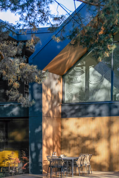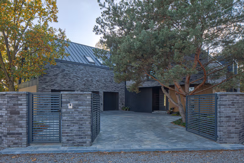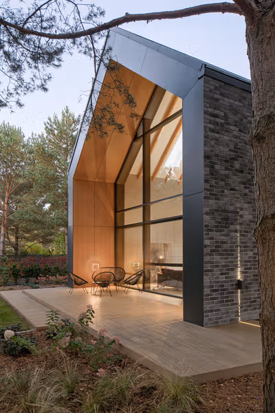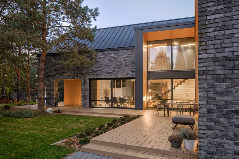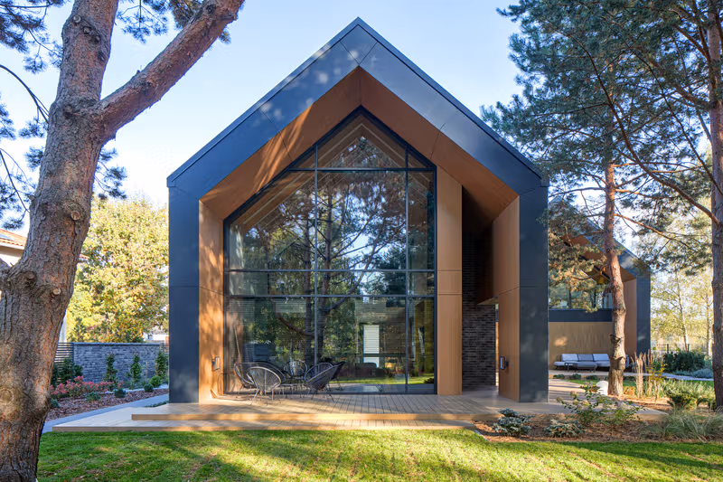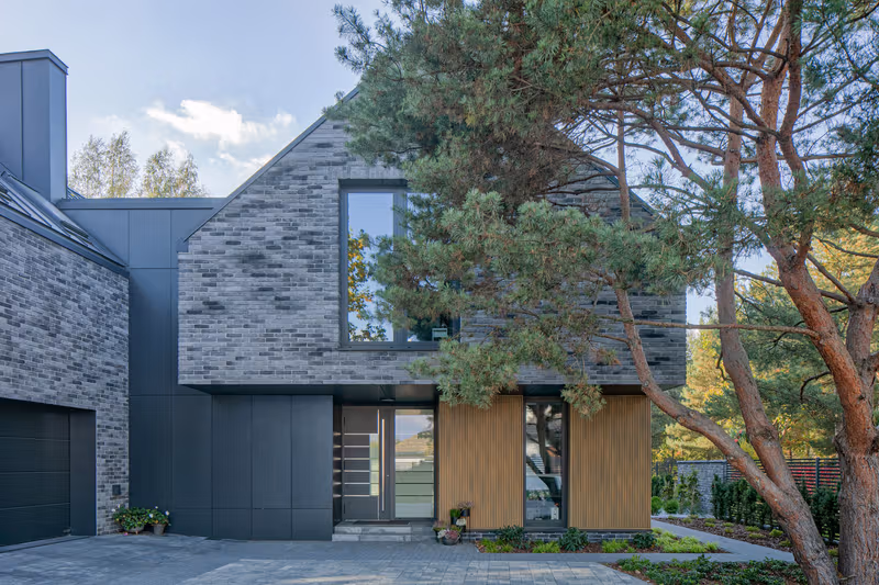 Materiały wykończeniowe zostały starannie dobrane z myślą o integracji z otaczającą przyrodą. Ciemnoszare, cementowe płytki elewacyjne przywodzą na myśl barwę pobliskich sosen, a dodatki z grafitowej blachy i płyt HPL podkreślają naturalny charakter domu. Wnęki wykończono drewnopodobnymi płytami HPL, które wprowadzają ciepły akcent inspirowany naturalnym drewnem.