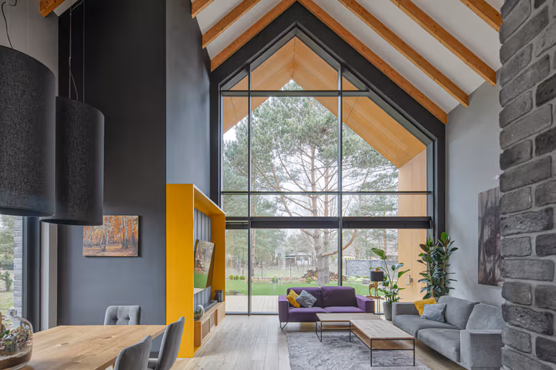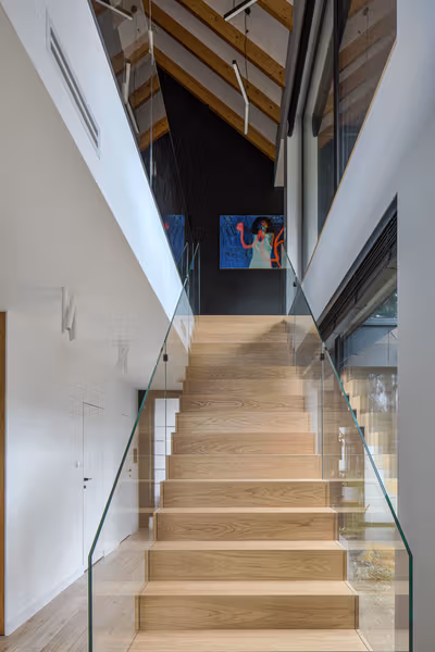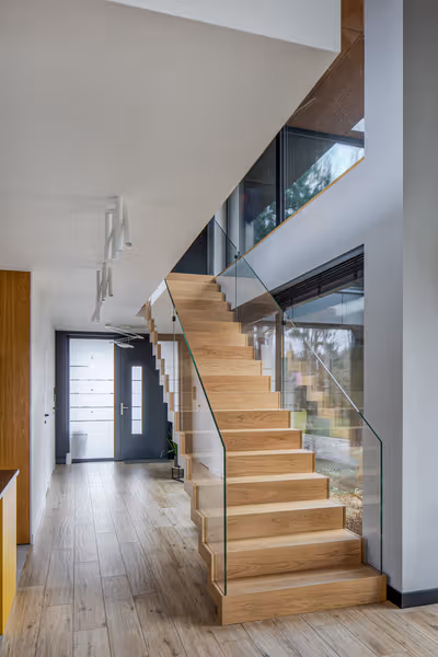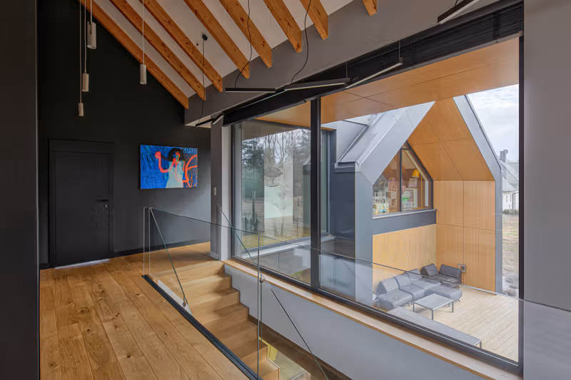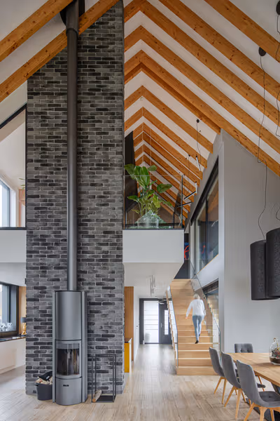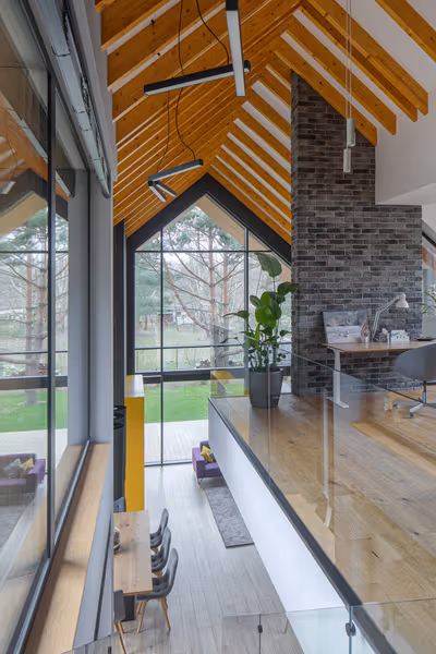 Wnętrza odzwierciedlają filozofię bliskości z naturą. Przeszklony hol pełniący funkcję łącznika między bryłami prowadzi do salonu i strefy prywatnej, w której przyroda przenika do wnętrz. Drewniane belki oraz elementy wykończenia nawiązują do krajobrazu, tworząc spójność z zewnętrzną formą budynku.