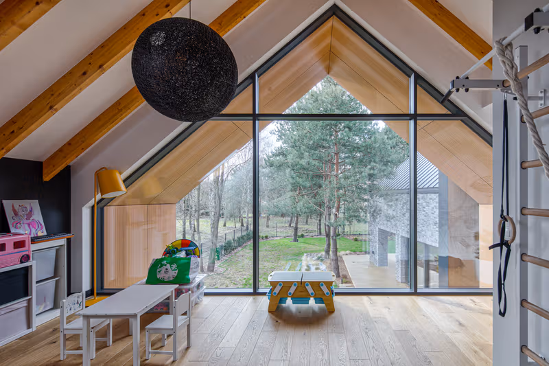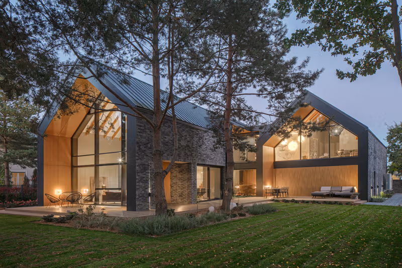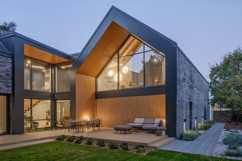 Dom, usytuowany w Komorowie-Wsi, jest idealnym przykładem, jak nowoczesne projektowanie może współgrać z tradycją i lokalnym kontekstem. Forma budynku składa się z dwóch brył inspirowanych kształtem stodoły – jest to przemyślany zabieg mający na celu stworzenie harmonii z wiejskim krajobrazem. Obie bryły, o łącznej powierzchni użytkowej 352 m², nie dominują nad sąsiednią zabudową, lecz wpisują się w jej charakter, tworząc naturalne przedłużenie wiejskiego otoczenia.