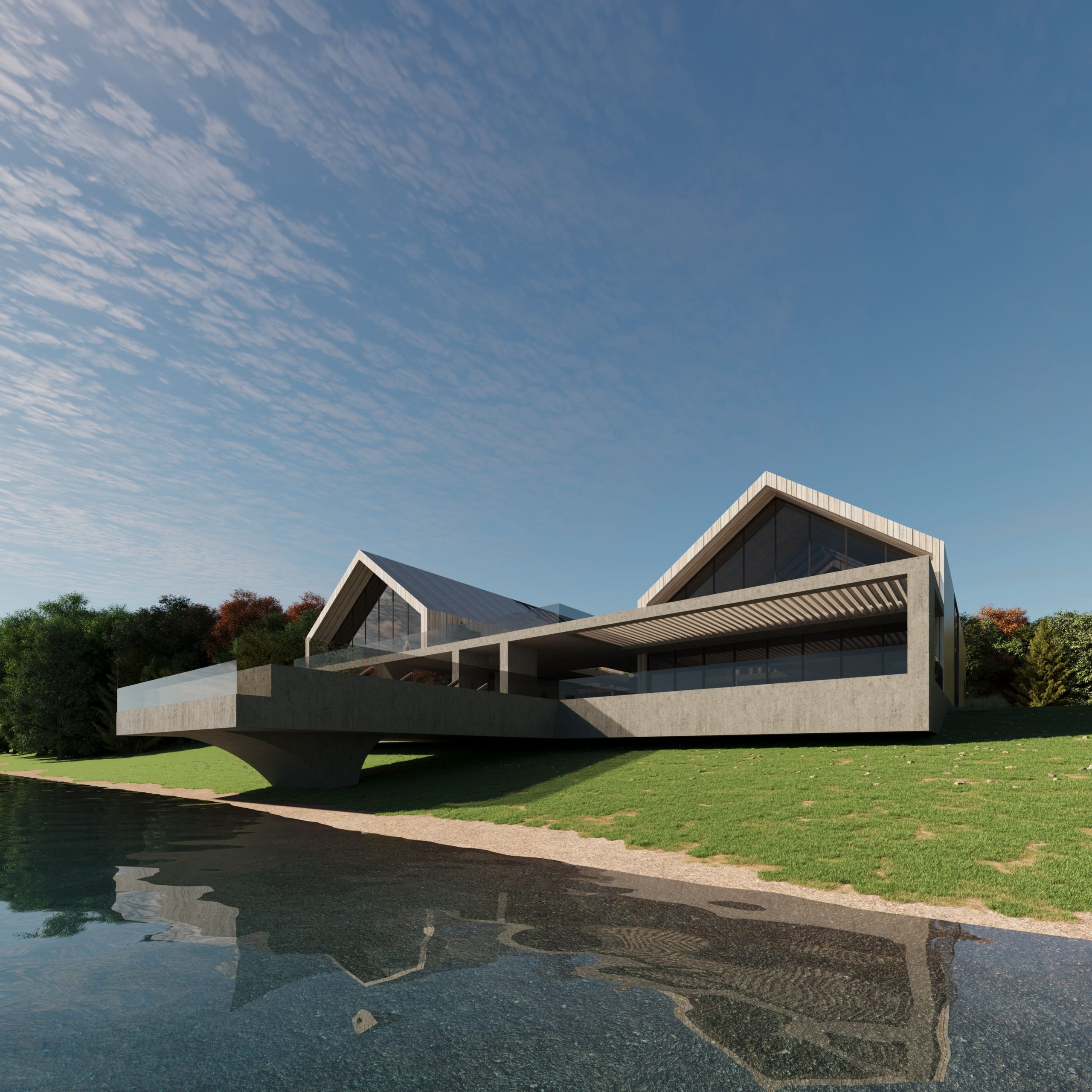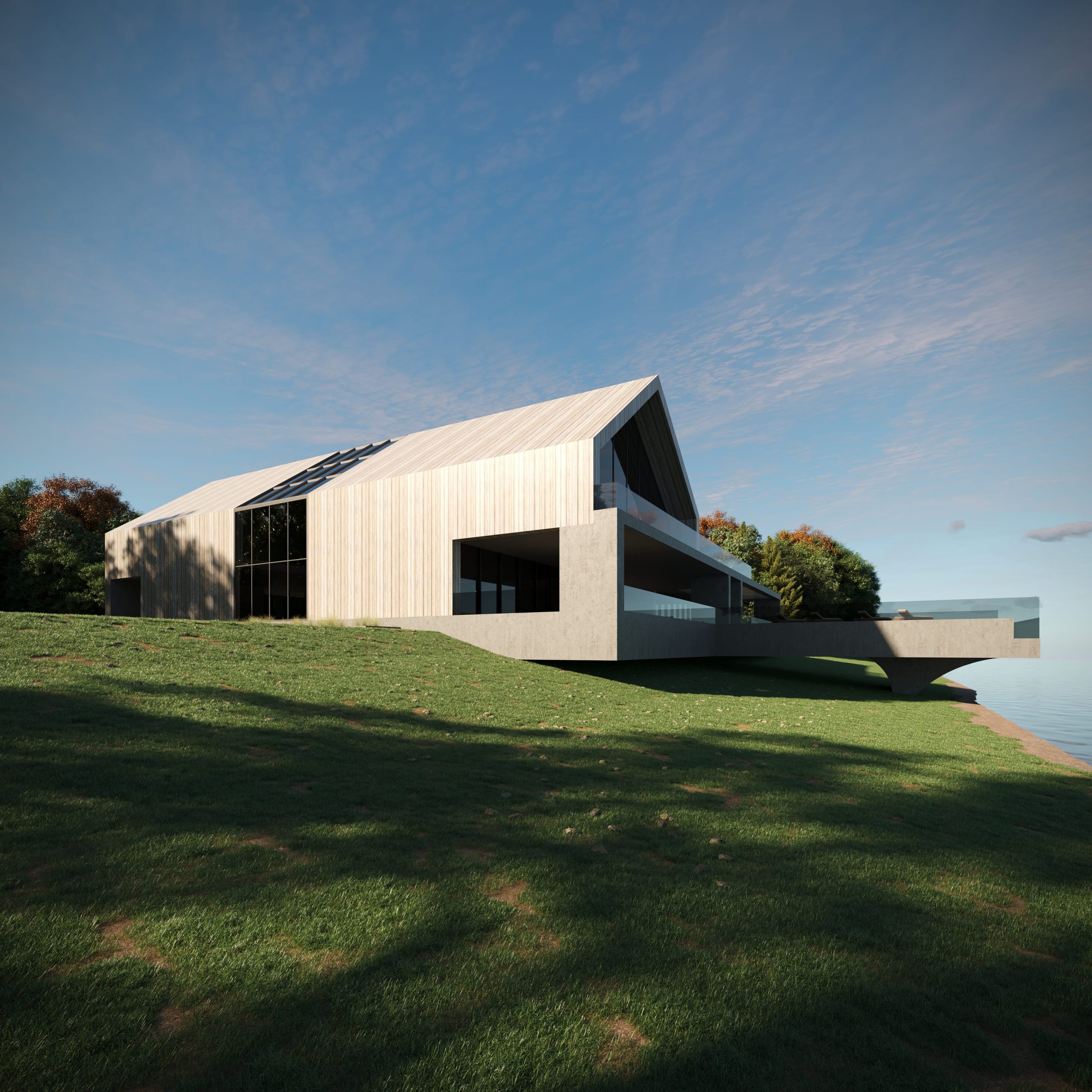 Skala domu jest odpowiedzią na rozległość działki, monumentalność krajobrazu oraz bliskość wody. Układ brył, tarasów i przeszkleń został podporządkowany nie tylko stronom świata, lecz także osi widokowej prowadzącej w kierunku jeziora. Przeszklone szczyty obu stodół otwierają wnętrza na panoramę wody, a dodatkowe przeszklenia w połaciach dachów dwuspadowych wprowadzają światło głęboko do środka budynku, wzmacniając relację między architekturą a naturą.