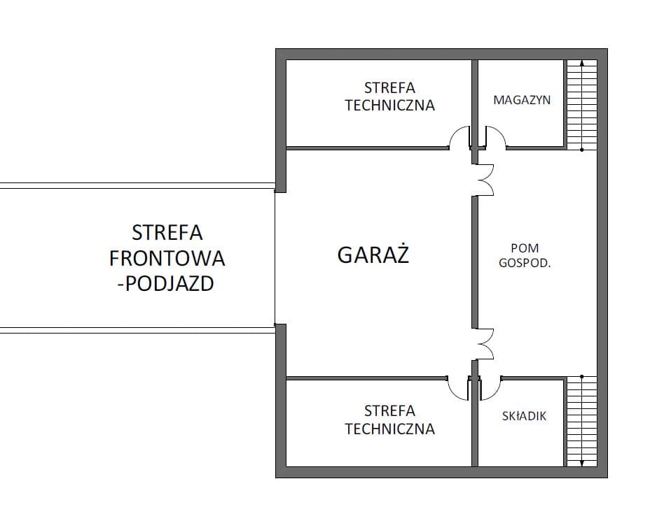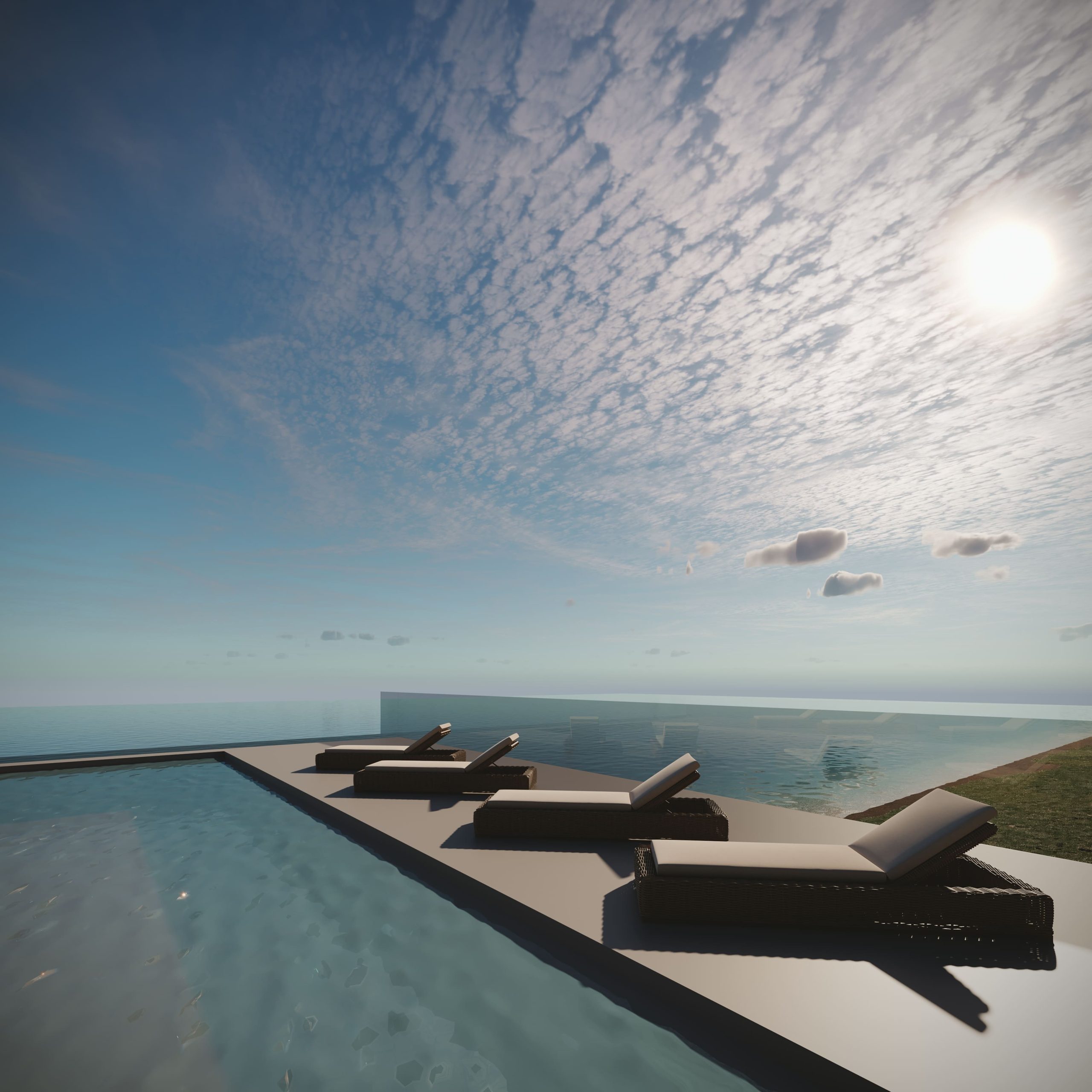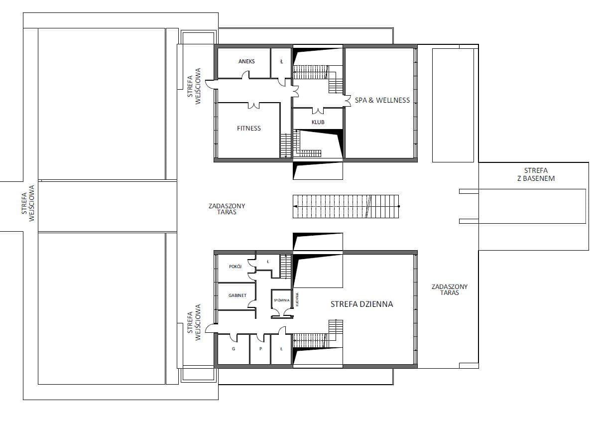 Szczególną rolę w projekcie odgrywa basen przydomowy, który nie jest jedynie dodatkiem do domu, lecz jednym z kluczowych elementów kompozycyjnych. Został on umieszczony centralnie, na osi całego założenia, pomiędzy dwiema bryłami. Jego forma – częściowo nadwieszona nad terenem – podkreśla nowoczesny charakter willi i wprowadza dodatkową dynamikę do kompozycji. Basen jest bezpośrednio dostępny z obu części domu oraz z tarasów położonych wyżej, z których prowadzi do niego reprezentacyjna klatka schodowa, również usytuowana na osi kompozycyjnej.