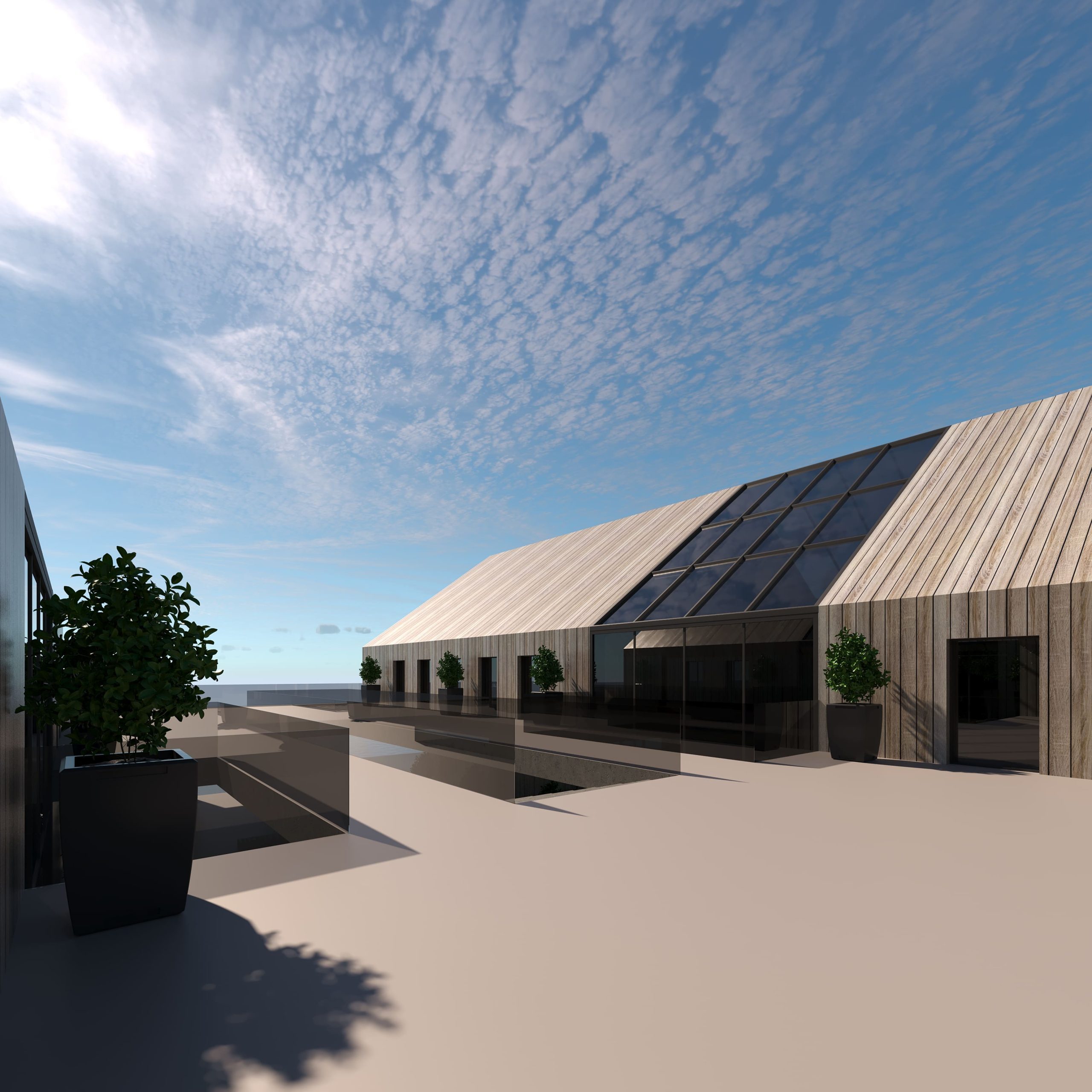 Elewacje budynków zaprojektowano jako wentylowane okładziny HPL w jasnym, bielonym odcieniu inspirowanym skandynawskim drewnem. Materiał ten płynnie przechodzi ze ścian na dachy dwuspadowe, podkreślając jednorodność i czystość brył. Uzupełnieniem jest beton architektoniczny w odcieniu szarości, zastosowany na cokołach, podestach, wspornikach, postumentach oraz na tarasach i posadzkach zewnętrznych. Ograniczenie palety materiałowej do dwóch dominujących rozwiązań nadało całemu założeniu minimalistyczny, spokojny, a zarazem bardzo wyrazisty charakter.