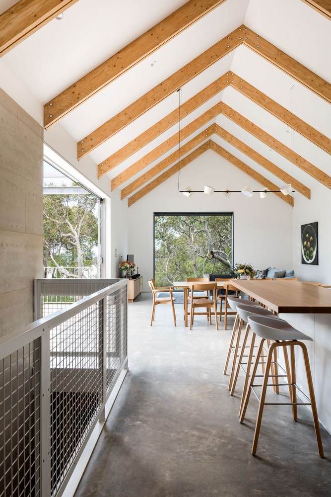 Górna kondygnacja, obłożona niebieską deską elewacyjną, mieści główne strefy dzienne: kuchnię, salon, jadalnię, przestrzenie zewnętrzne oraz sypialnię główną. Odsłonięta konstrukcja dachu podkreśla archetypiczną formę domu plażowego, a duże okno panoramiczne kadruje widok przez korony drzew aż po ocean.