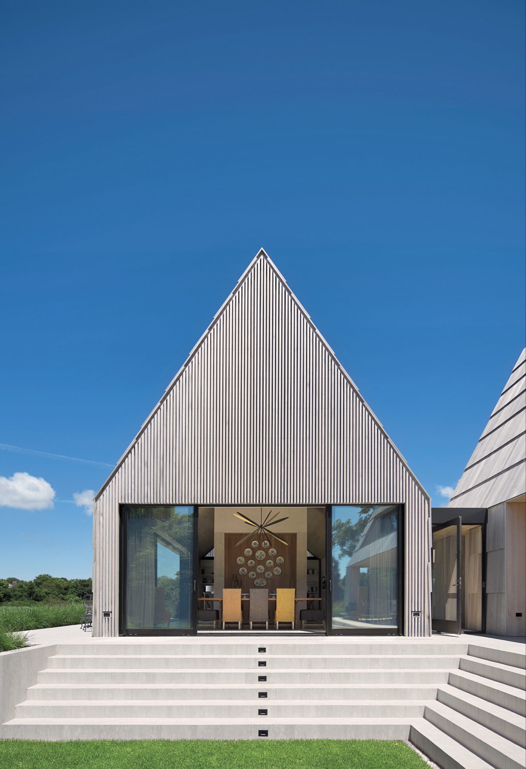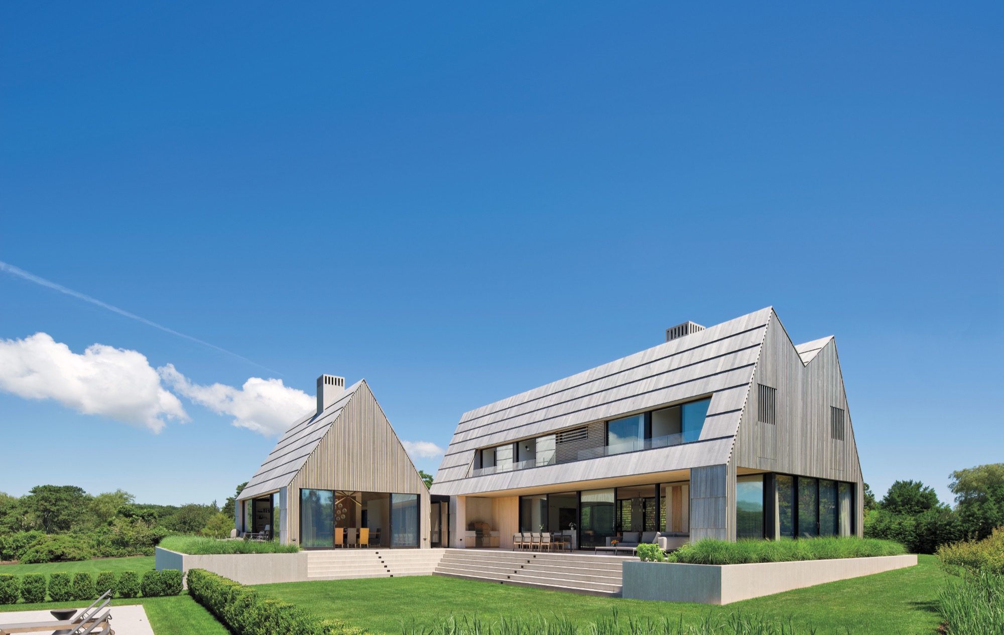 Bryły, proste i powściągliwe w wyrazie, nawiązują do dawnych gospodarstw Long Island, gdzie obok głównego domu powstawały kolejne stodoły i zabudowania. Dwuspadowe dachy i zwarta sylweta przywołują lokalną tradycję, jednocześnie nadając całości współczesny, minimalistyczny charakter. Każdy z budynków pełni odmienną funkcję: wspólne przestrzenie dzienne, prywatne apartamenty, biuro, garaż i wolnostojący pawilon jadalny.