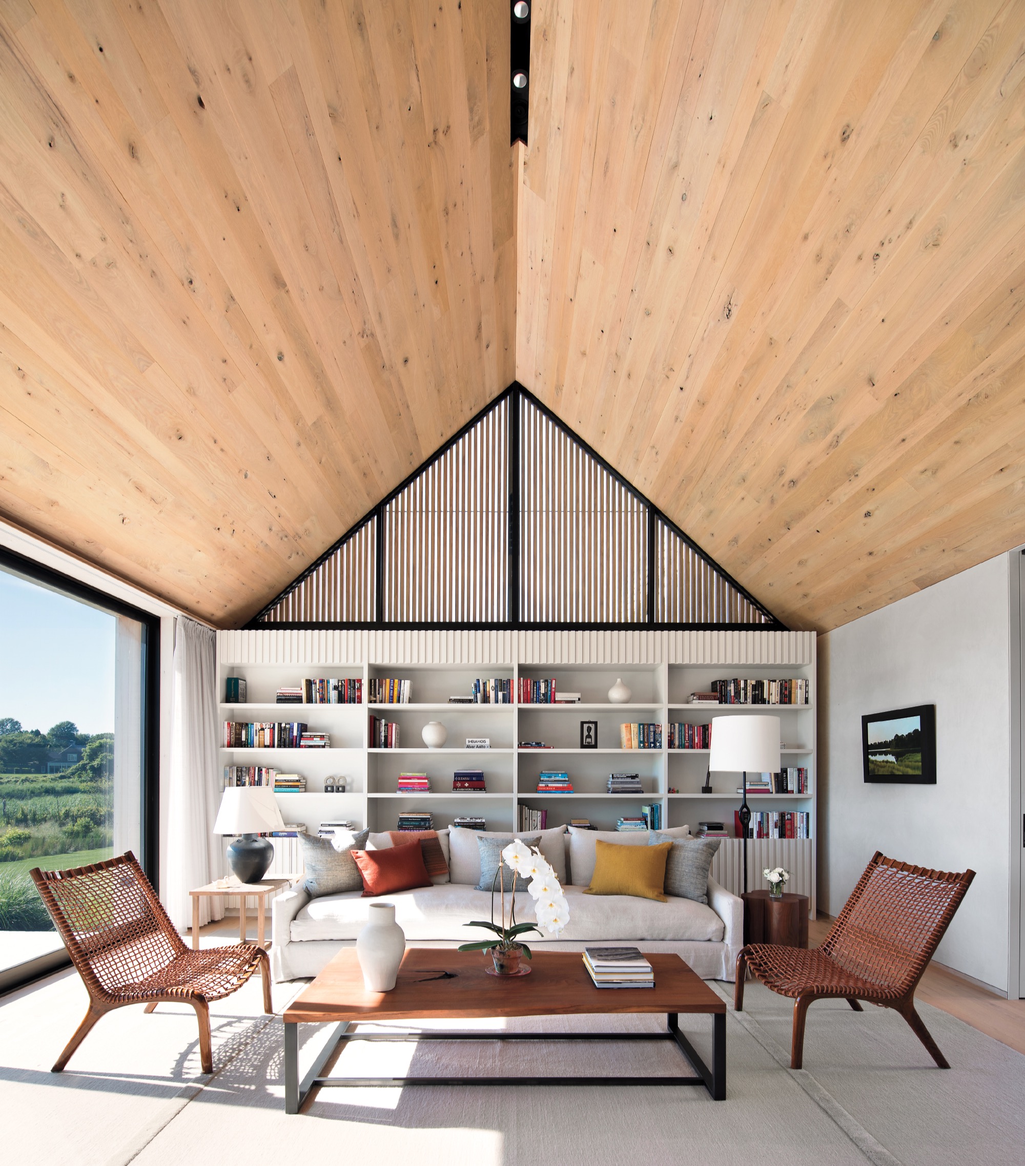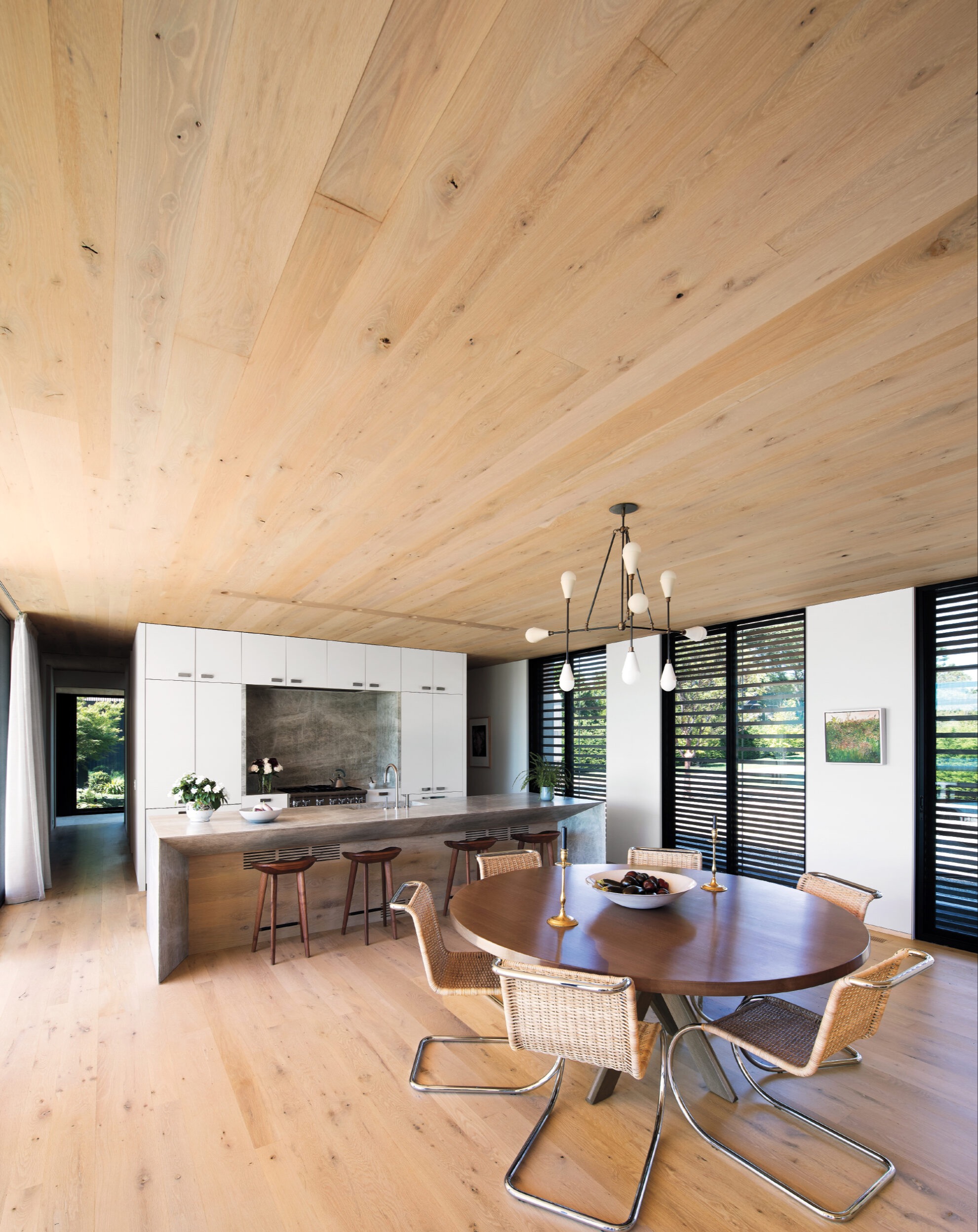 Za aranżację wnętrz odpowiadała Erica Millar Design, która uzupełniła architekturę o warstwę tekstur i kolorów. Część mebli przeniesiono z poprzedniego domu właścicieli, inne zostały zaprojektowane na zamówienie. W efekcie powstała przestrzeń łącząca nowoczesną prostotę z ciepłem drewna i naturalnych materiałów, w której architektura i wystrój wzajemnie się dopełniają.