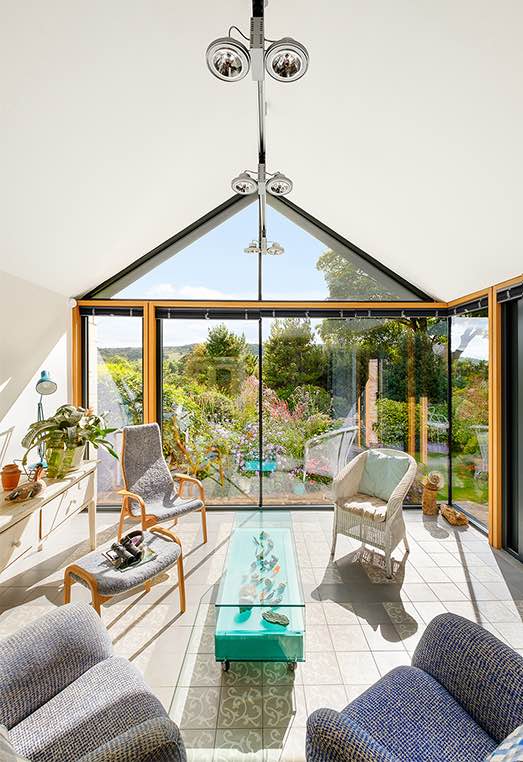 Aby nadać budynkowi nowy wyraz, wprowadzono zupełnie nowy dach, który porządkuje bryłę i pozwala na harmonijne dodanie kolejnych elementów. Przeniesione wejście główne otwiera się teraz na przestronny, jasny przedsionek, a od strony ogrodu pojawiła się szklana oranżeria, która rozmywa granice między wnętrzem a krajobrazem.