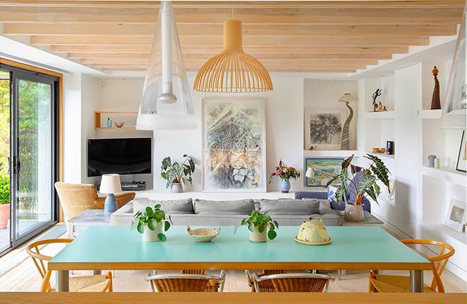 Centralnym punktem nowego układu stała się otwarta strefa dzienna, łącząca salon, jadalnię i kuchnię w jedno harmonijne wnętrze z bezpośrednim wyjściem do ogrodu. Dom zyskał również pracownię artystyczną oraz wystarczająco dużo przestrzeni, by komfortowo gościć wnuki i przyjaciół.