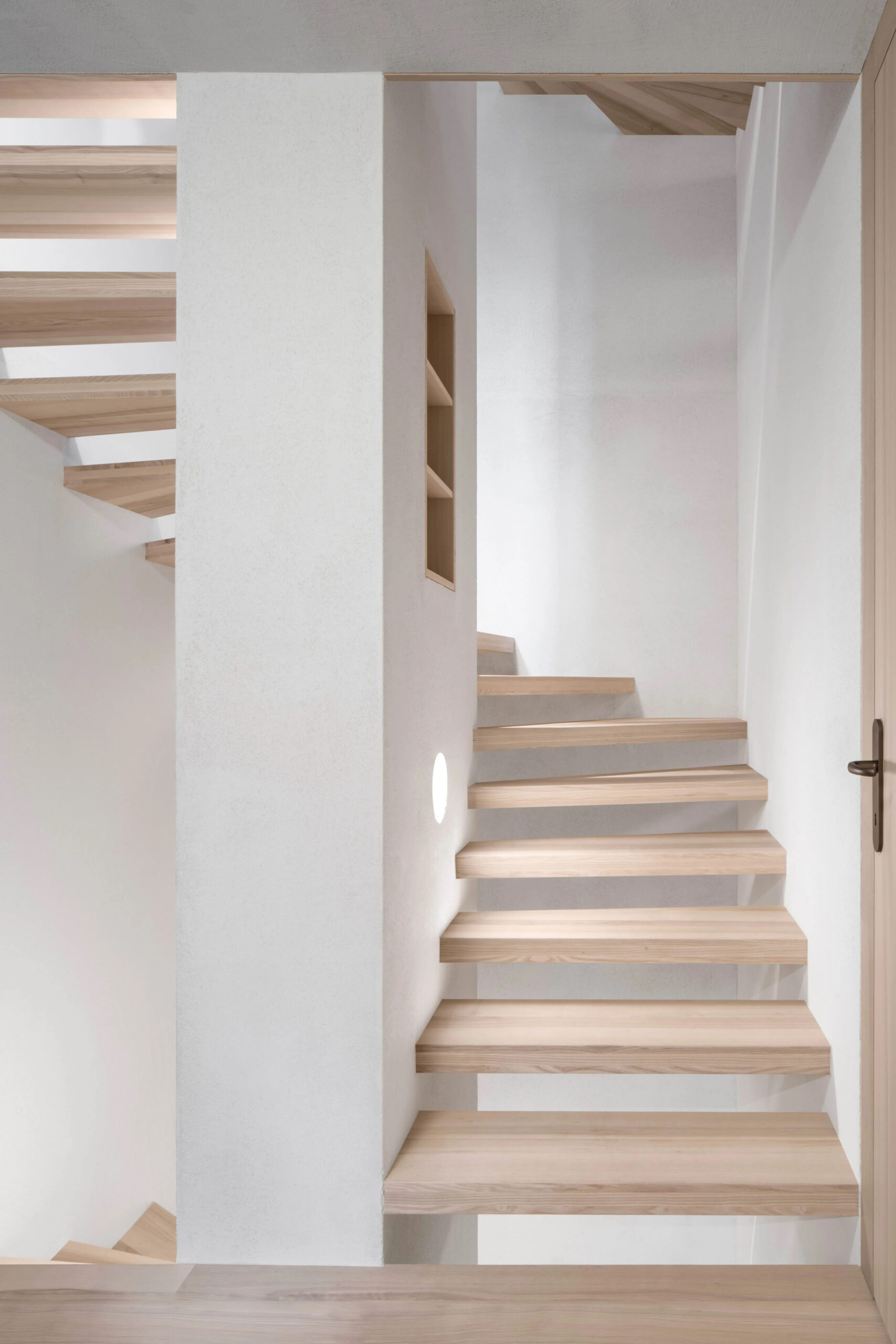 Trzypiętrowy dom o dwuspadowym dachu stoi na solidnej betonowej podstawie, natomiast cała nadbudowa wykonana jest z drewna. Elewacja z cienkich, pionowych paneli drewnianych nie tylko filtruje światło słoneczne, ale nadaje budynkowi architektoniczną lekkość i wpisuje go w zalesione otoczenie. Balkony na każdej kondygnacji zacierają granicę między wnętrzem a zewnętrzem, oferując niezakłócony widok na dolinę i pobliski las.