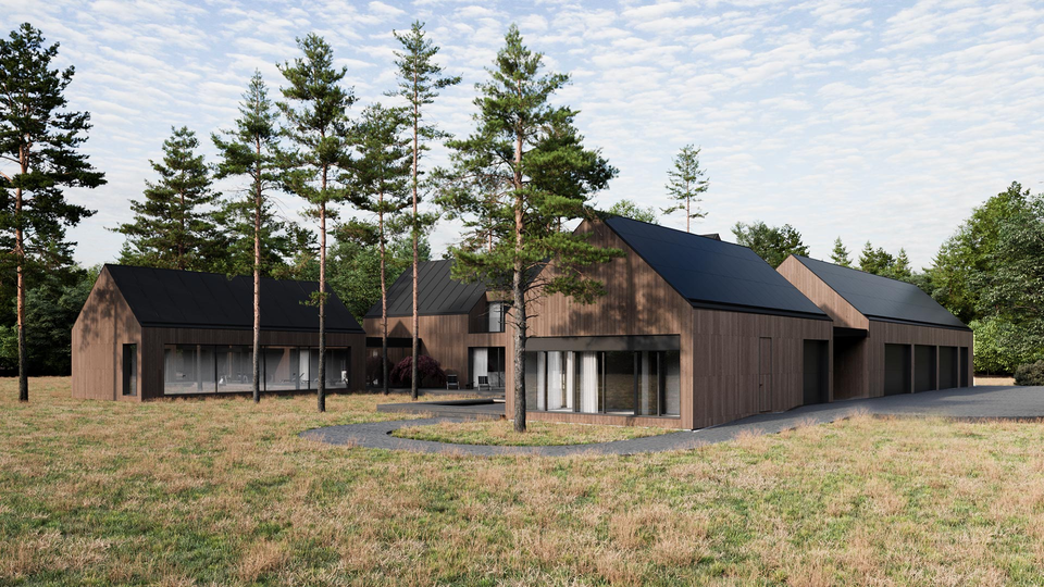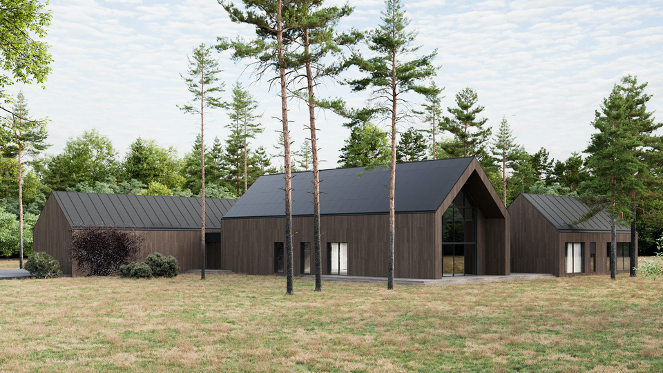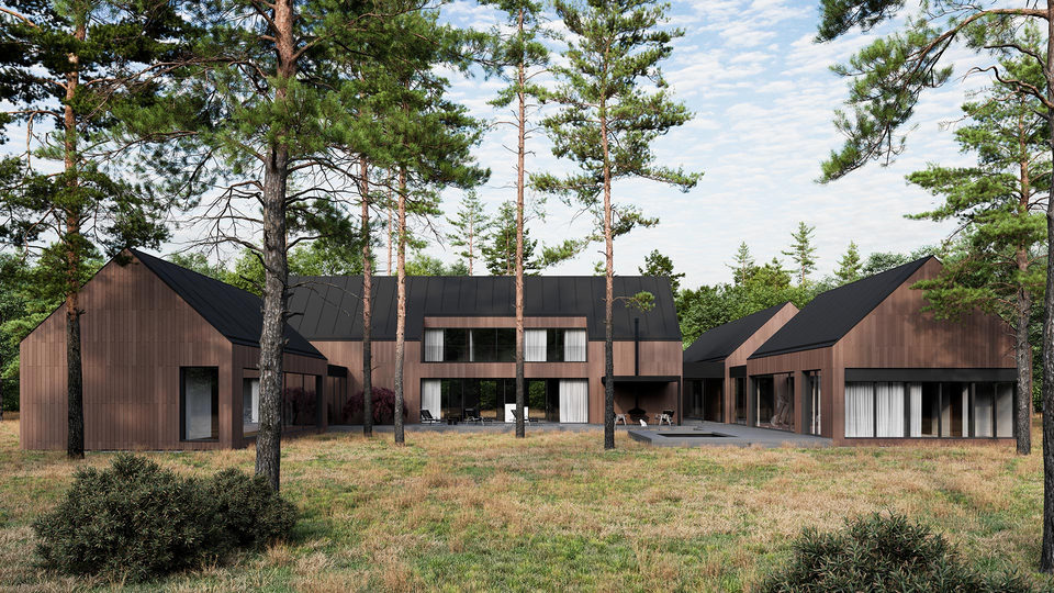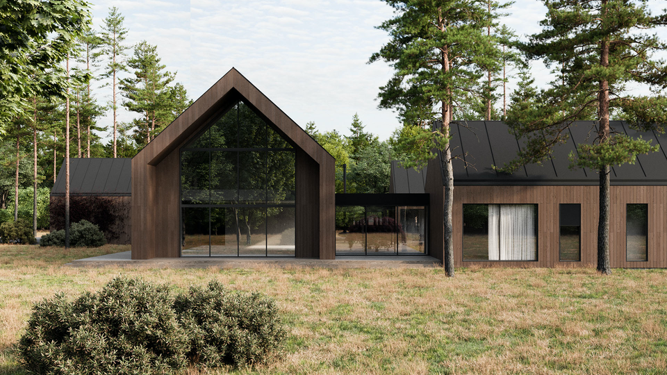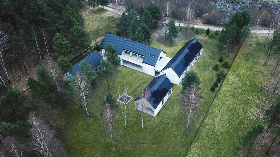 Projekt stanowi współczesną interpretację zabudowy zagrodowej. Bryła została wyraźnie podzielona na cztery części, połączone ze sobą za pomocą szklanych łączników. Podkreślają one integrację z naturą i pozwalają wizualnie przenikać sąsiadującym drzewom do wnętrza domu.