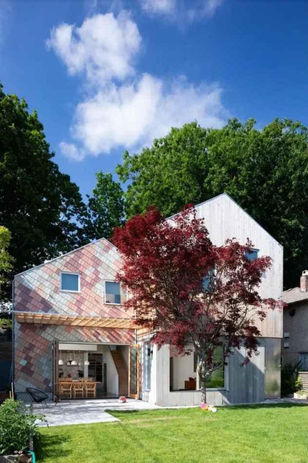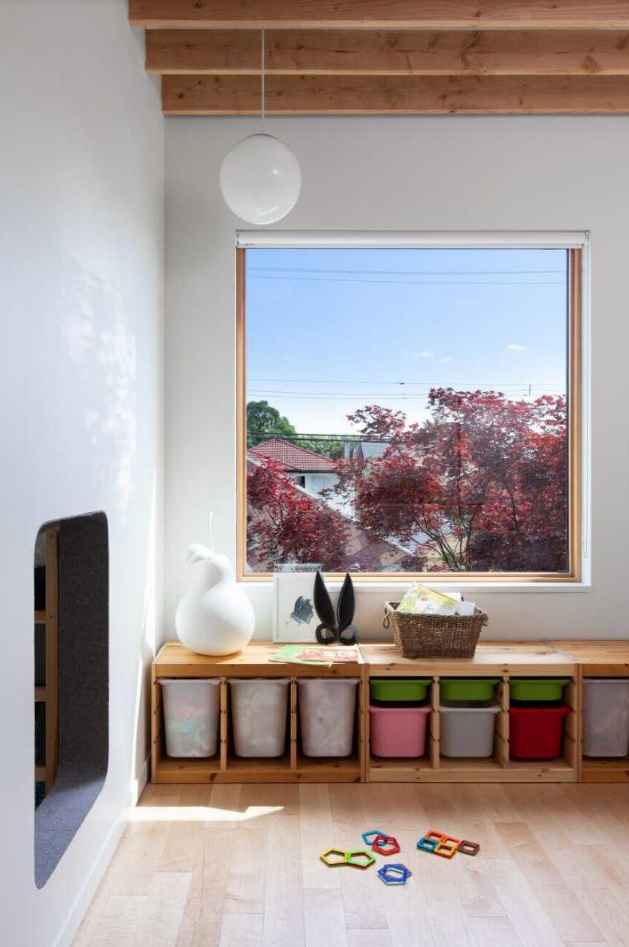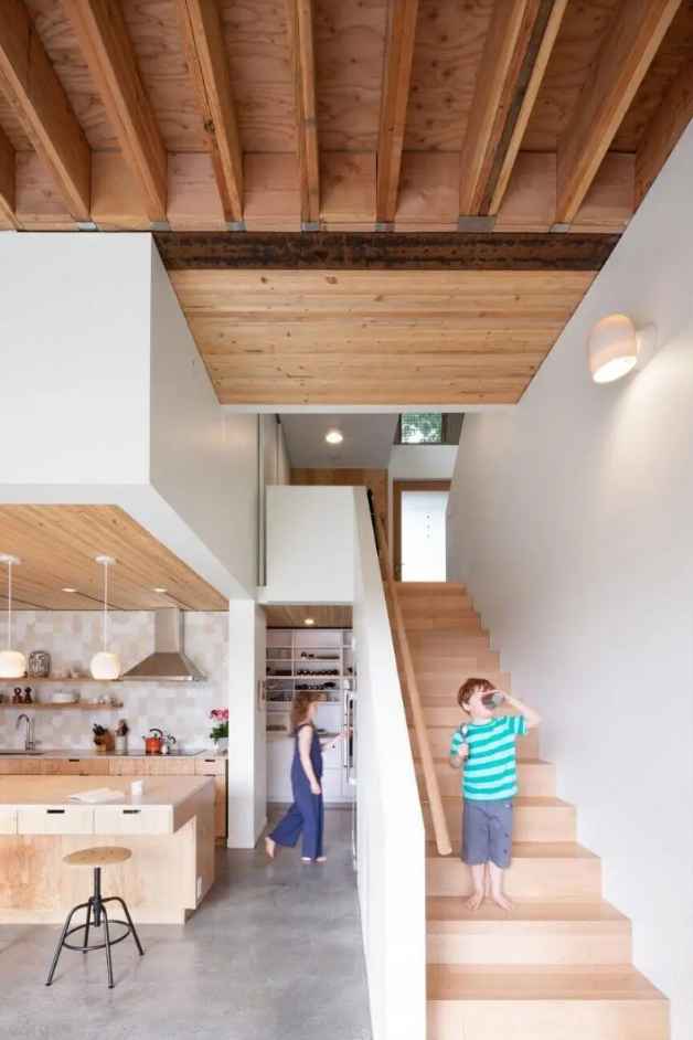Radosny charakter budynku widać już w jego elewacji – zestawienie cedrowej deski z kolorowym gontem tworzy efekt dynamicznej, żywej fasady. We wnętrzu architekci bawią się tradycyjnymi materiałami konstrukcyjnymi, pozostawiając odsłonięte belki, przewody oraz stosując sklejkę konstrukcyjną jako wykończenie mebli. Przestrzeń urozmaicają niestandardowe schody i antresola, dzięki czemu dom zyskuje wielopoziomowy, kreatywny charakter. Rozkład pomieszczeń zoptymalizowano tak, by maksymalnie wykorzystać metraż, a bawialnię rozszerzono o wnękę nad wejściem, zabezpieczoną siatką dla bezpieczeństwa.