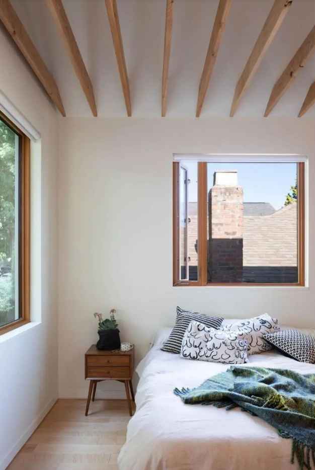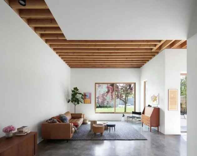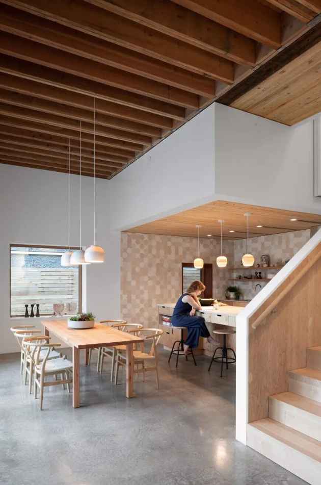 Shift House płynnie otwiera się na naturę dzięki dużym oknom i szerokim przeszkleniom, które łączą kuchnię i jadalnię z zadaszonym patio. Projekt powstał także z myślą o ekologii – wiele materiałów zyskało drugie życie, jak jodłowe deski z rusztowania przerobione na donice, czy drewno wykorzystane do stworzenia stołu i biurka. Dzięki świadomemu podejściu do zrównoważonej architektury Shift House stał się przykładem domu, który łączy kreatywność, rodzinność i odpowiedzialność za środowisko.