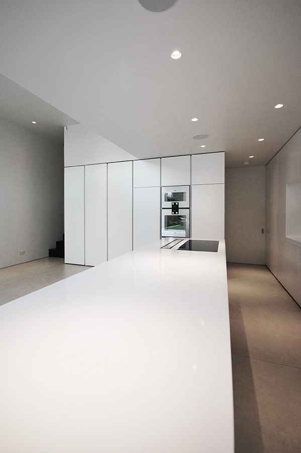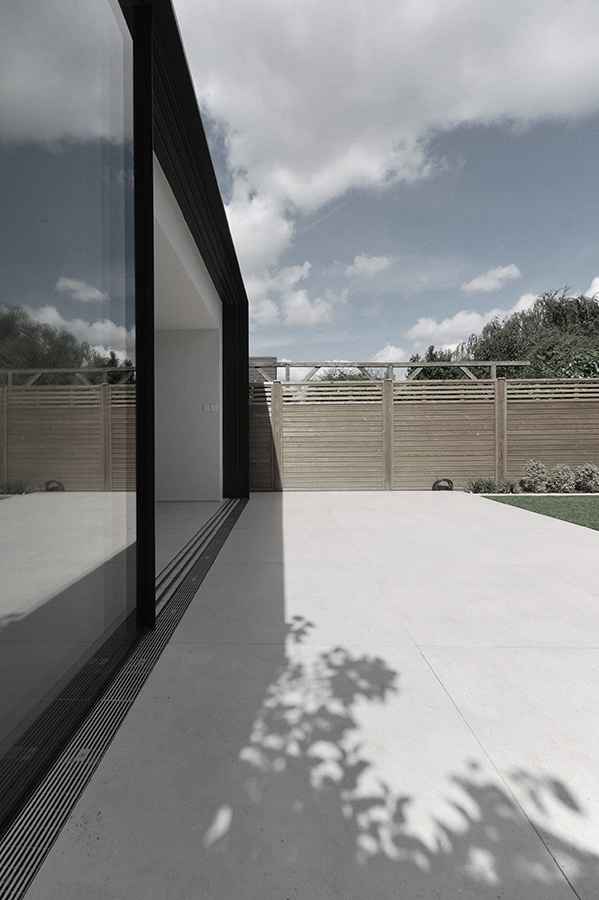 Dobudówka wykonana została z surowego betonu i szkła, co podkreśla minimalistyczny, industrialny styl całej realizacji. Przestrzeń tarasu pokryto płytami z betonu architektonicznego, które korespondują z jasnym i oszczędnym w formie wnętrzem. W środku króluje światło naturalne, biel oraz proste formy, które optycznie powiększają przestrzeń i wzmacniają wrażenie lekkości. Projekt dobudówki zyskał uznanie dzięki wyważonemu podejściu do proporcji, materiałów i detali.