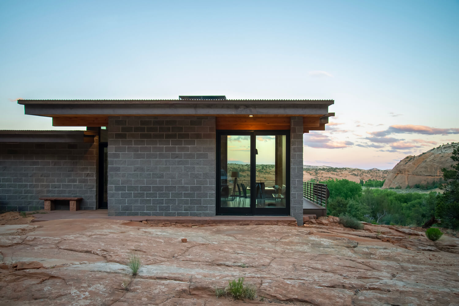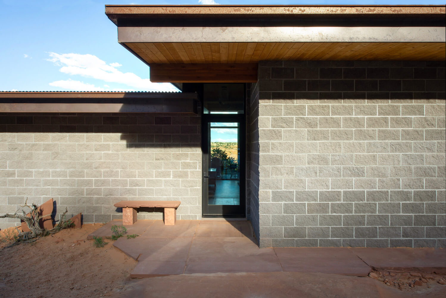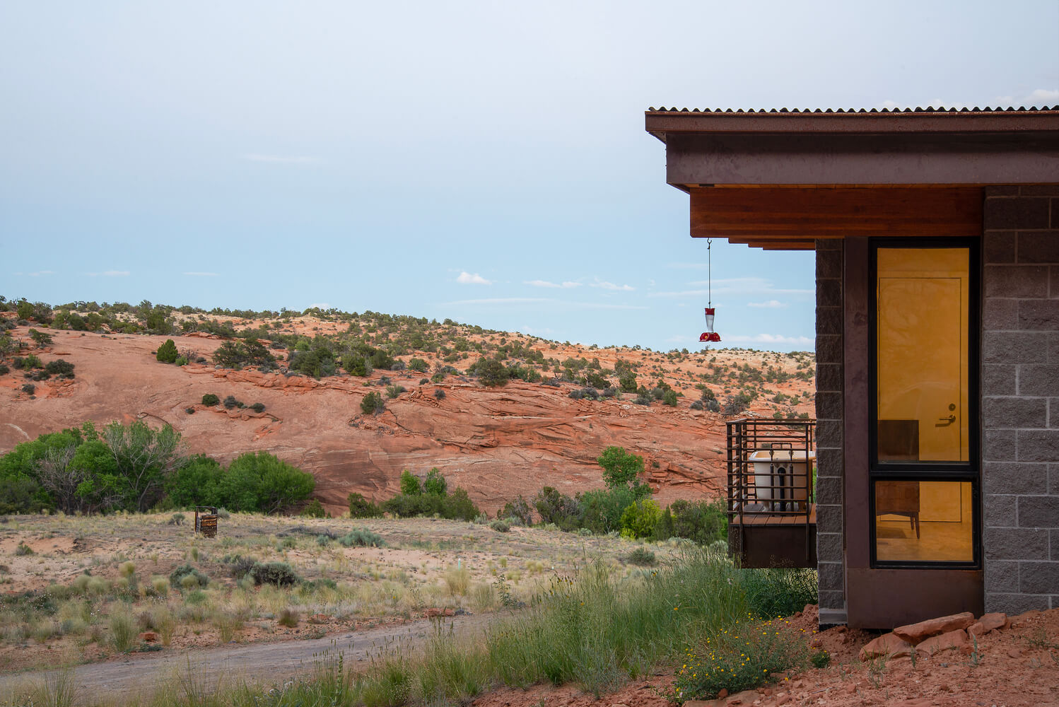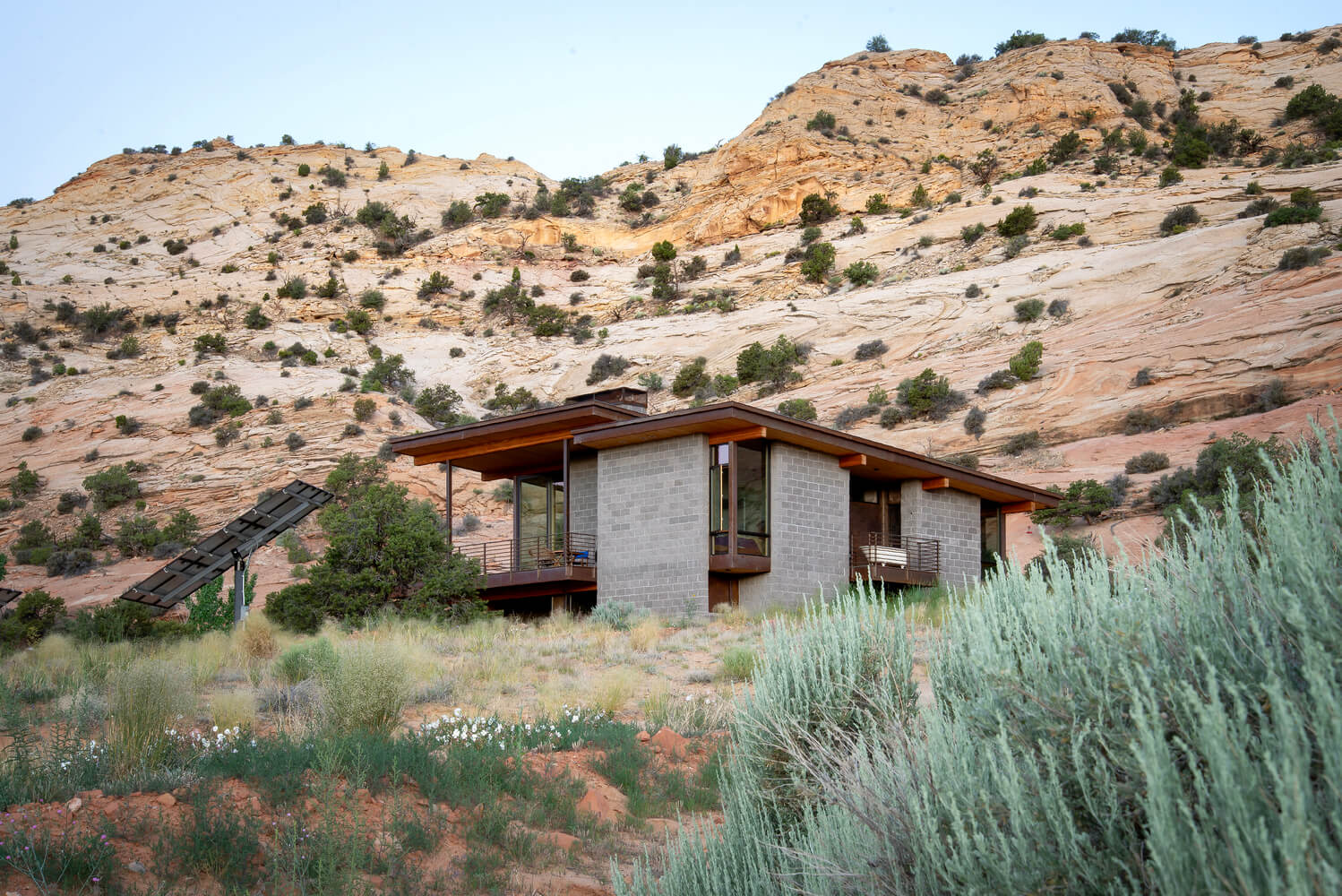 Położony wiele kilometrów od najbliższych mediów, dom zaprojektowano tak, aby był całkowicie odłączony od sieci i samowystarczalny. Wolnostojący układ fotowoltaiczny zapewnia energię, studnia zapewnia wodę, a szambo zapewnia warunki sanitarne. Aby wytrzymać surowy pustynny klimat i jego drastyczne wahania temperatury, w ośrodku zastosowano kilka strategii wykorzystania energii pasywnej.