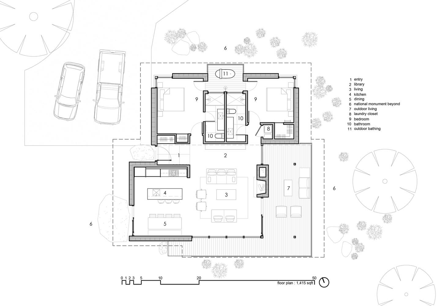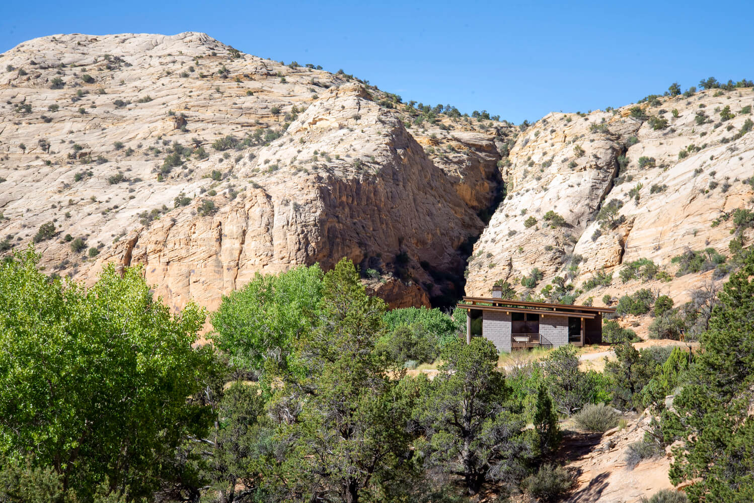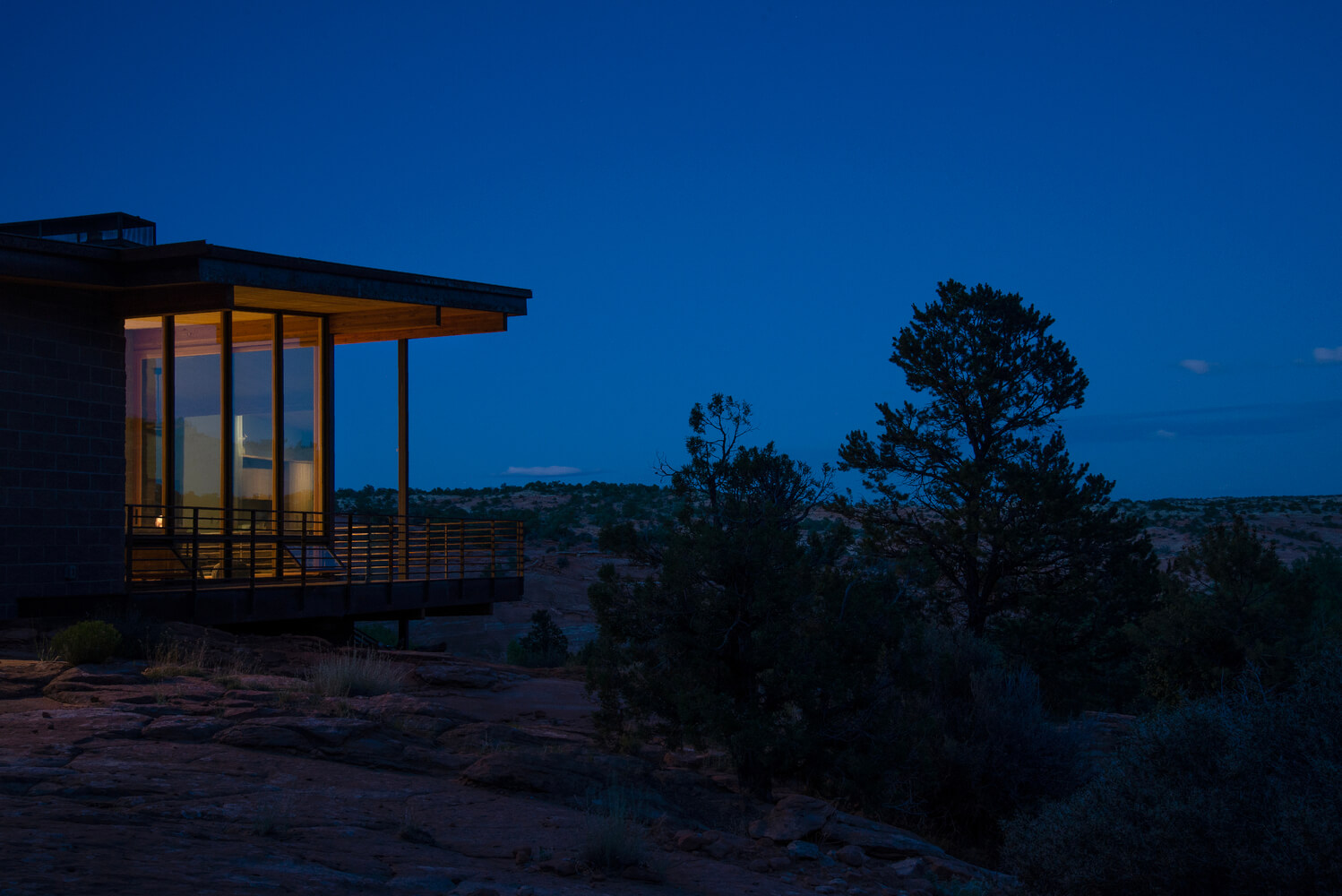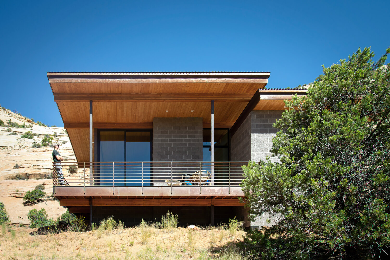 Położony wiele kilometrów od najbliższych mediów, dom zaprojektowano tak, aby był całkowicie odłączony od sieci i samowystarczalny. Wolnostojący układ fotowoltaiczny zapewnia energię, studnia zapewnia wodę, a szambo zapewnia warunki sanitarne. Aby wytrzymać surowy pustynny klimat i jego drastyczne wahania temperatury, w ośrodku zastosowano kilka strategii wykorzystania energii pasywnej.