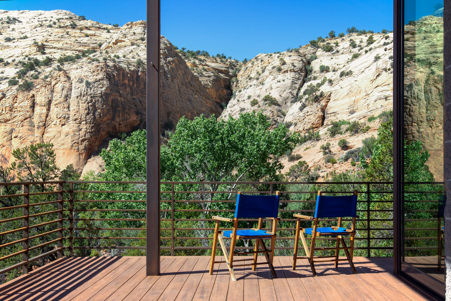 Główny priorytet był oczywisty. Należało uszanować istotę tego miejsca. Projekt wymagał wyjątkowej staranności, aby w jak najmniejszym stopniu naruszyć teren. W tym celu konstrukcja delikatnie spoczywa u podstawy urwiska, w miejscu styku skał i roślinności. Pomaga to zminimalizować efekt wizualny z daleka, zachowując jednocześnie spektakularne widoki na wnętrze. Wykorzystując wytrzymałe materiały odzwierciedlające tkaninę pustyni, konstrukcja w naturalny sposób wtapia się w otoczenie. Prosta forma jest dyskretna, ale uderzająca, wprowadzająca widoki, światło i bryzę z panoramy pustyni.