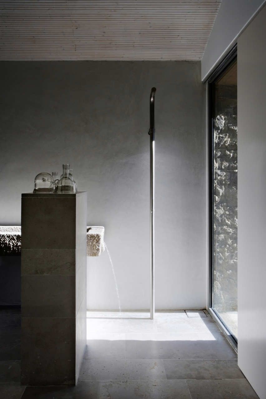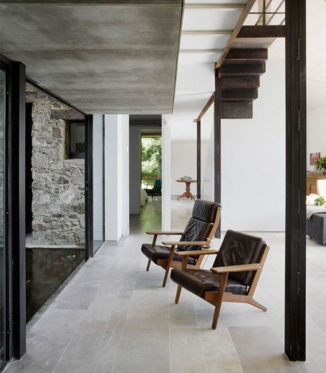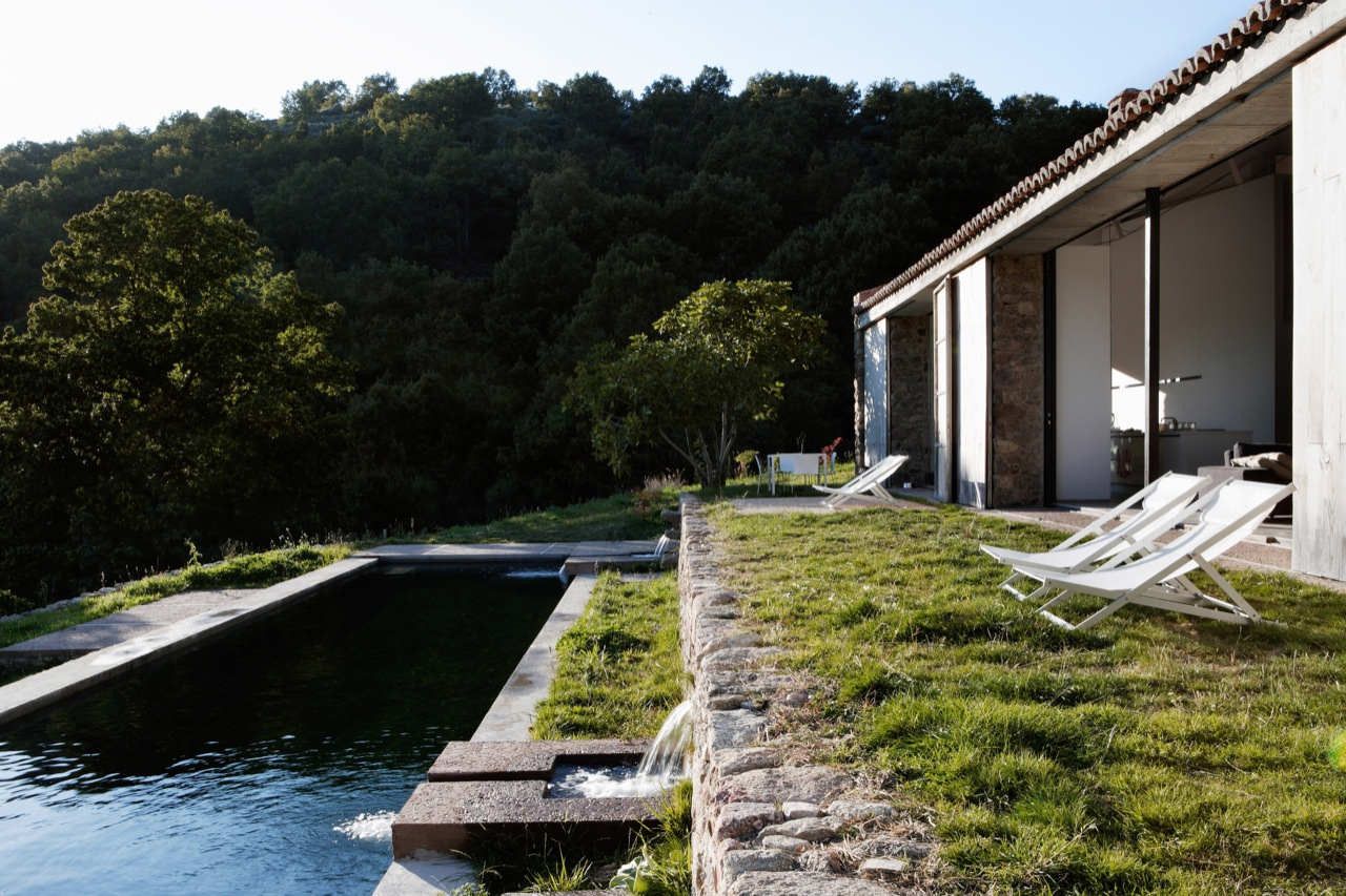 Ekologiczne systemy rozwiązały wyzwania związane z elektrycznością i wodą. Latem dom zasilają panele słoneczne z akumulatorami, a zimą energię zapewniają turbiny wykorzystujące dwa strumienie przepływające przez działkę. Projekt uwzględnia także możliwość obserwacji naturalnego przepływu wody z wnętrza budynku. Do budowy domu i basenu wykorzystano lokalny kamień, a wewnętrzne ściany nośne zastąpiono lekkimi metalowymi filarami, co nadało wnętrzom nowoczesny charakter. Dawny strych został zaadaptowany na sypialnie. Centralnym punktem domu jest dziedziniec, na którym zlokalizowano fontannę, wzmacniającą obecność wody jako kluczowego elementu przestrzeni.