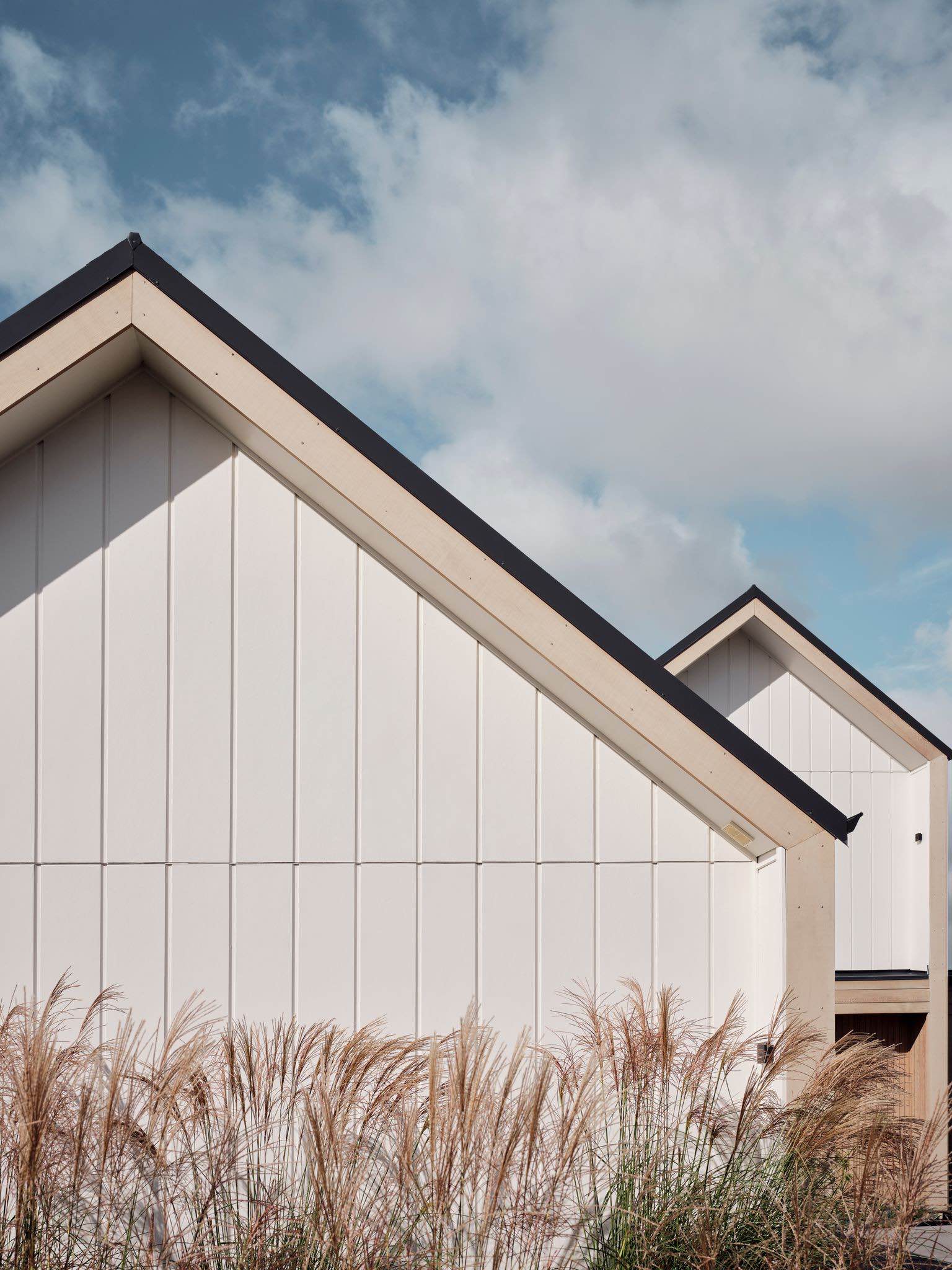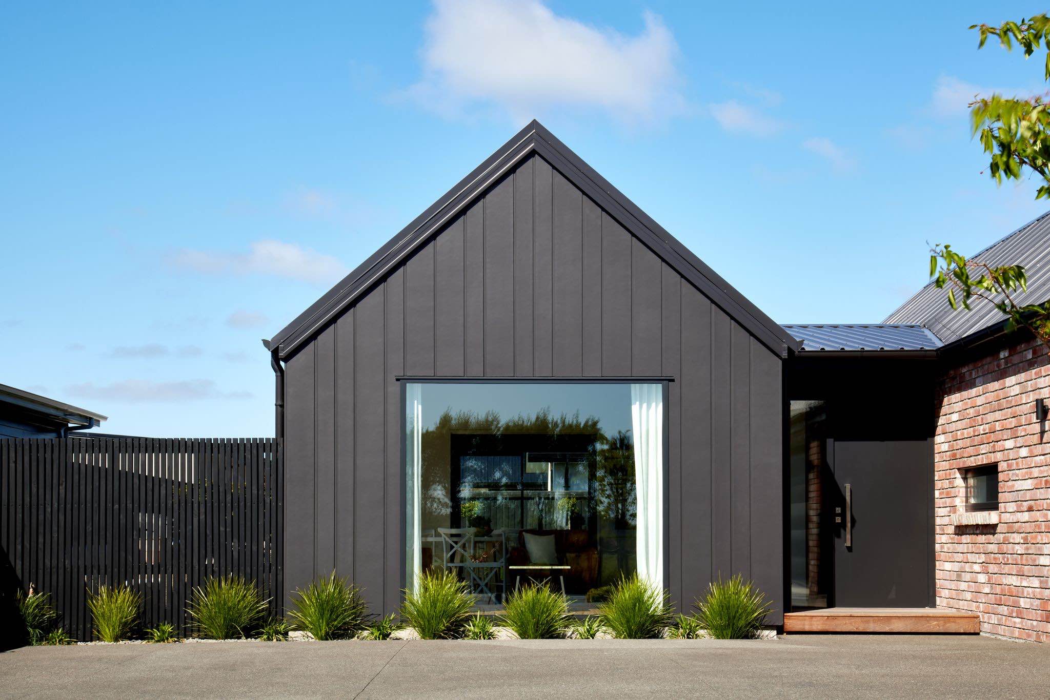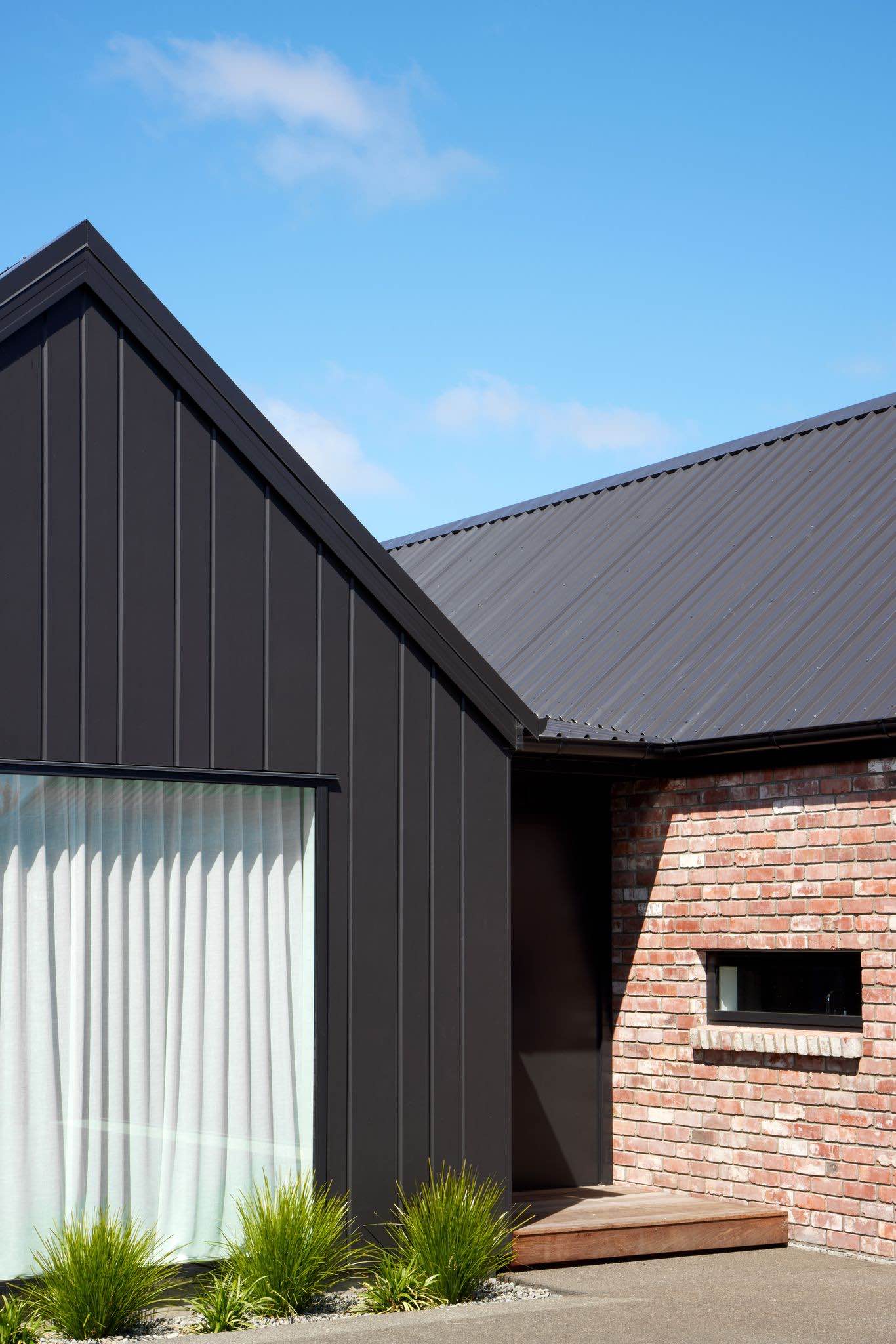 Elewacja domu łączy nowoczesne płyty Hardie™ Oblique™ Cladding w kolorze Resene Element z cegłą vintage, tworząc unikalny kontrast między nowym a starym, chłodem i ciepłem. W ciągu dnia budynek zmienia się wraz ze światłem – głębokie rowki płyt tworzą rytm cienia, który ożywia minimalistyczną formę i nadaje jej architektonicznej głębi.