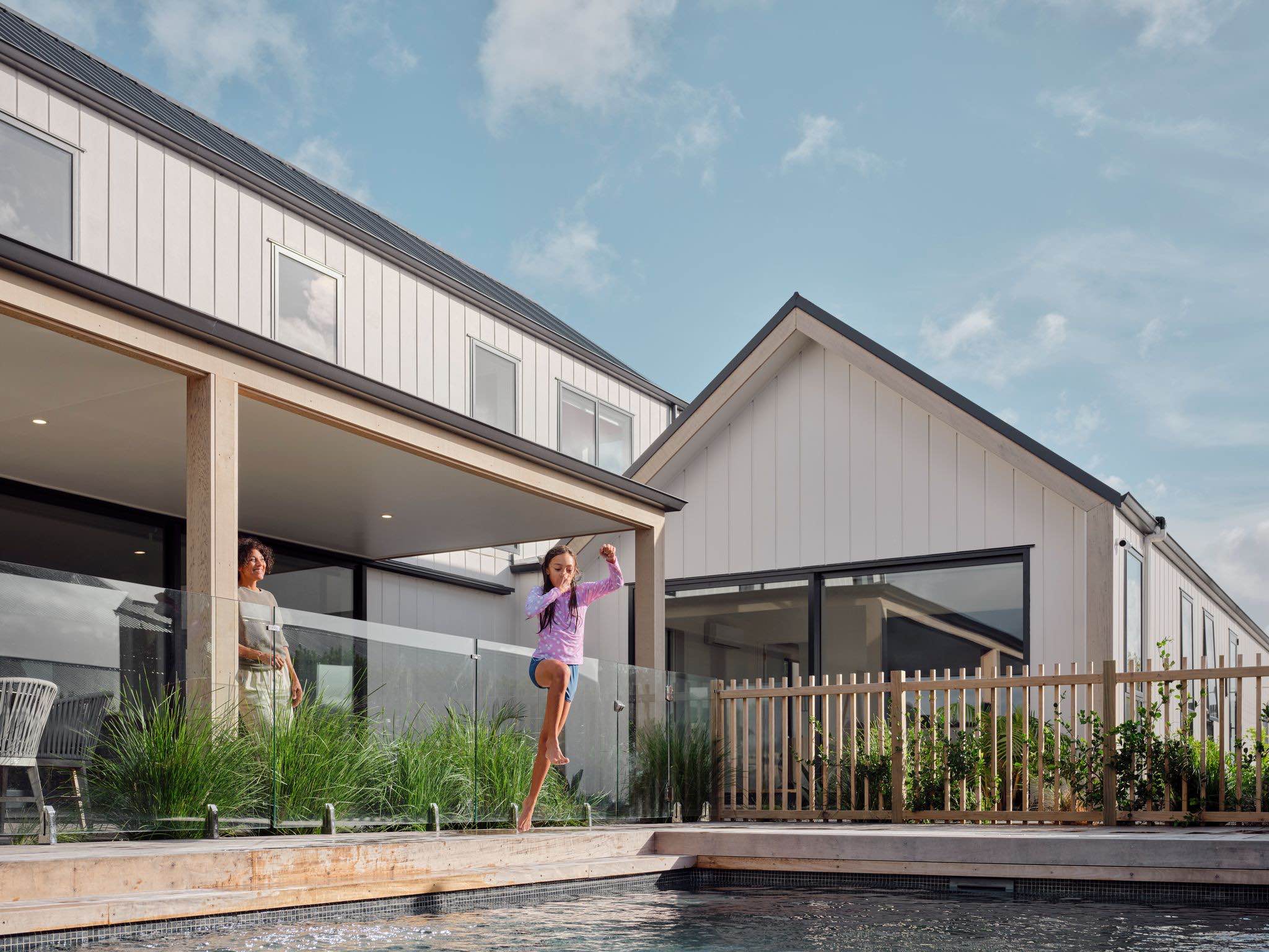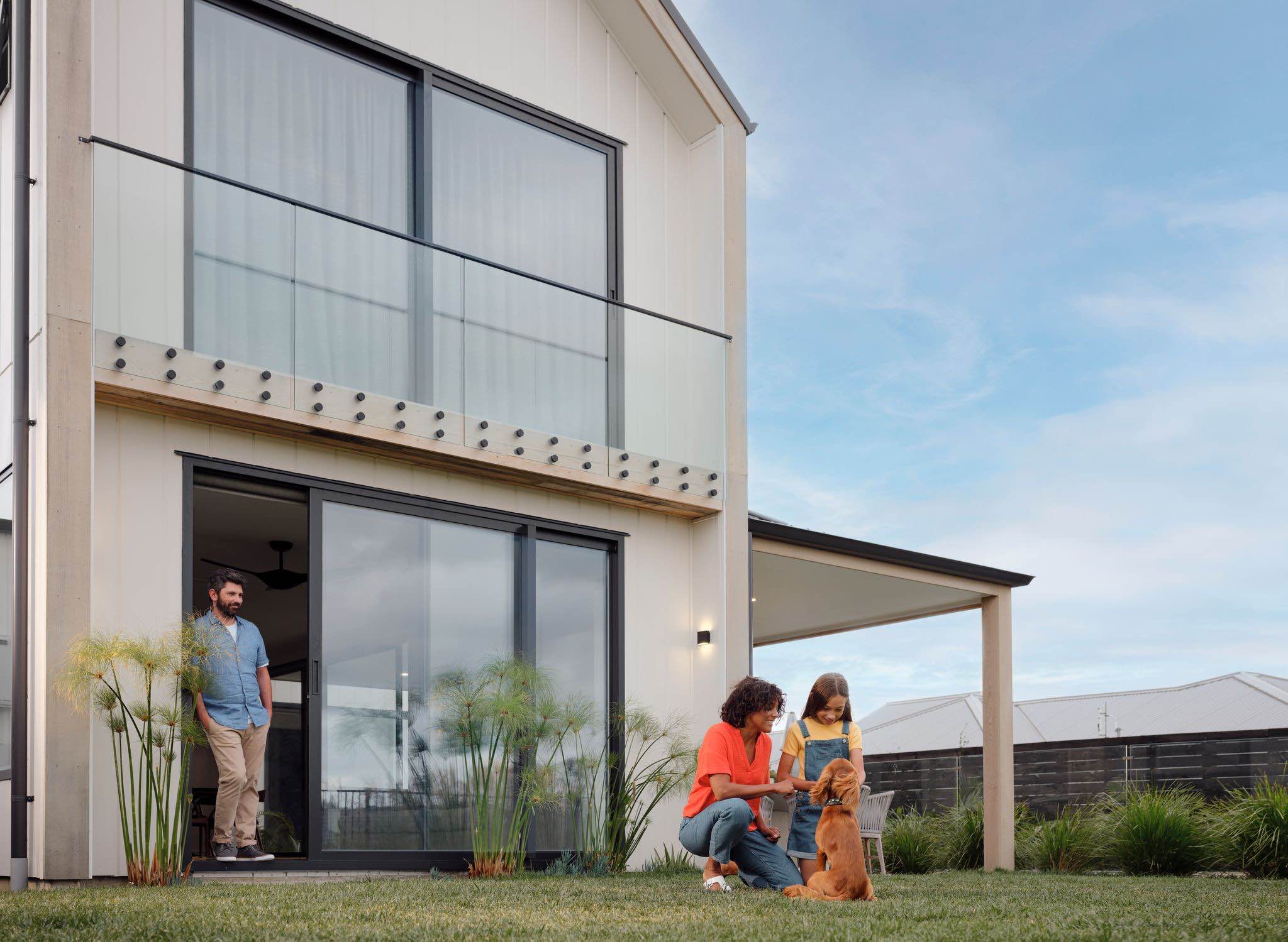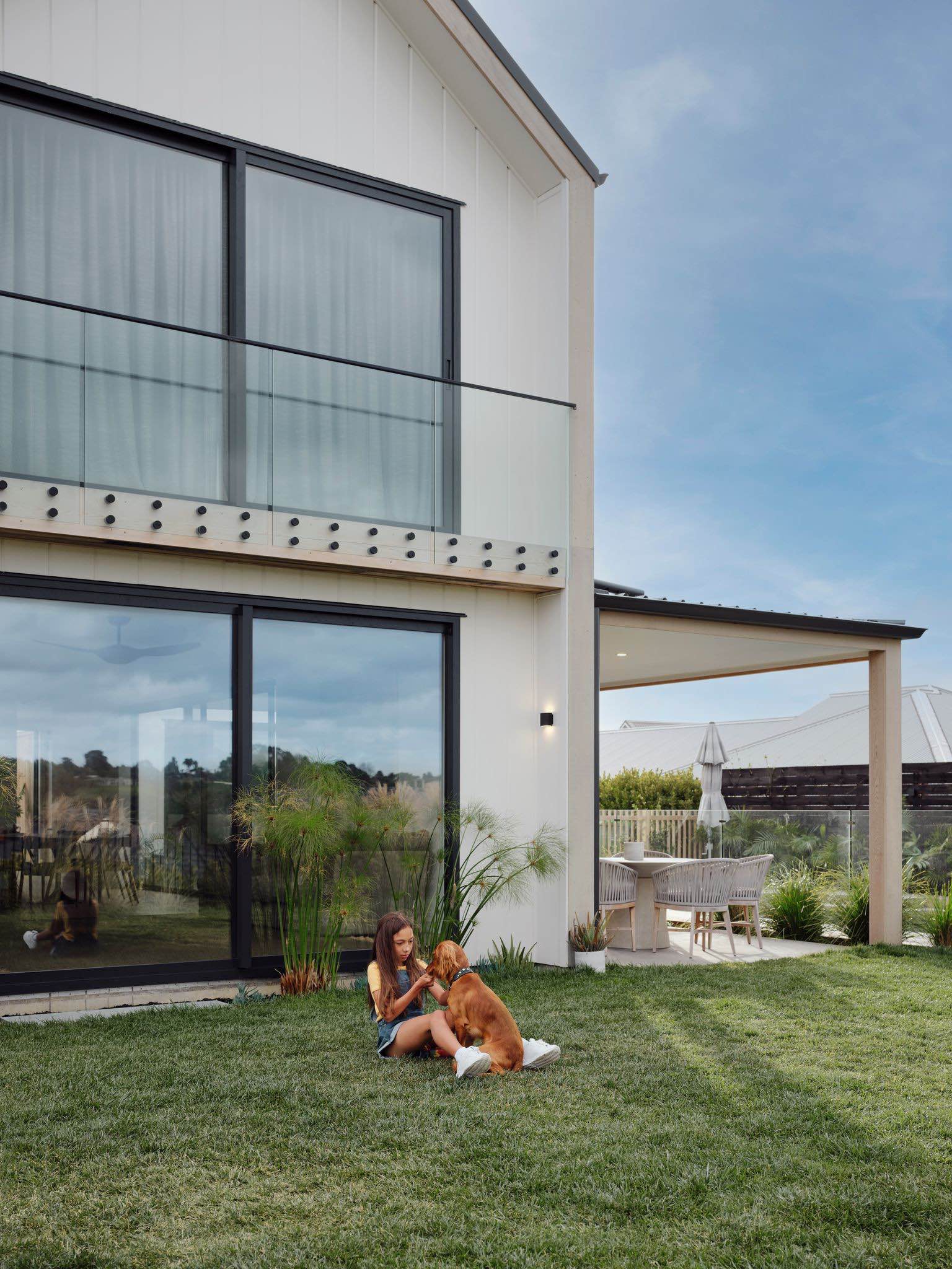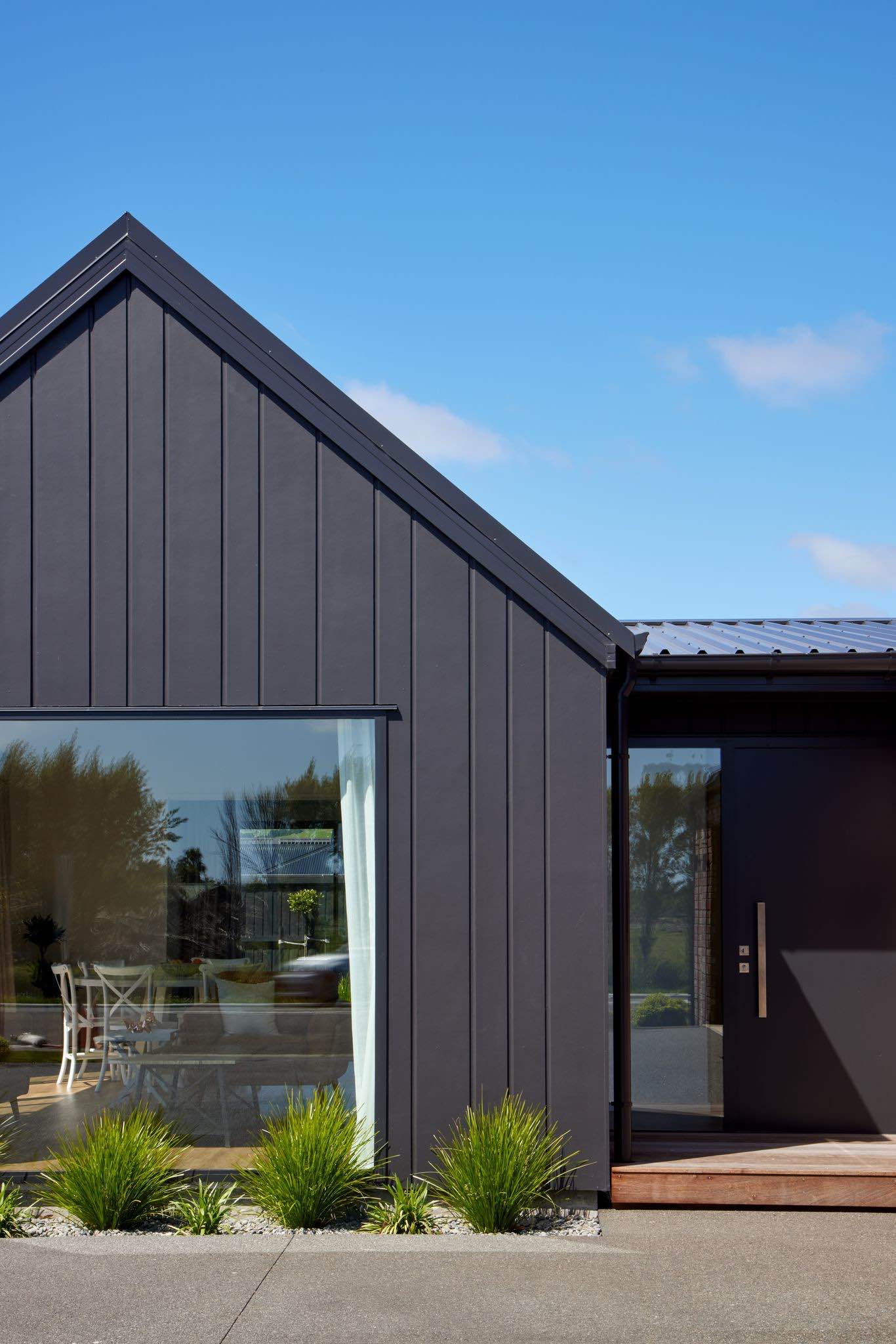 Elewacja domu łączy nowoczesne płyty Hardie™ Oblique™ Cladding w kolorze Resene Element z cegłą vintage, tworząc unikalny kontrast między nowym a starym, chłodem i ciepłem. W ciągu dnia budynek zmienia się wraz ze światłem – głębokie rowki płyt tworzą rytm cienia, który ożywia minimalistyczną formę i nadaje jej architektonicznej głębi.