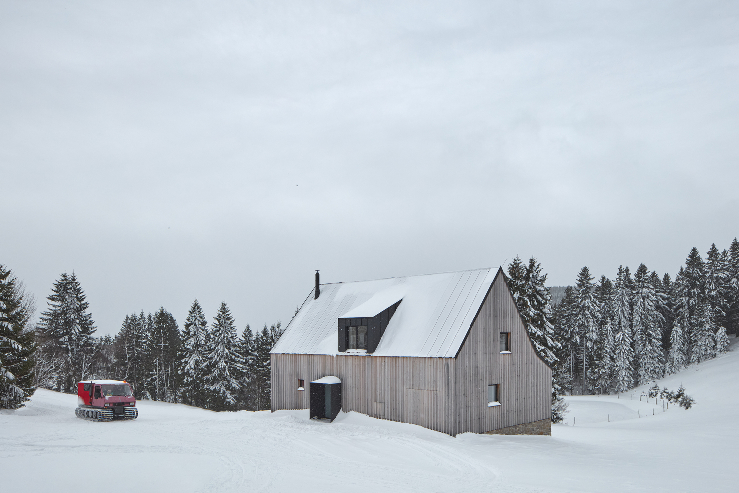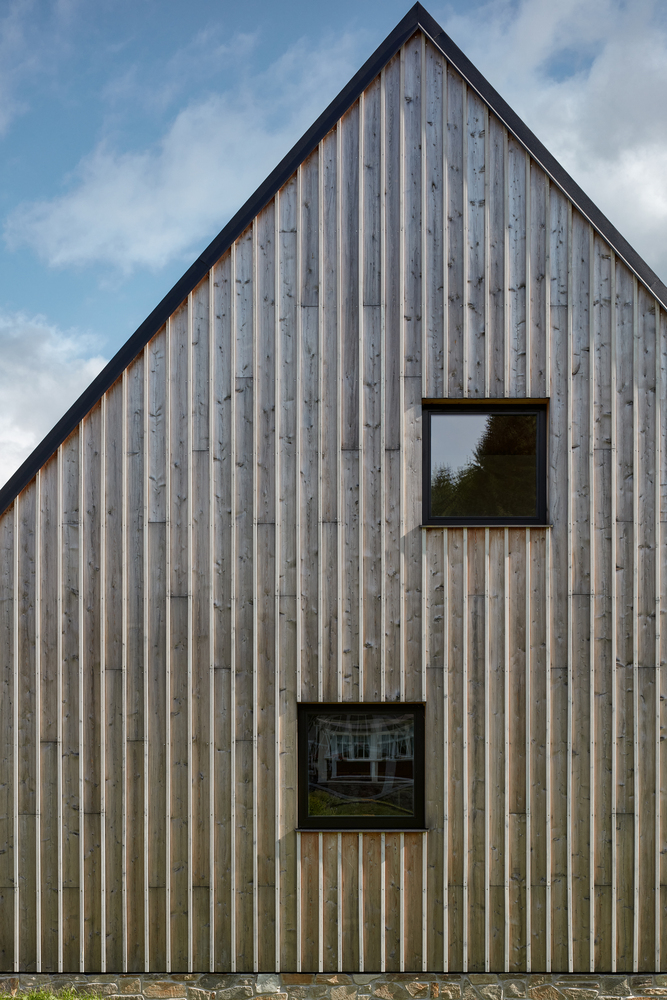Górna część nowoczesnej stodoły została obłożona nieimpregnowanym drewnem, które z czasem nabiera srebrzystoszarego odcienia. Jasne, białe listwy maskujące szczeliny elewacji kontrastują z naturalnym drewnem, tworząc elegancki i trwały wygląd, odporny na surowe warunki górskie.