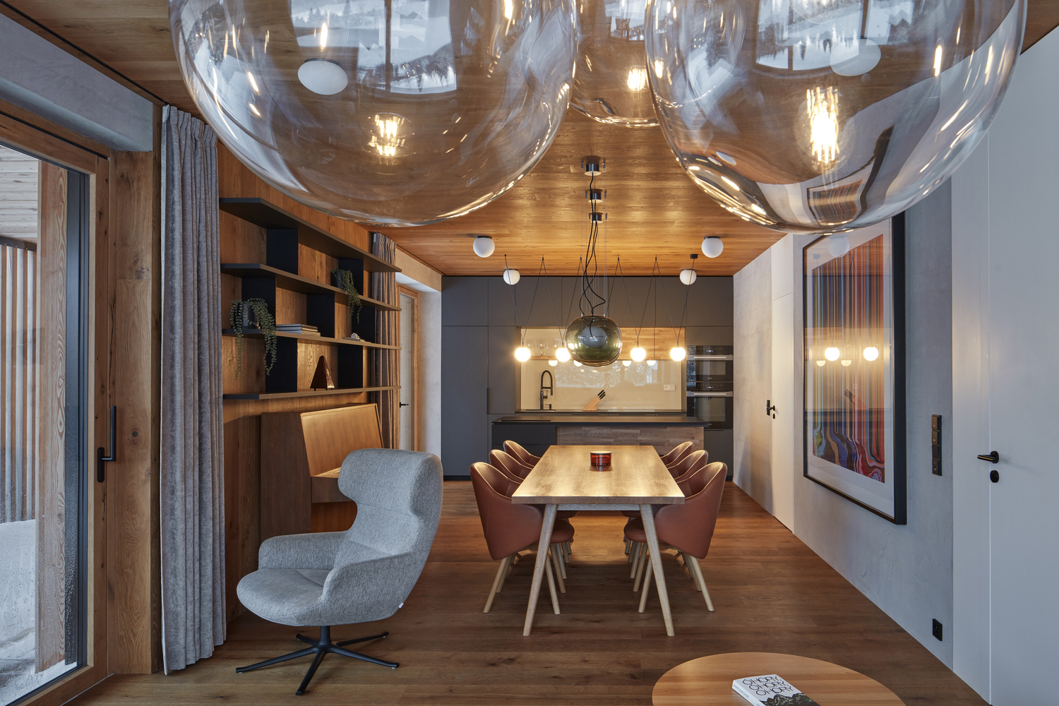 Wnętrze domu harmonizuje z jego skromnym, ale eleganckim charakterem. Drewno odgrywa tu główną rolę, uzupełnione stonowanymi kolorami oraz starannie dobranymi elementami rzemiosła i sztuki. Projekt wnętrza ma zapewnić rodzinie ciepłą, przyjazną atmosferę, która pozwala czuć się bezpiecznie nawet podczas najsurowszych górskich burz.