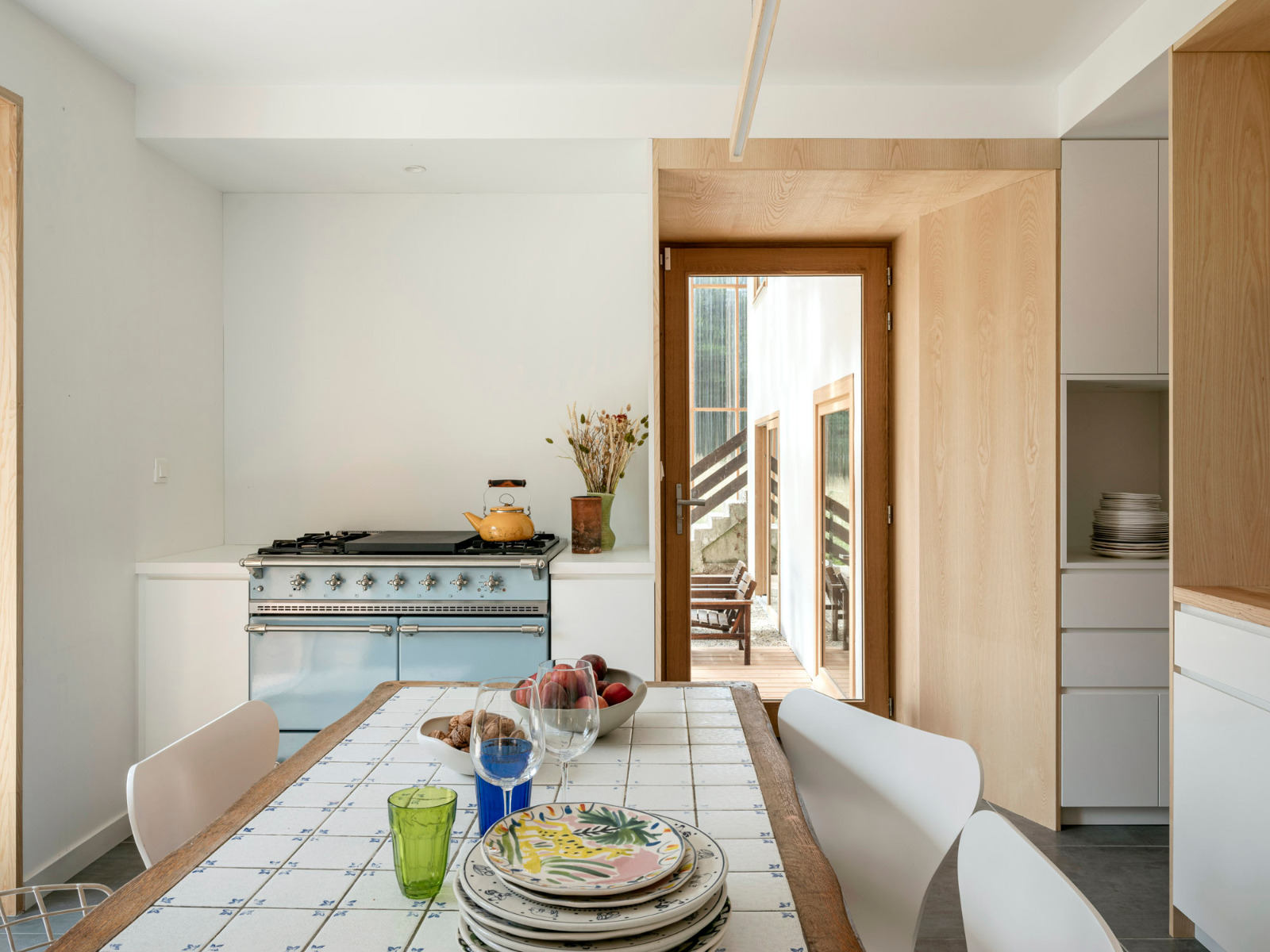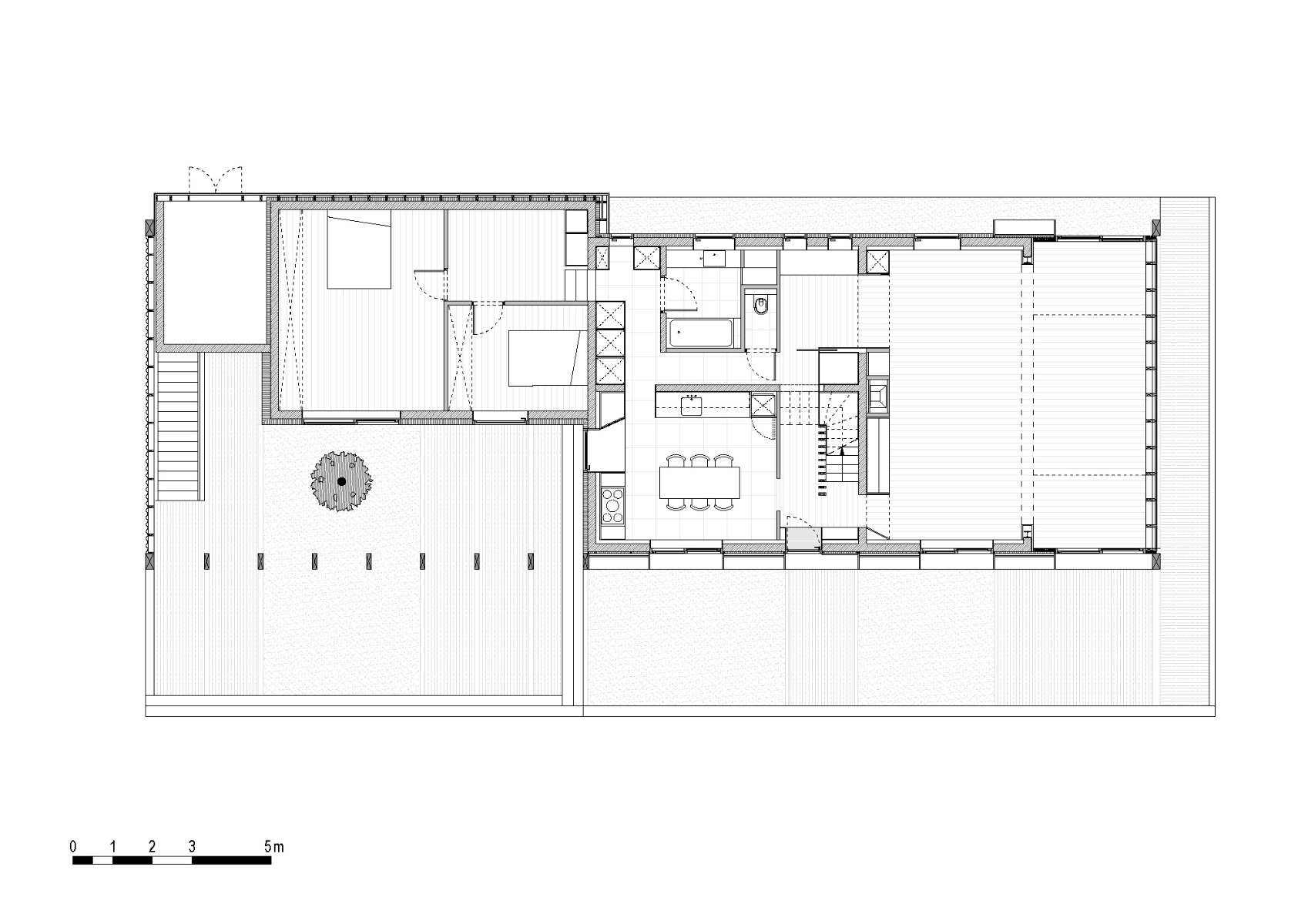 Układ wnętrza został całkowicie przeprojektowany. Od wschodu budynek zyskał kilkumetrowe przedłużenie, które pozwoliło na stworzenie przestronnego salonu z wysokimi przeszkleniami w elewacji szczytowej, otwierającymi wnętrze na otaczający krajobraz. Na piętrze, ażurowe żaluzje z listew drewnianych chronią sypialnię główną przed nadmiernym nasłonecznieniem i zapewniają prywatność.