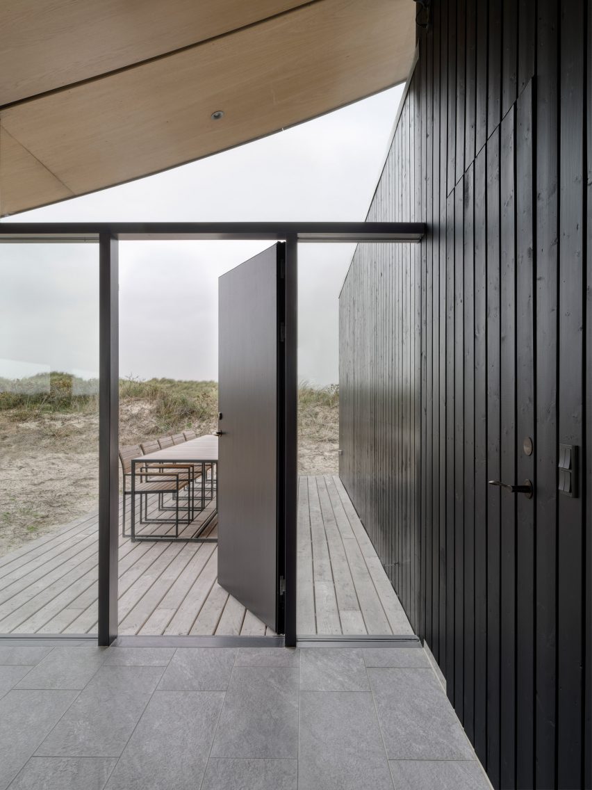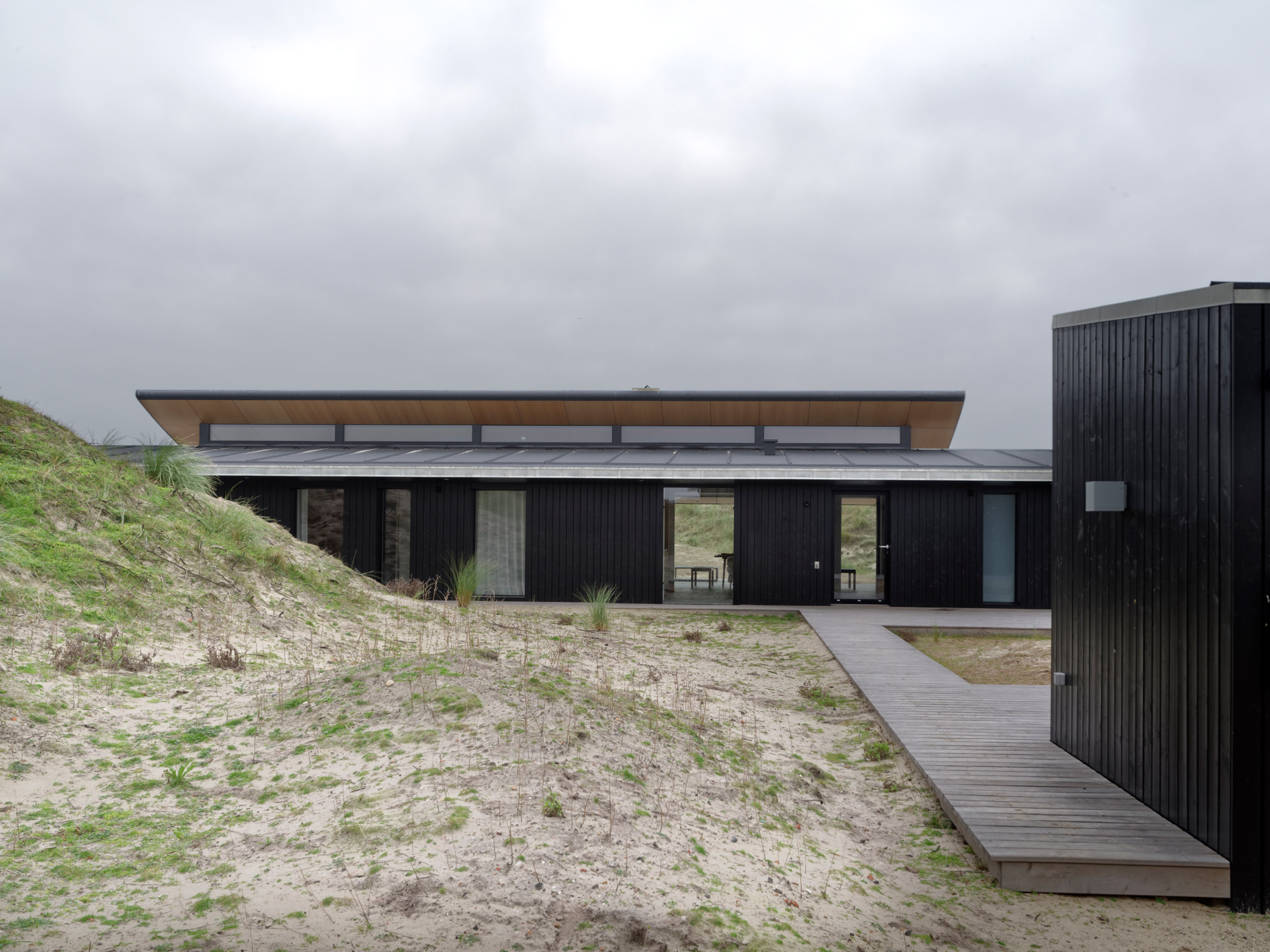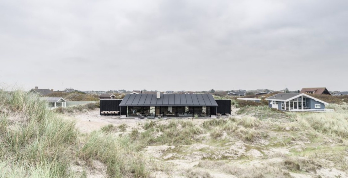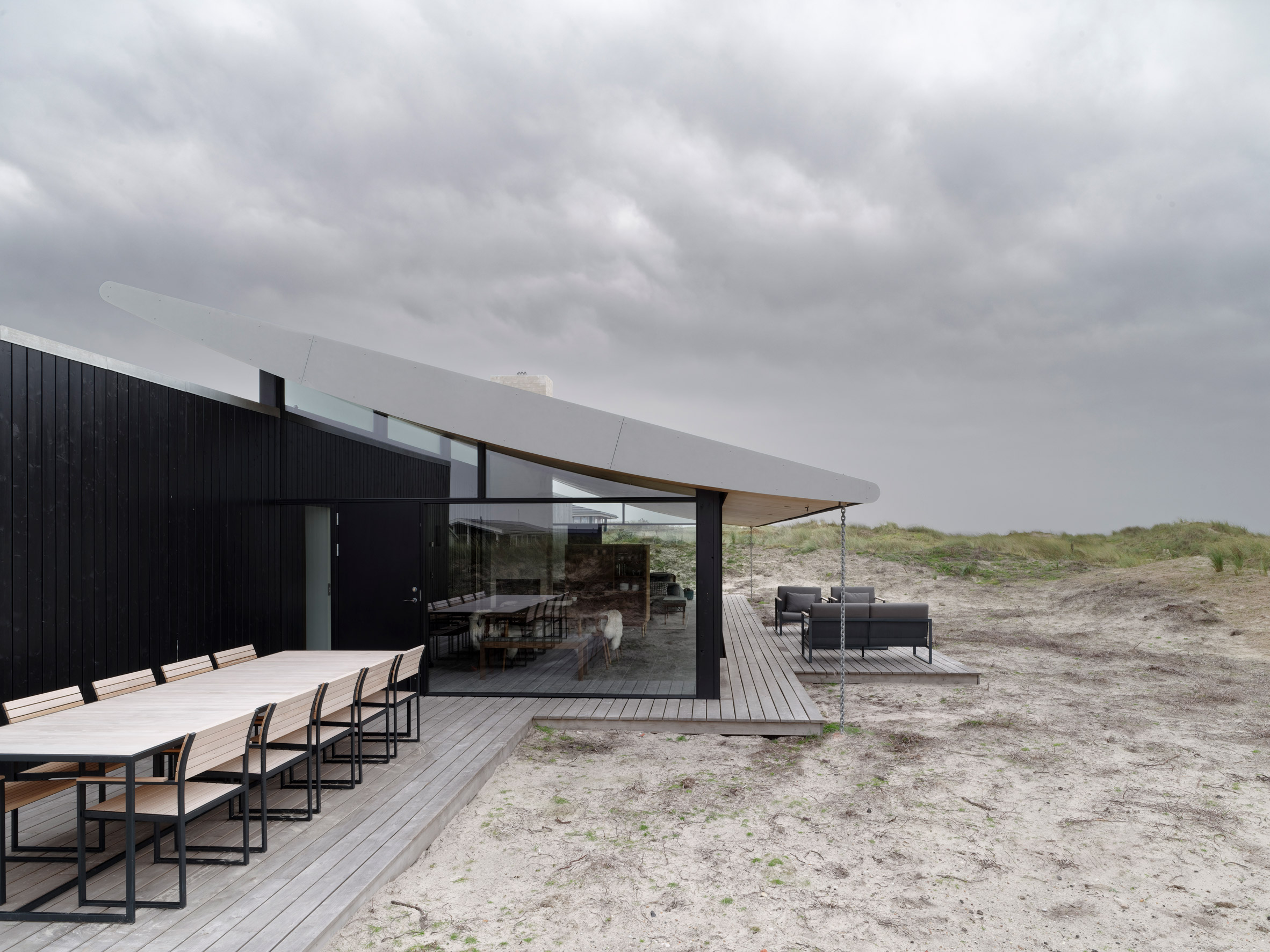 Dom na Fanø zaprojektowano z myślą o wykorzystaniu przestrzeni w cieplejszych miesiącach, dlatego prawie połowa powierzchni budynku została przeznaczona na przestronną, przeszkloną część dzienną. Pokryta ukośnym „pływającym” dachem, część ta nadaje całemu projektowi wyraźny, nowoczesny charakter, a samo przeszklone wnętrze można otworzyć, aby wprowadzić przestrzeń zewnętrzną do wnętrza. Skośny dach przylega do surowego, czarnego drewnianego bloku, w którym znajdują się sypialnie, łazienki i przestrzeń magazynowa. Taki układ zapewnia większą prywatność i intymność, a blok jest wyposażony w wąskie okna pełnowymiarowe oraz patio, które daje alternatywne podejście do domu.