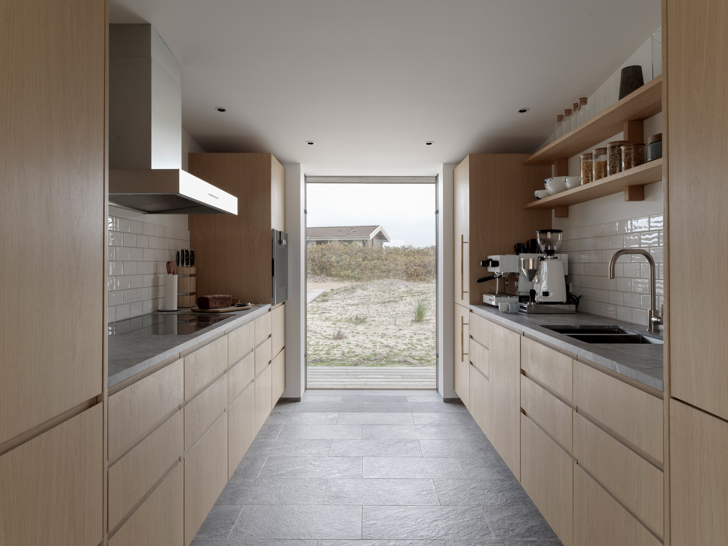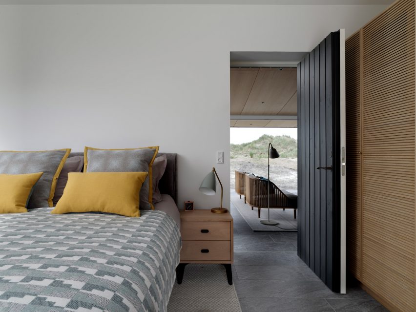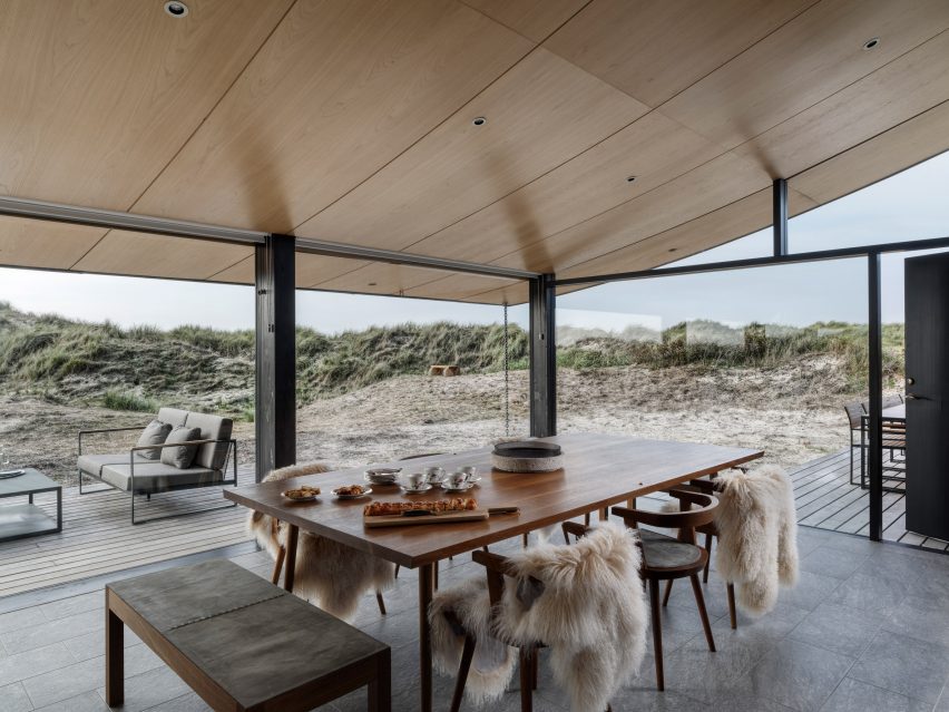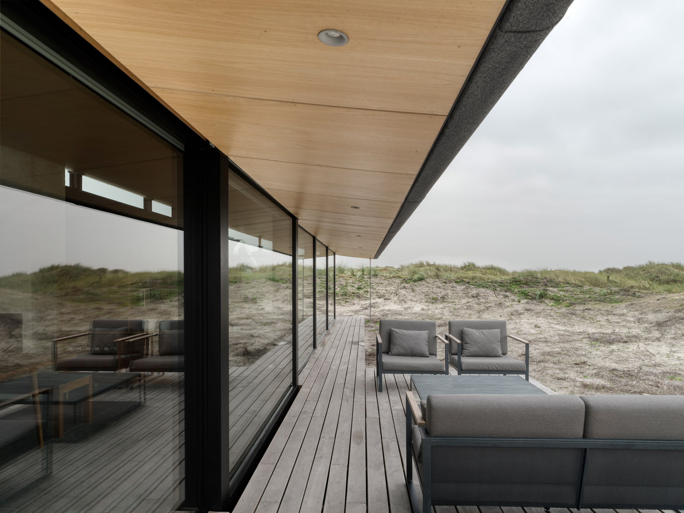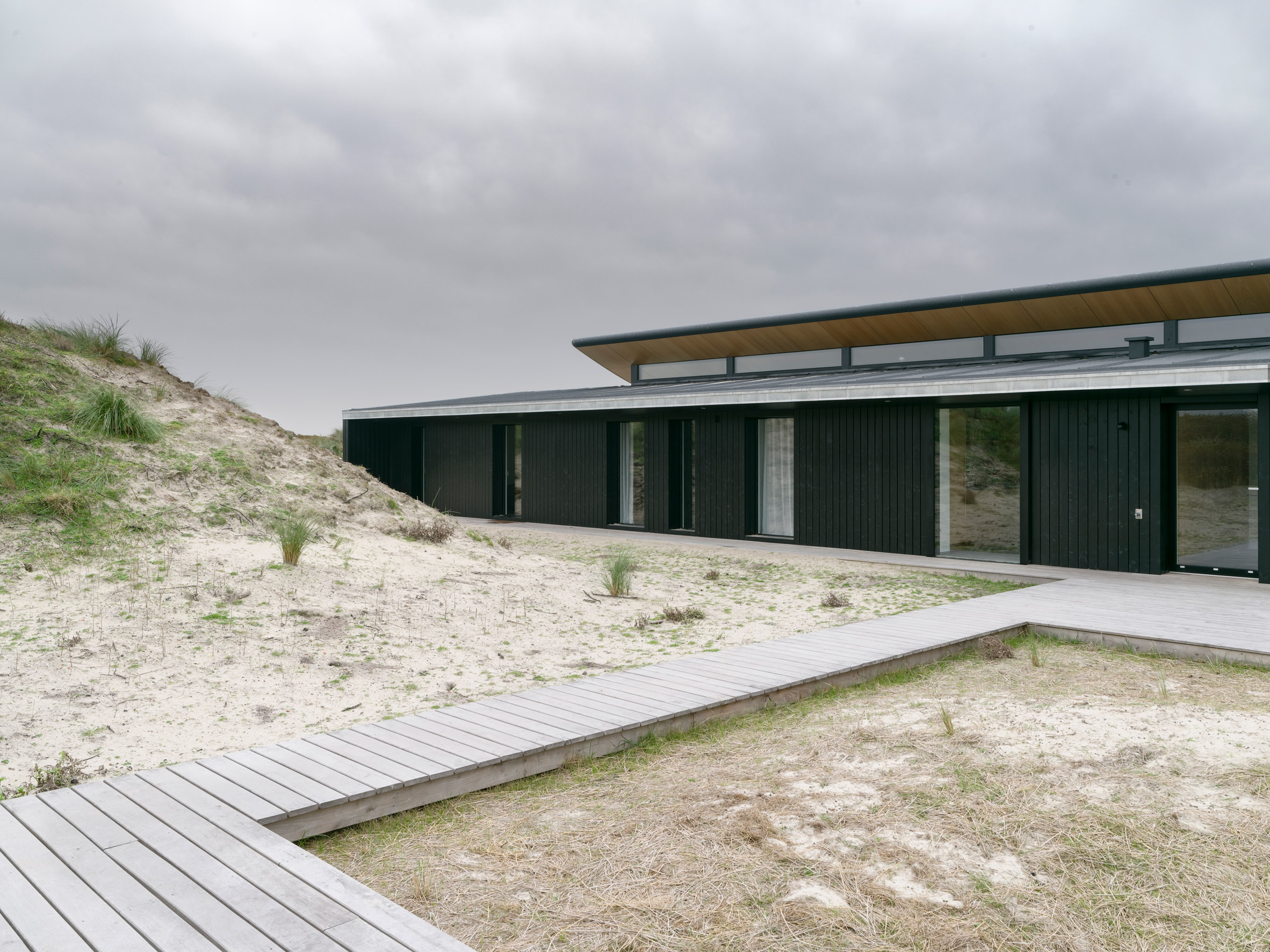 Dom na Fanø zaprojektowano z myślą o wykorzystaniu przestrzeni w cieplejszych miesiącach, dlatego prawie połowa powierzchni budynku została przeznaczona na przestronną, przeszkloną część dzienną. Pokryta ukośnym „pływającym” dachem, część ta nadaje całemu projektowi wyraźny, nowoczesny charakter, a samo przeszklone wnętrze można otworzyć, aby wprowadzić przestrzeń zewnętrzną do wnętrza. Skośny dach przylega do surowego, czarnego drewnianego bloku, w którym znajdują się sypialnie, łazienki i przestrzeń magazynowa. Taki układ zapewnia większą prywatność i intymność, a blok jest wyposażony w wąskie okna pełnowymiarowe oraz patio, które daje alternatywne podejście do domu.