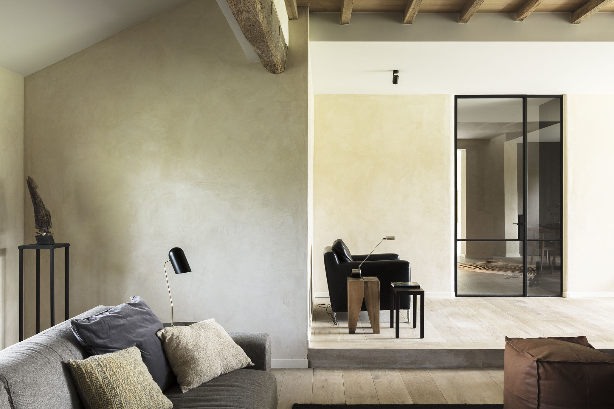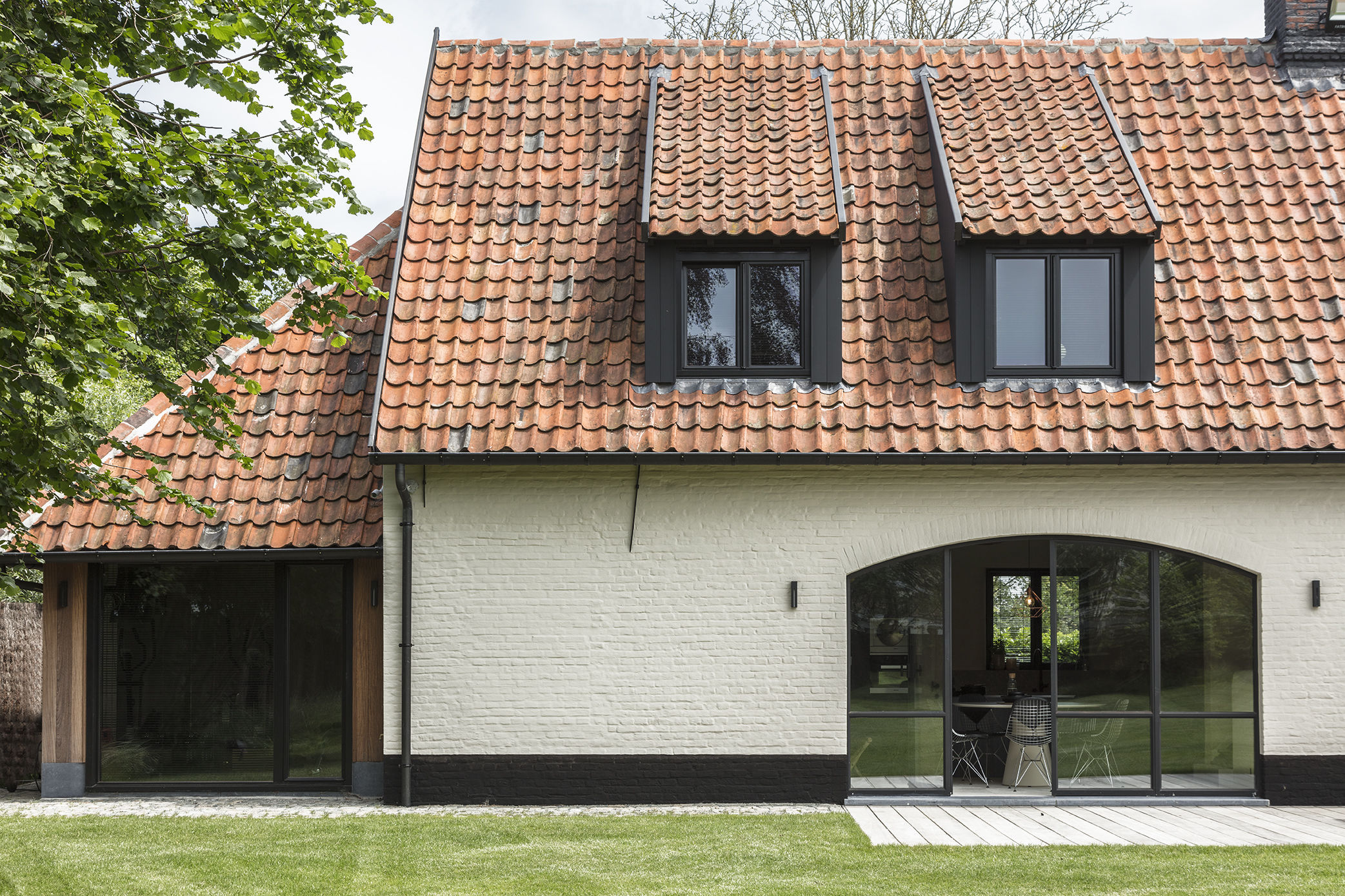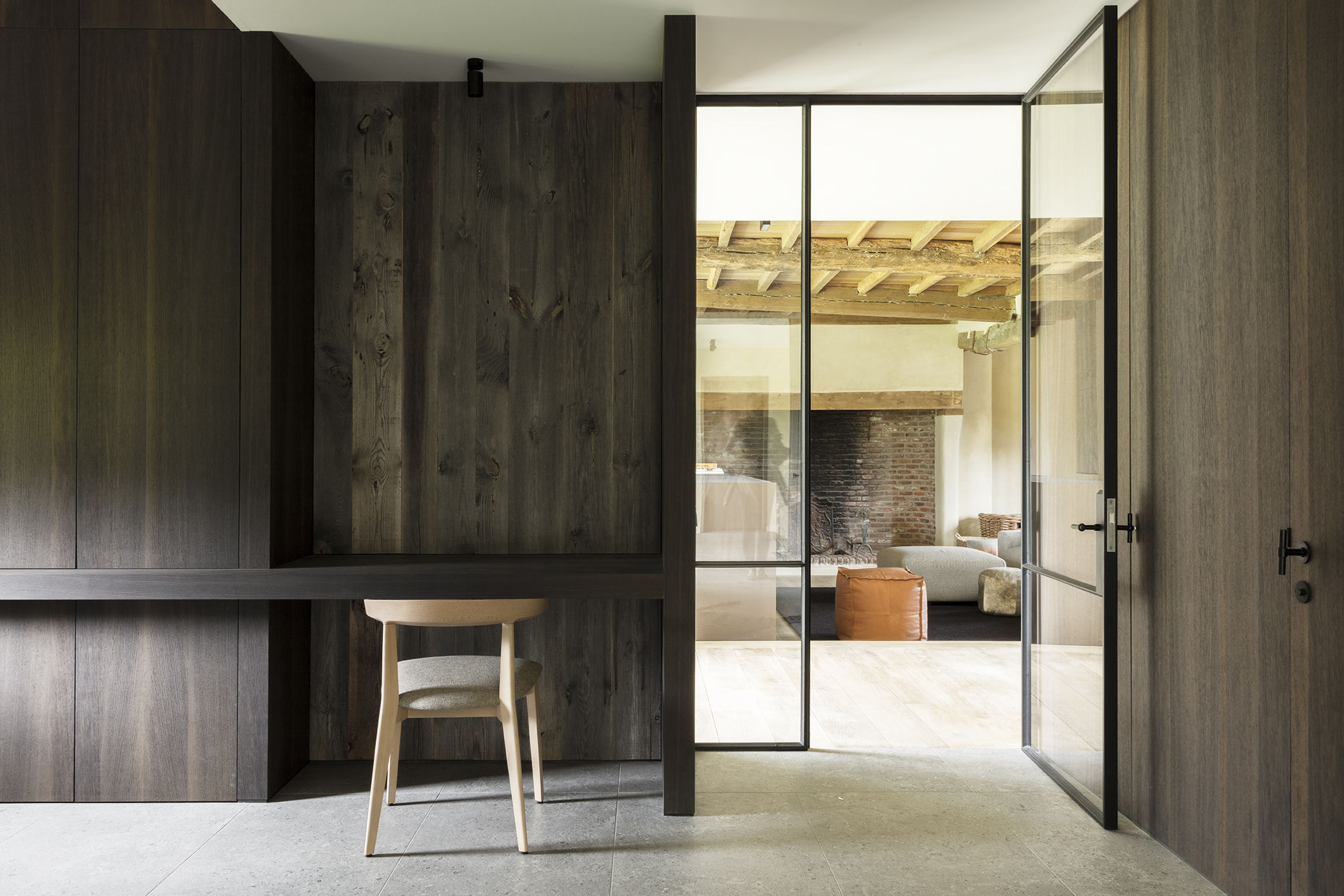 Fasada zyskała rytm dzięki drobnym okienkom i dużym, łukowym przeszkleniom z kutego żelaza, które zapewniają naturalne światło. Aneks kuchenny zburzono, a w jego miejscu powstała nowa, drewniana bryła, mieszcząca salę fitness. Jej otwarta konstrukcja nawiązuje do stylistyki nowoczesnej stodoły, oferując przestronność mimo niewielkiej powierzchni.