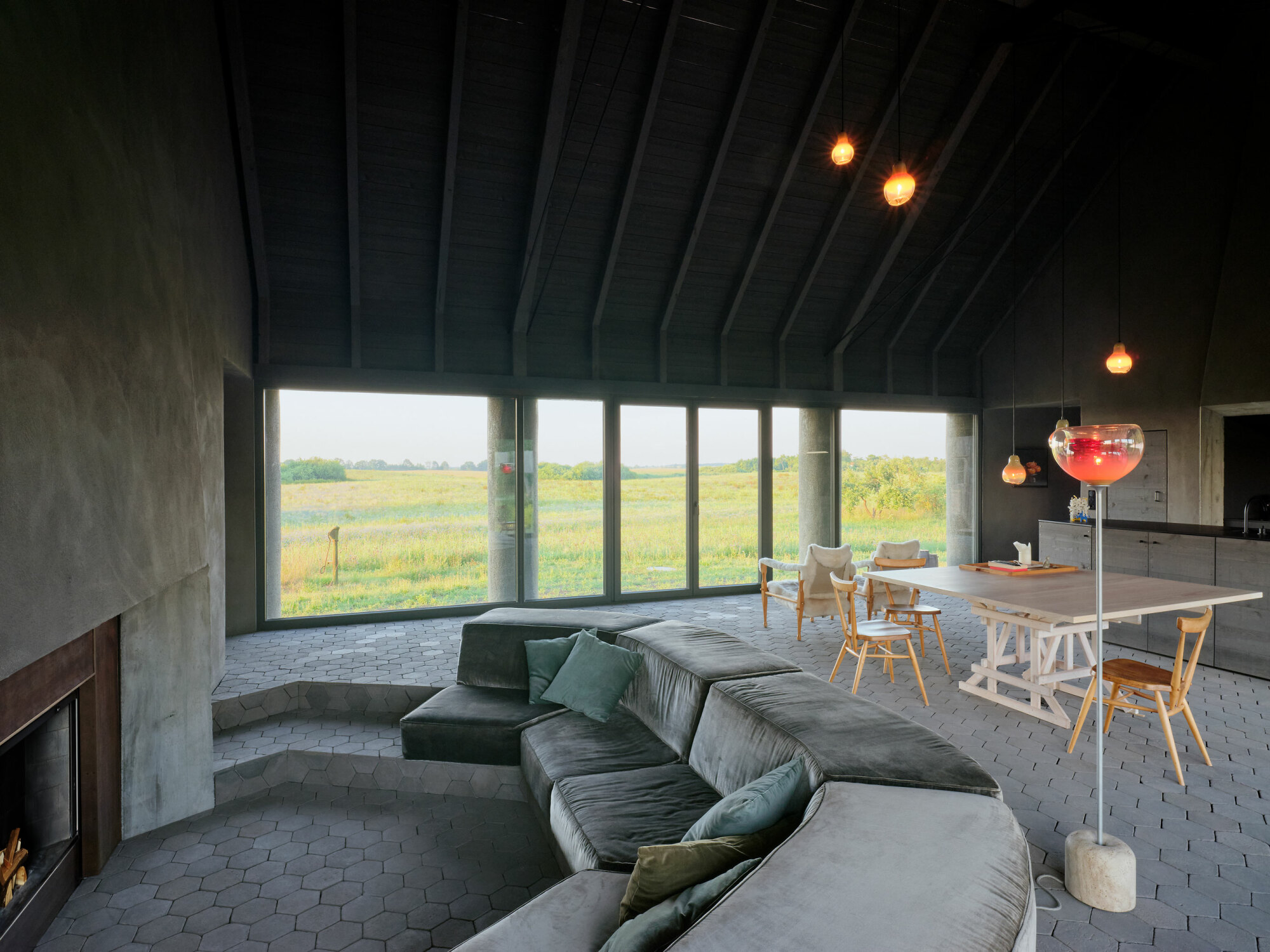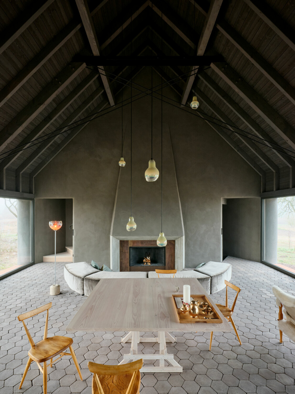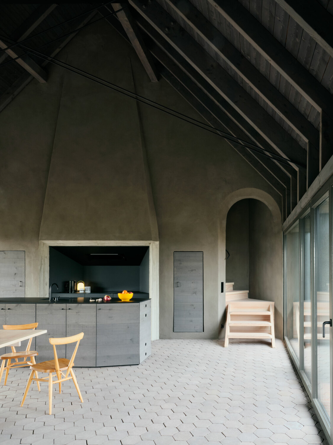 Wnętrze zostało całkowicie otwarte i uproszczone. Usunięcie stropów pozwoliło wykorzystać pełną wysokość dachu, dzięki czemu przestrzeń zyskała lekkość i oddech. Duże przeszklenia wprowadzają do środka światło oraz widoki na otaczający krajobraz, a naturalna paleta materiałów – drewno, kamień i jasne tynki – buduje spokojną, ponadczasową atmosferę.