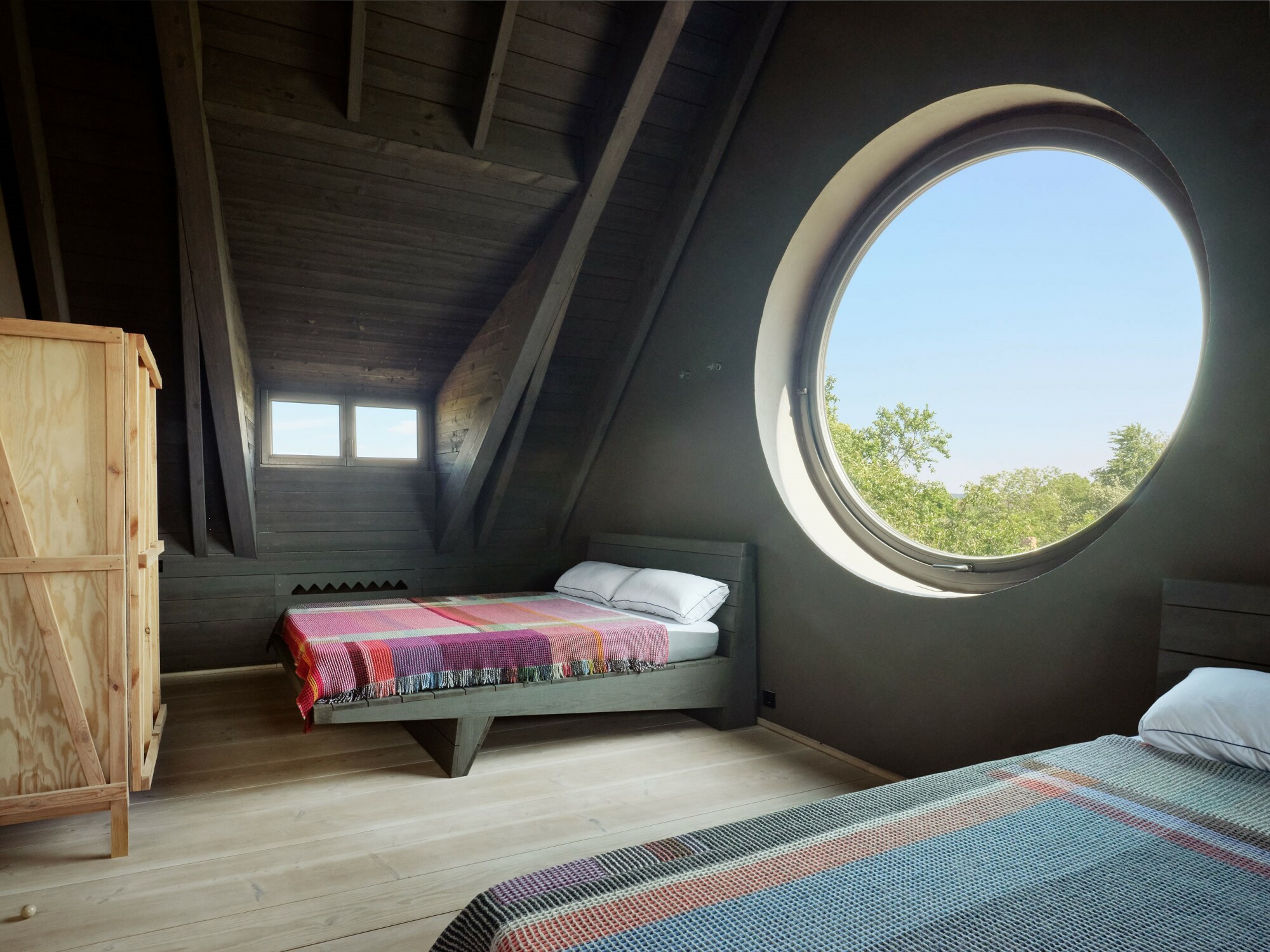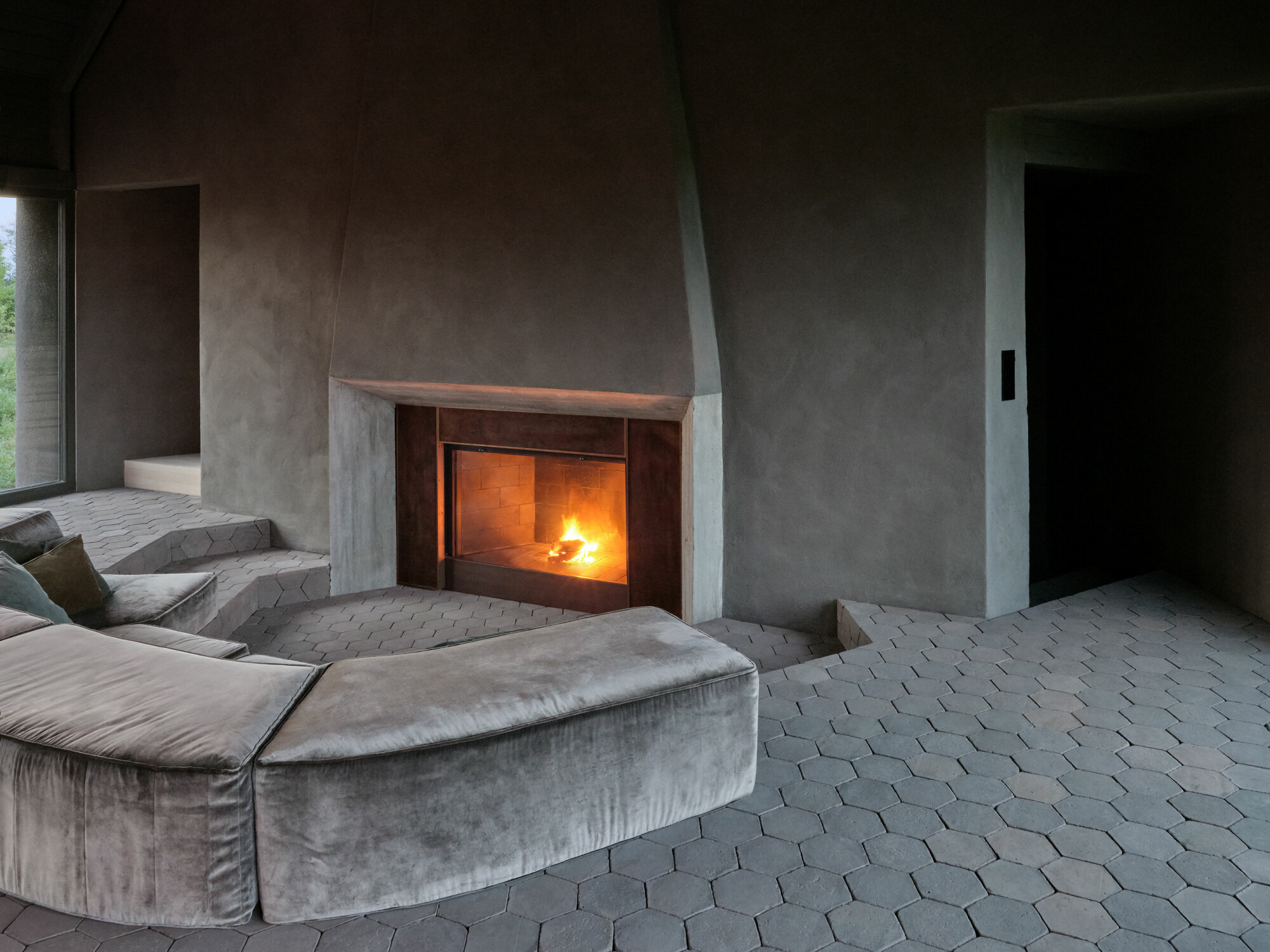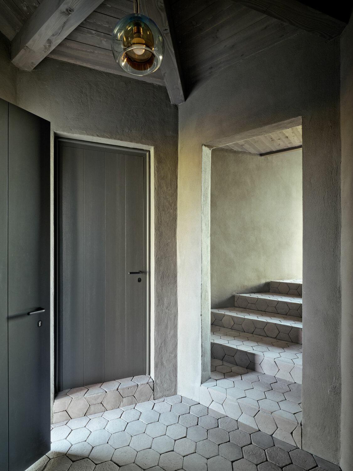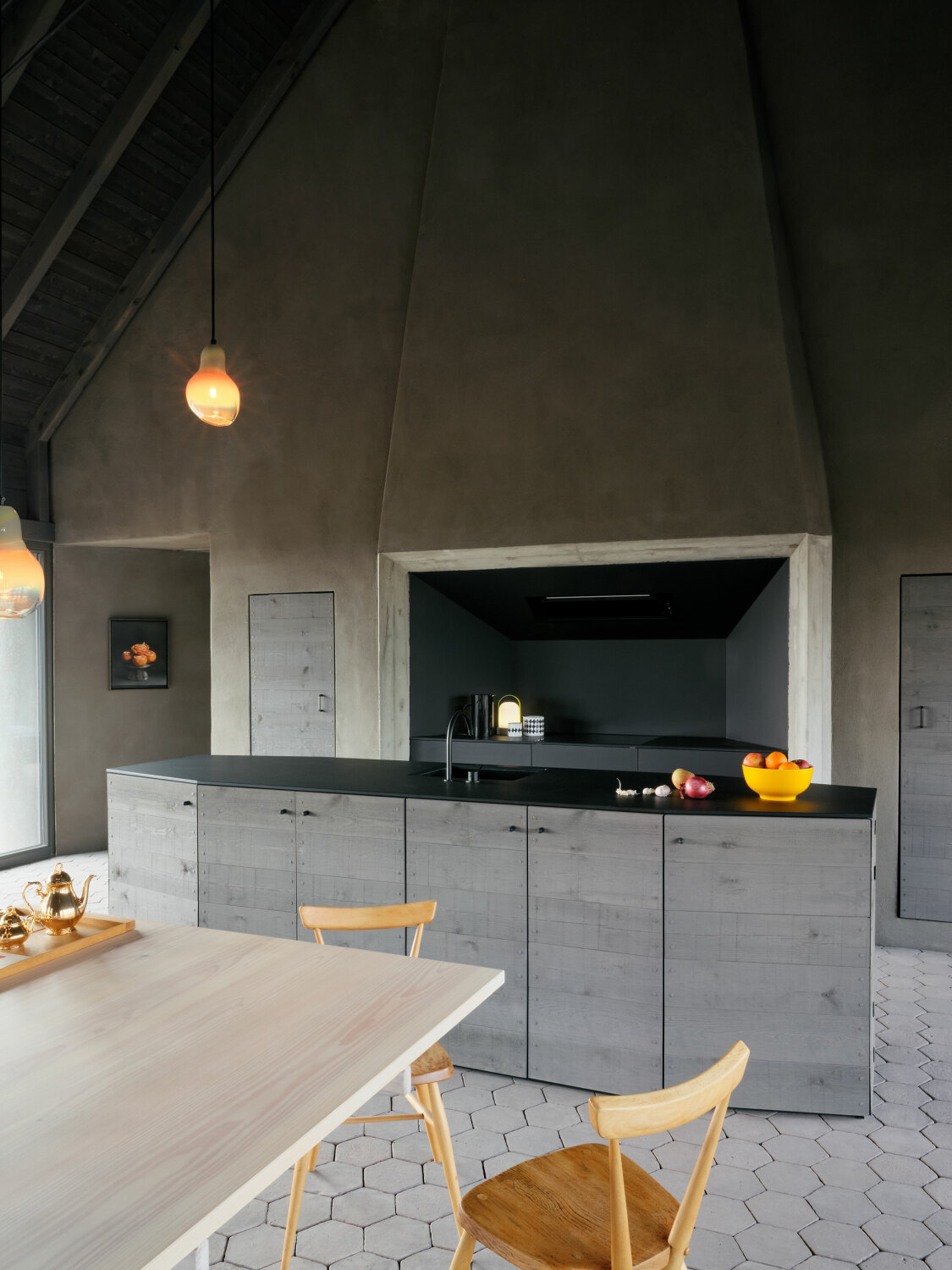 Wnętrze zostało całkowicie otwarte i uproszczone. Usunięcie stropów pozwoliło wykorzystać pełną wysokość dachu, dzięki czemu przestrzeń zyskała lekkość i oddech. Duże przeszklenia wprowadzają do środka światło oraz widoki na otaczający krajobraz, a naturalna paleta materiałów – drewno, kamień i jasne tynki – buduje spokojną, ponadczasową atmosferę.