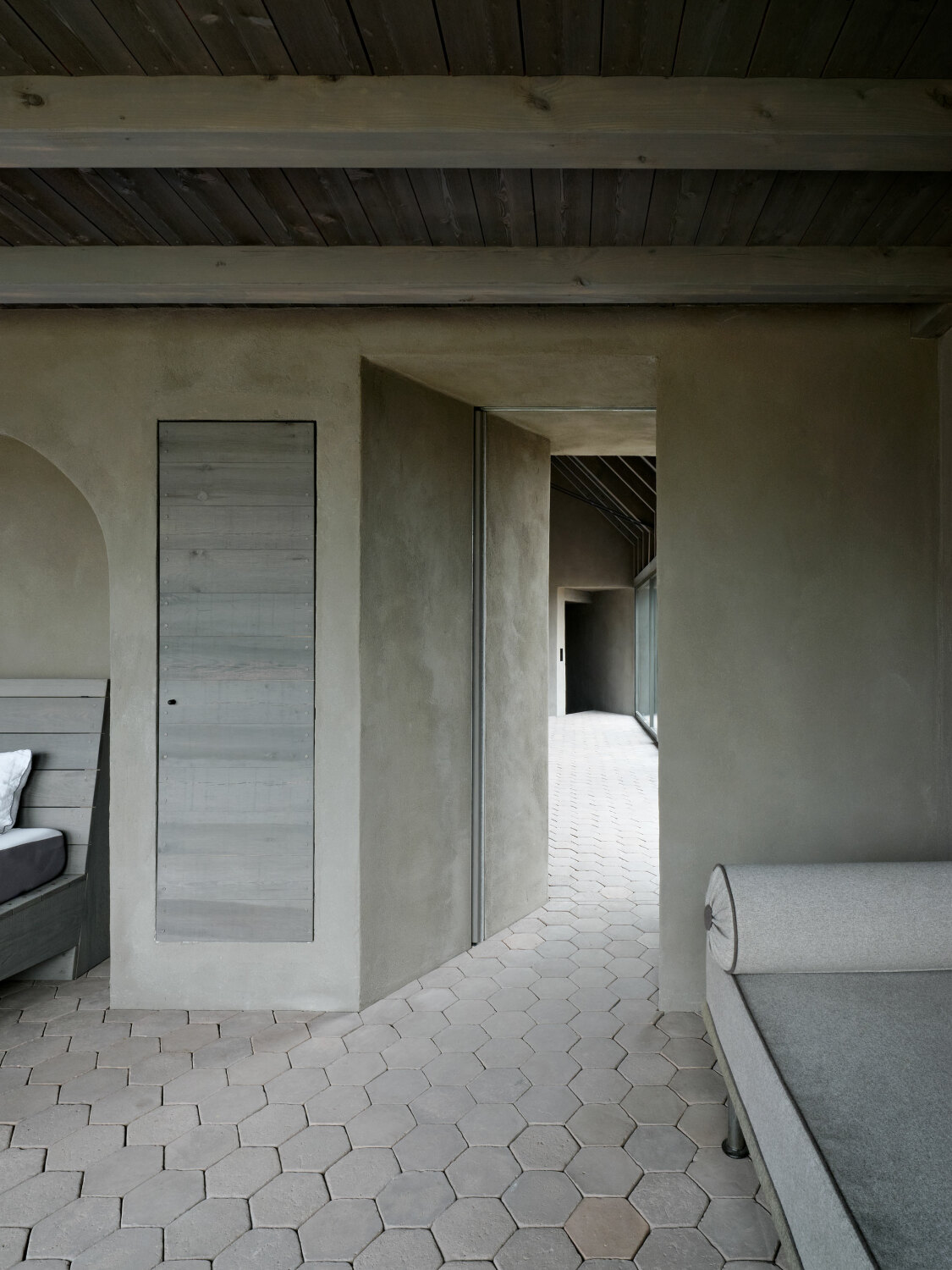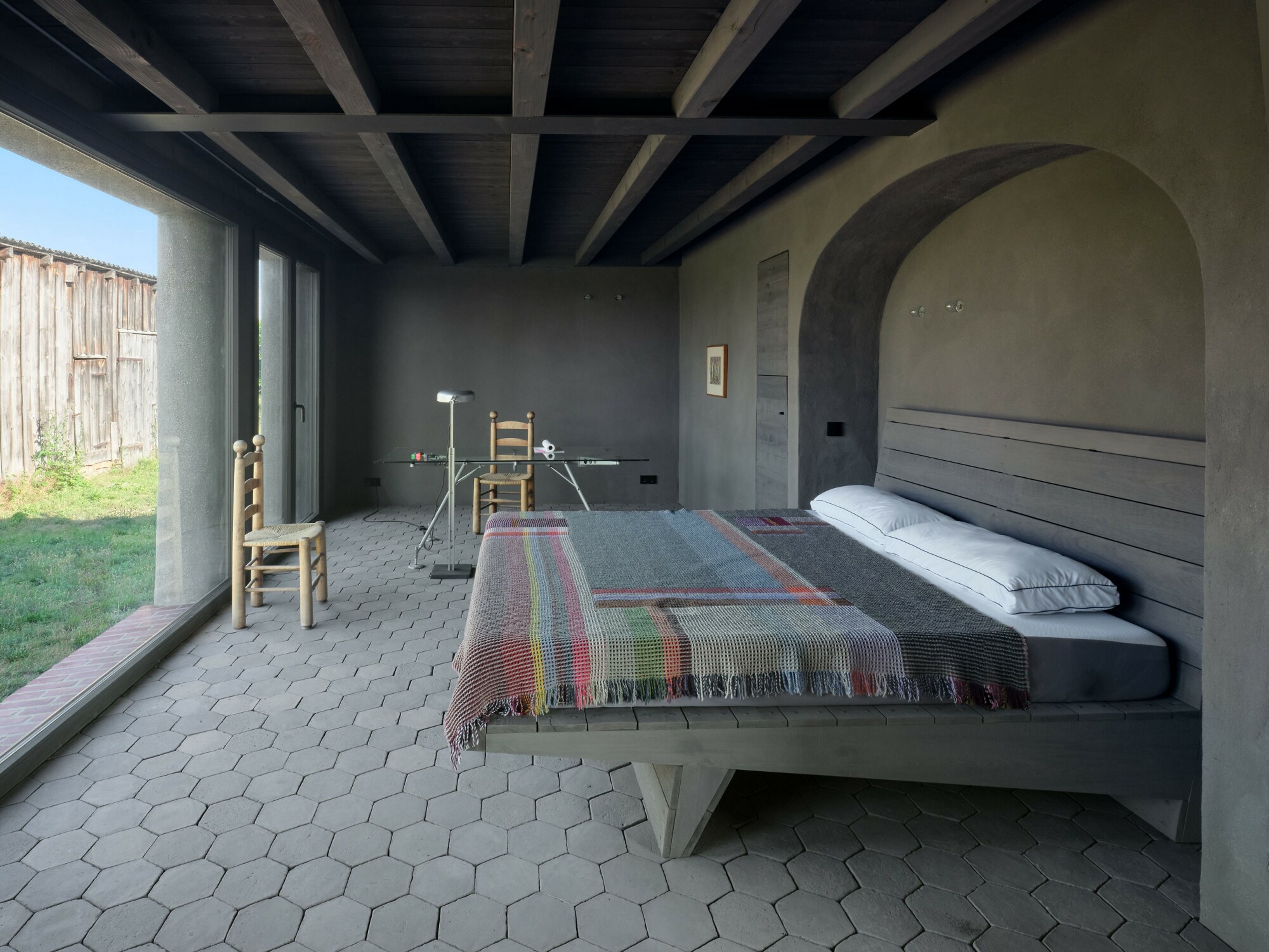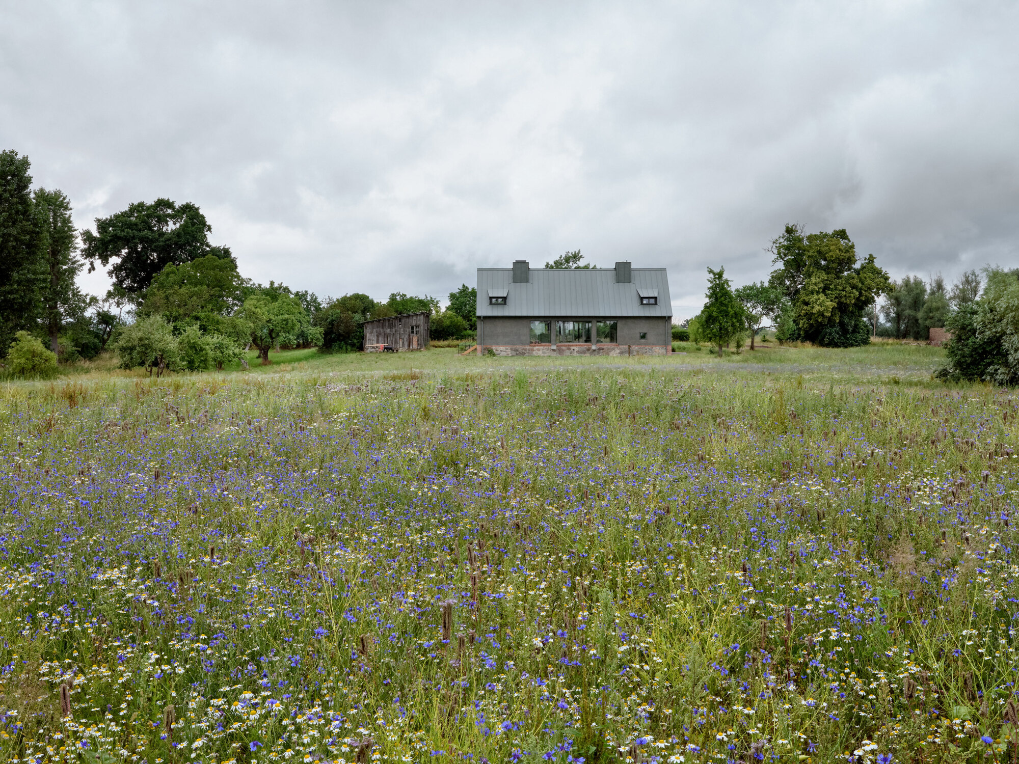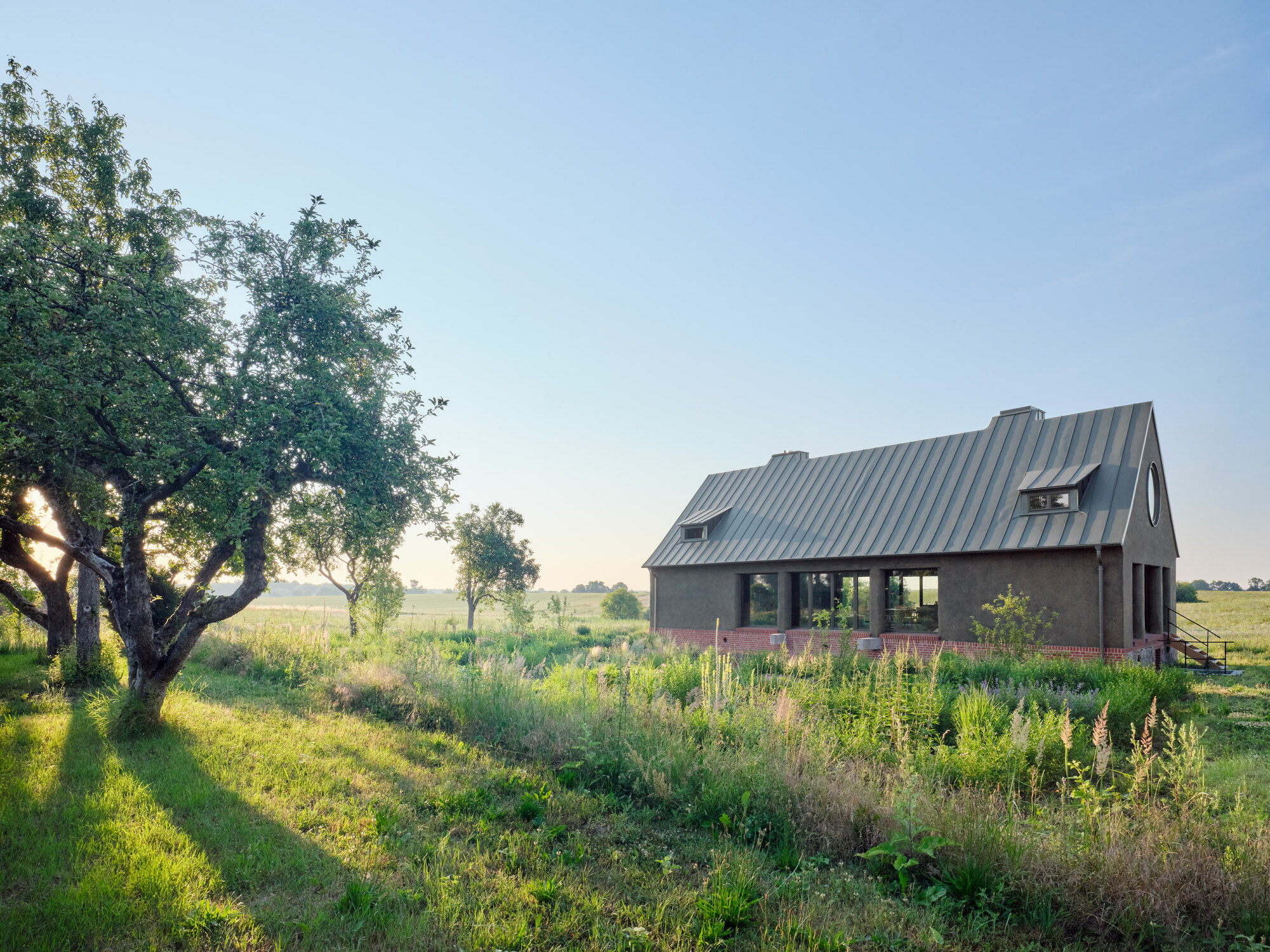 Dużą rolę odgrywa relacja między starą a nową częścią. Zamiast ostrego kontrastu, projekt opiera się na harmonii i ciągłości. Różne materiały – cegła w części historycznej i drewno w nowej – podkreślają ich odmienność, ale jednocześnie wpisują się w ten sam wiejski kontekst. Dzięki temu całość sprawia wrażenie naturalnie rozwijającego się gospodarstwa, a nie zestawienia dwóch obcych sobie brył.