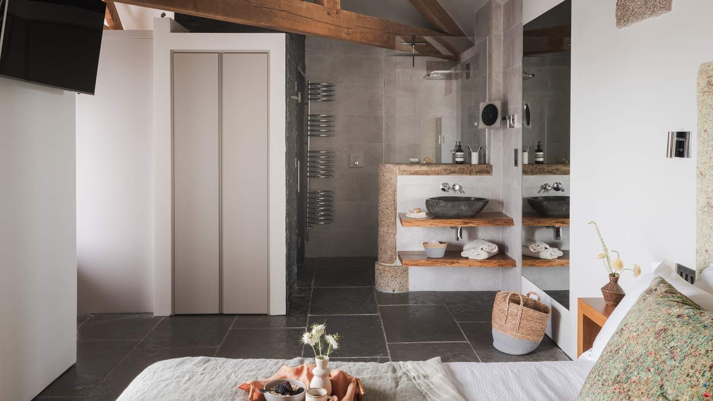 Na drugim końcu przestrzeni mieszkalnej odkryj elegancką kuchnię w delikatnych odcieniach szarości i ciepłego drewna, pięknie uzupełniającą oryginalne cechy wykwintnie przebudowanej stodoły. Sypialnia w Fingers Point zaprasza na niebiańskie sny, z łóżkiem typu king. Wygodny fotel i podnóżek pięknie komponują się z efektownym zagłówkiem, oferując wymarzone miejsce na spokojne poranki z kawą i wciągającą lekturą. Duże drzwi składane prowadzą na patio, zapraszając na zewnątrz w cieplejszych miesiącach. Jest też wspaniały dodatek w postaci klimatyzacji, aby zachować chłód w łagodne letnie noce.