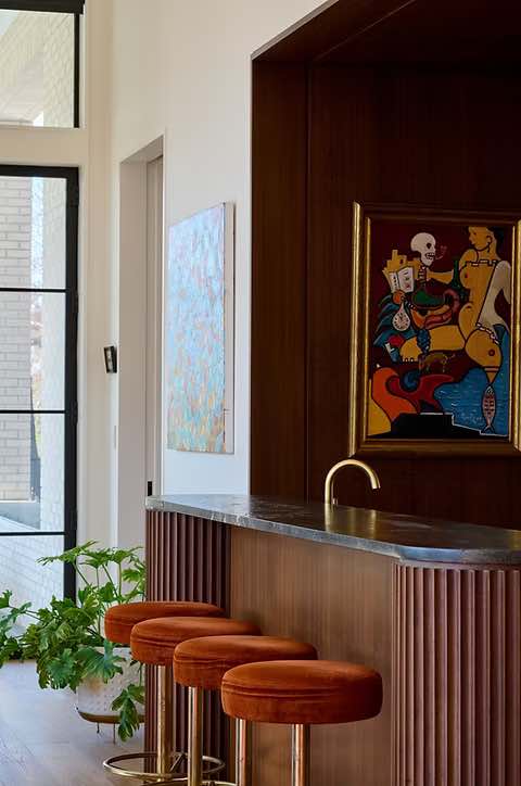 Duże przesuwne drzwi otwierają przestrzeń na kamienny taras i basen, tworząc płynne przejście między wnętrzem a ogrodem. Cały dom zaprojektowano z myślą o codziennym komforcie i naturalnej integracji z otoczeniem – to miejsce, które sprzyja zarówno rodzinnemu życiu, jak i chwilom wyciszenia.