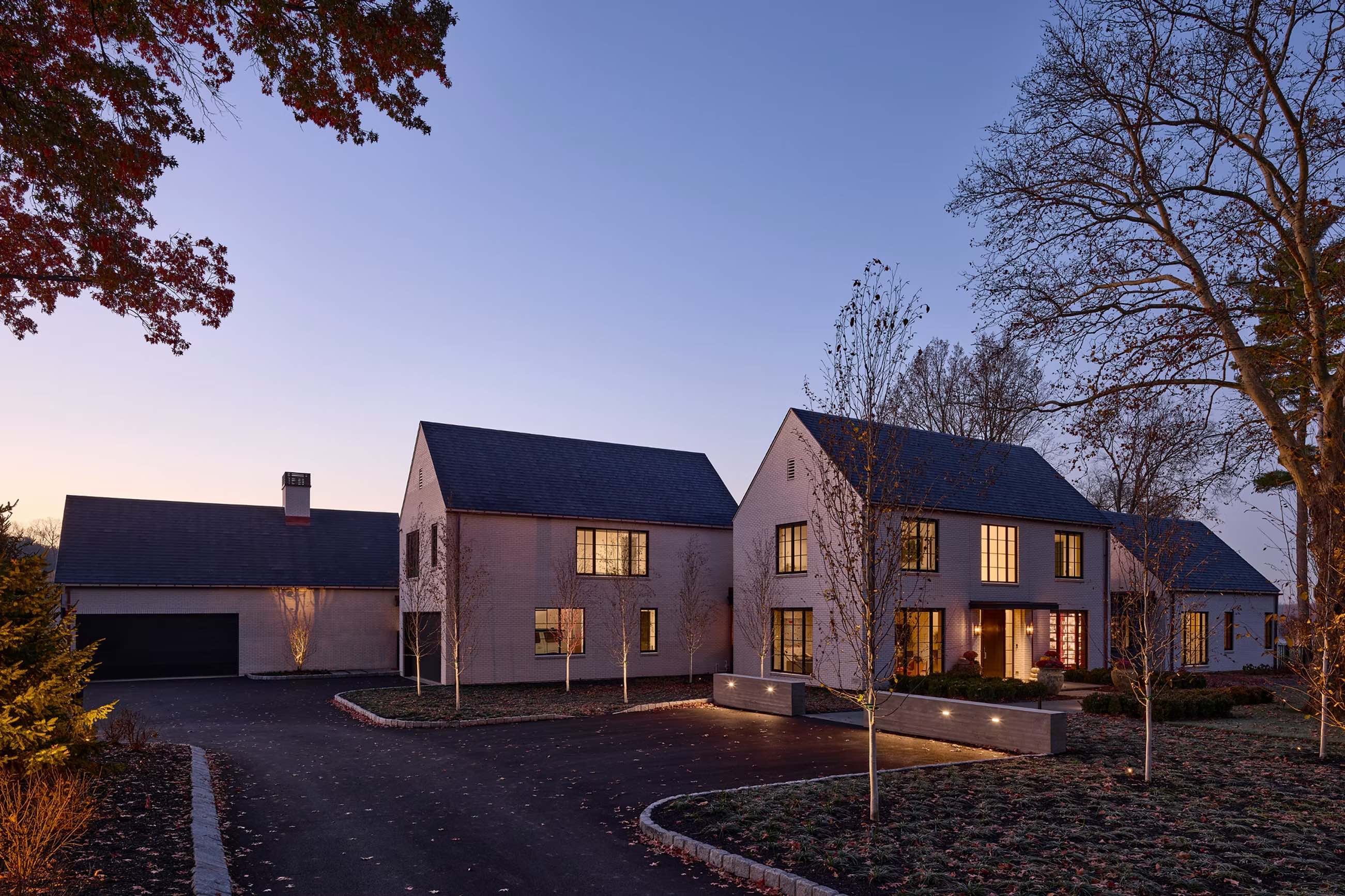 Od strony wejścia dwie najwyższe bryły tworzą ramę dla zielonego dziedzińca, dyskretnie osłaniając wnętrze domu i widok na rzekę. Biała ceglana elewacja, czarne metalowe okna i dach pokryty łupkiem z detalami z miedzi tworzą elegancki, ponadczasowy charakter budynku.