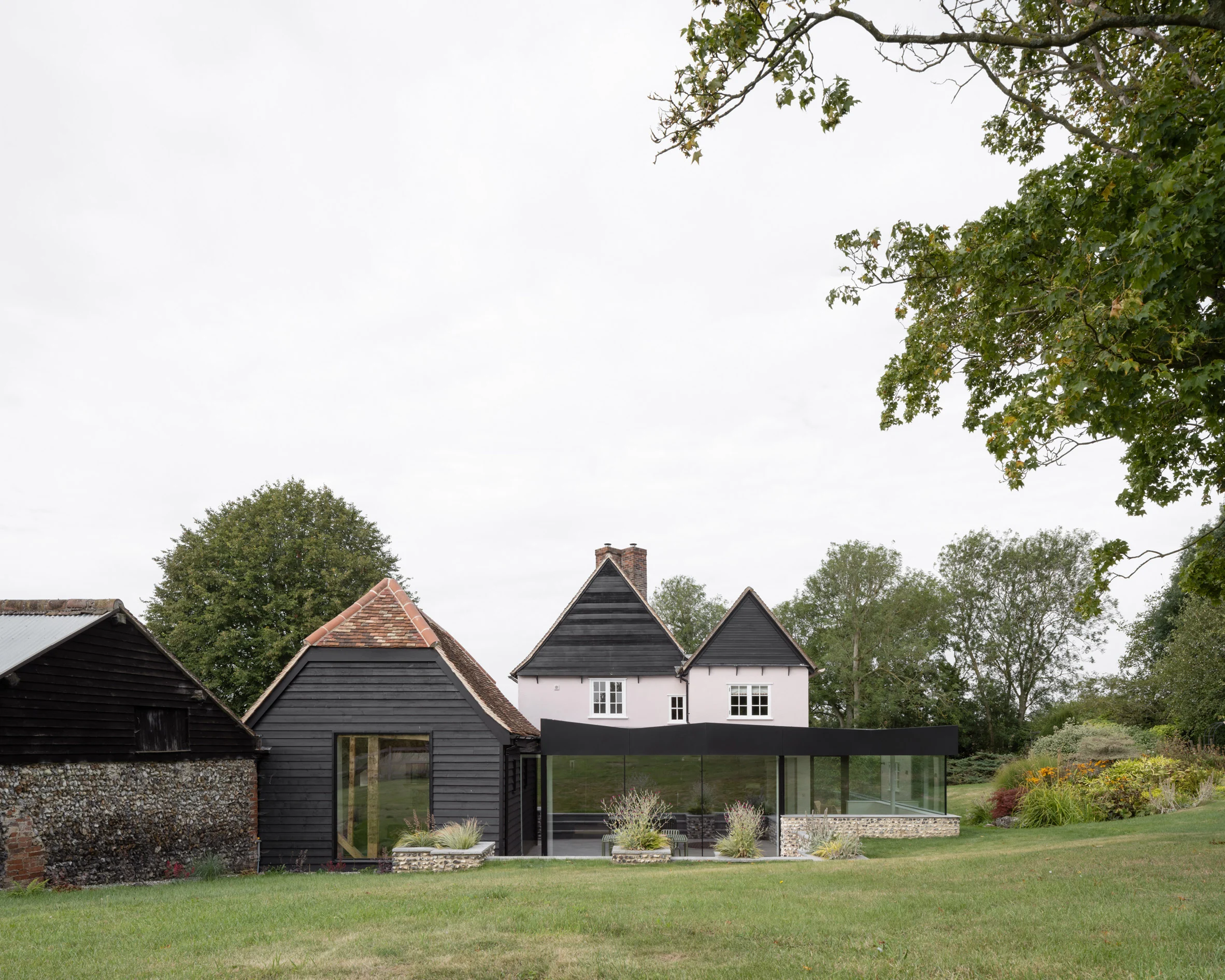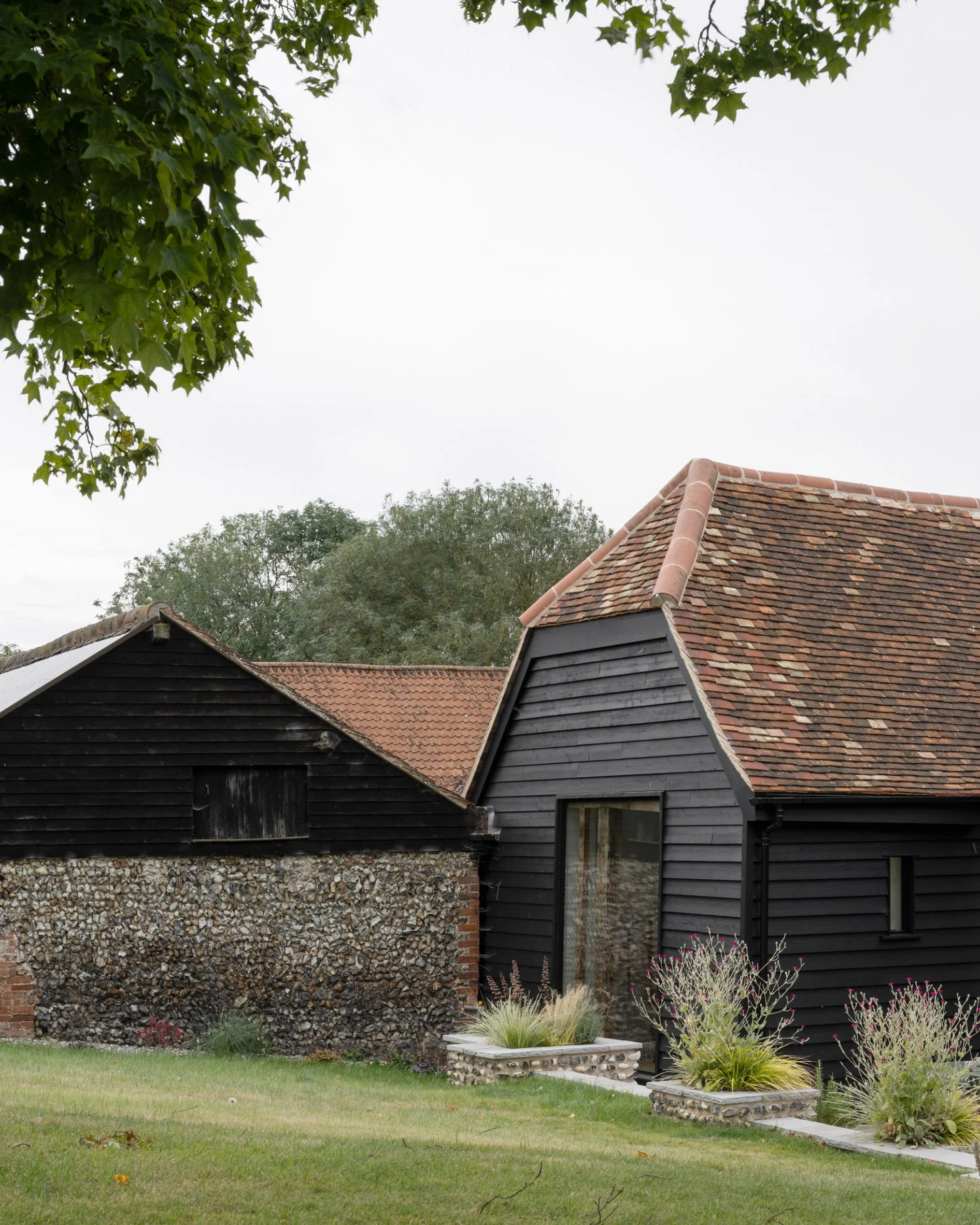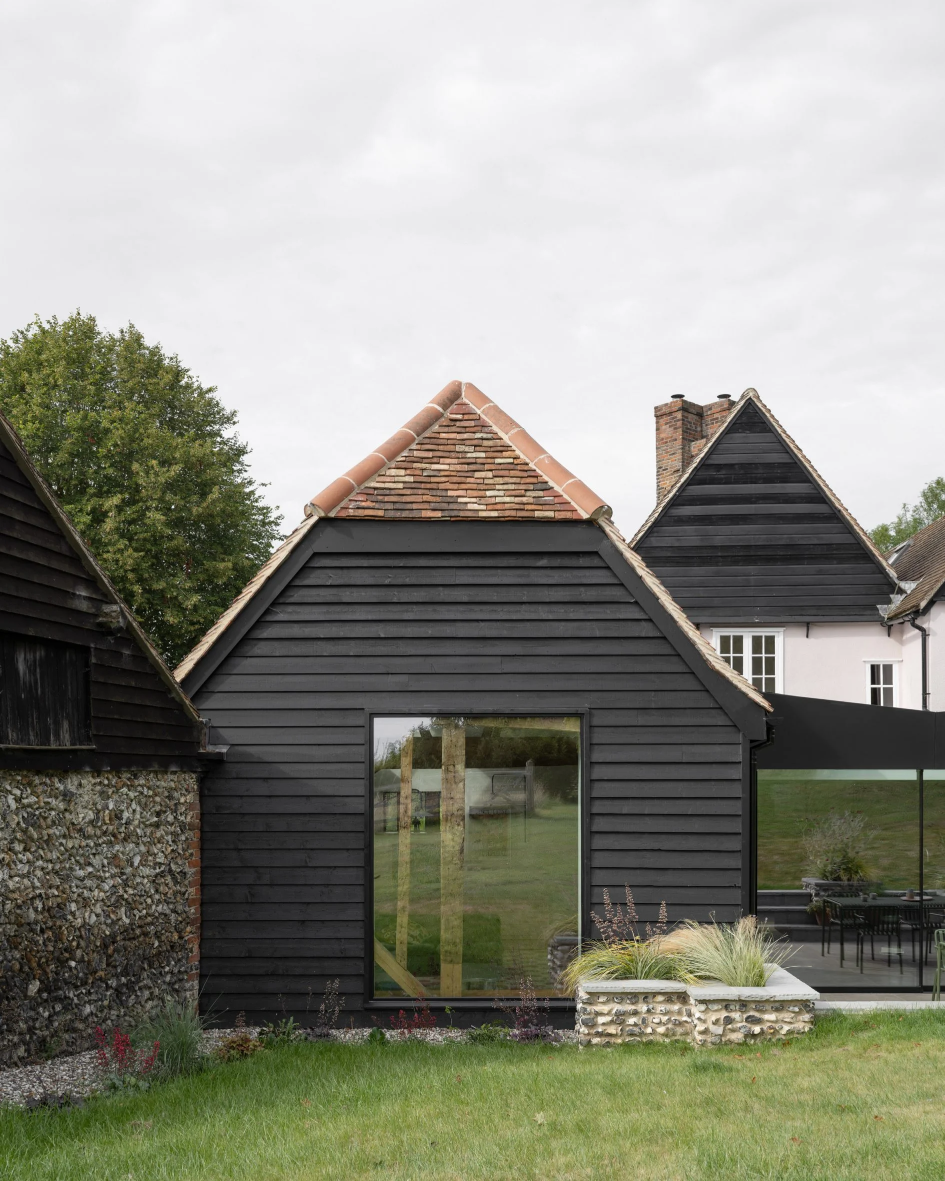 Dodatek o niskim profilu integruje się z otoczeniem za sprawą krzemiennego cokołu i stalowego dachu o geometrycznych kształtach, który odnosi się do gontów na czarnej stodole. Nowa rozbudowa poprawiła również funkcjonalność domu, tworząc płynne przejście między głównym budynkiem a przylegającą stodołą z XVIII wieku. W stodole odsłonięto historyczną konstrukcję drewnianą, dodano nowoczesne przeszklenie z widokiem na ogród i odnowiono elewację z czarnego drewna oraz dach z glinianych płytek.